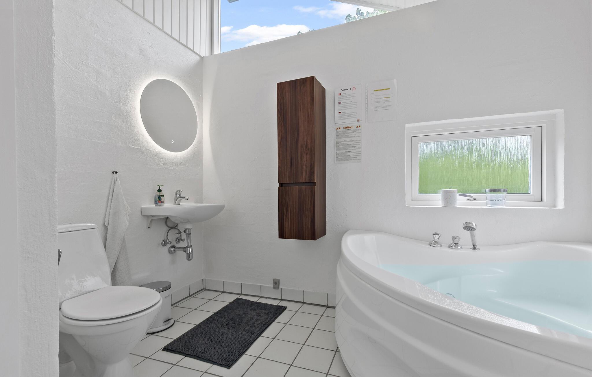 Ved Gjerrild Nordstrand ligger dette velholdte sommerhus med spabad og sauna. I forbindelse med stuen findes der er pænt køkken og udgang til den delvis overdækkede terrasse. På den store grund med en fin græsplæne er der lavet en bålplads, så I kan hygge jer med at lave snobrød.