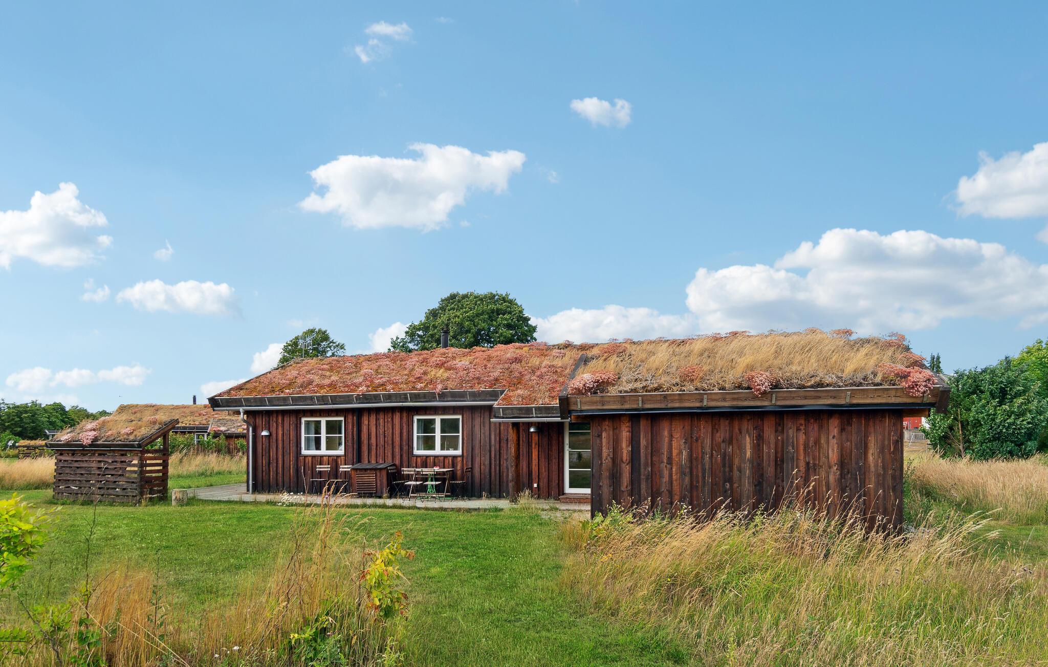 Idyllisk træhus på Djurslands nordkyst med græs på taget, tæt på stranden og naturen, perfekt til afslapning og friluftsliv.