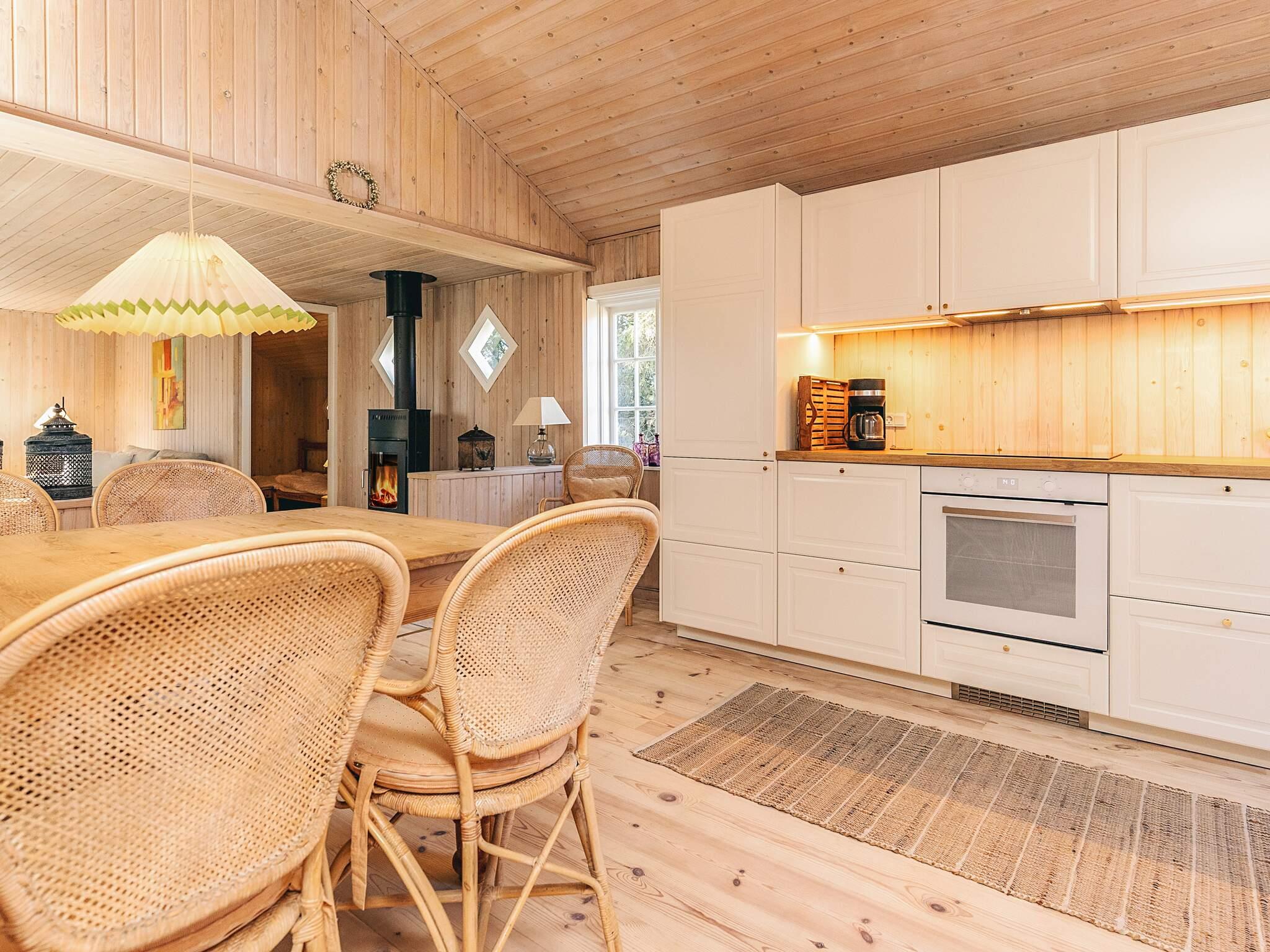 Det fuldt udstyrede køkken indeholder elektrisk komfur, køleskab og kaffemaskine, så det er nemt at tilberede måltider under opholdet. Badeværelset har WC, håndvask og håndbruser, som giver alle nødvendige faciliteter for en bekvem ferie. Elektrisk opvarmning sikrer varme i de køligere måneder, og ferieboligen er smagfuldt møbleret, så den føles hjemlig.