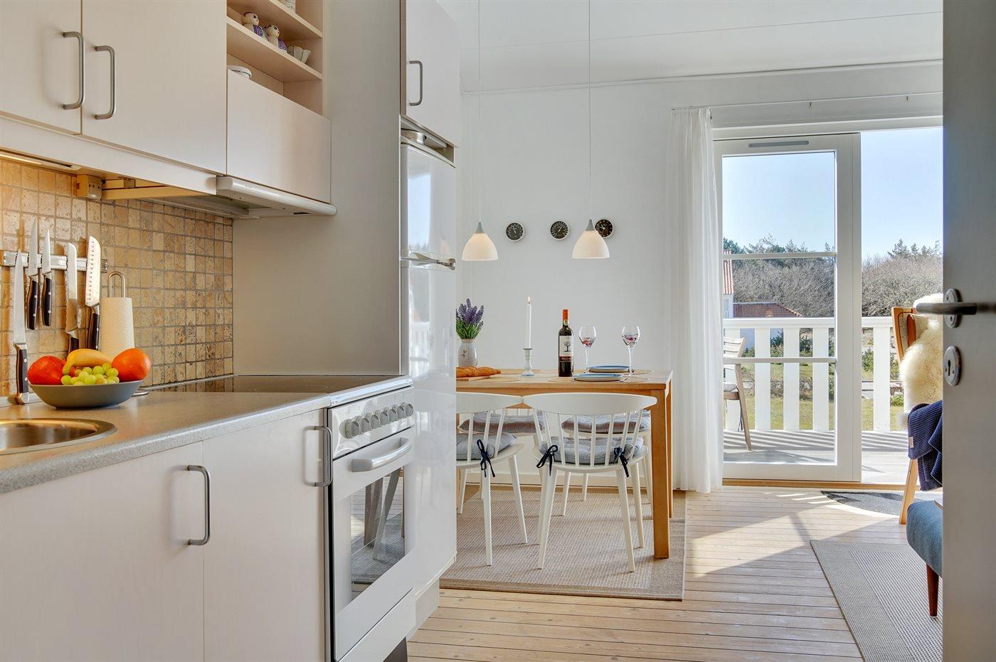 Køkkenet er udstyret med 1 køleskab. Der er 4 keramiske kogeplader, varmluftovn, mikrobølgeovn.