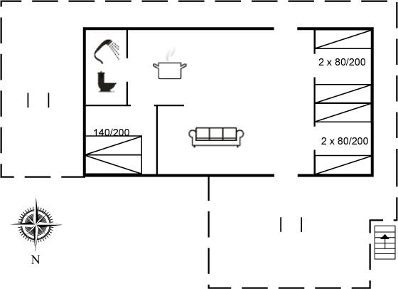 Der er i alt 3 soveværelser. Sovepladserne fordeler sig på: 2 sovepladser i dobbeltseng. 4 sovepladser i enkeltsenge.