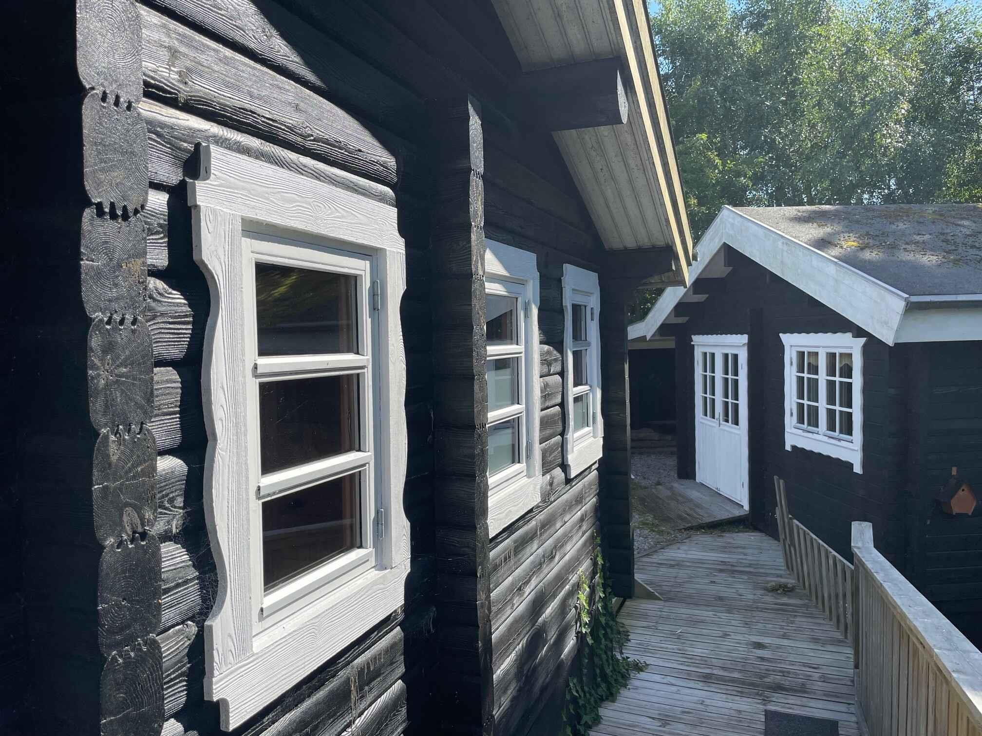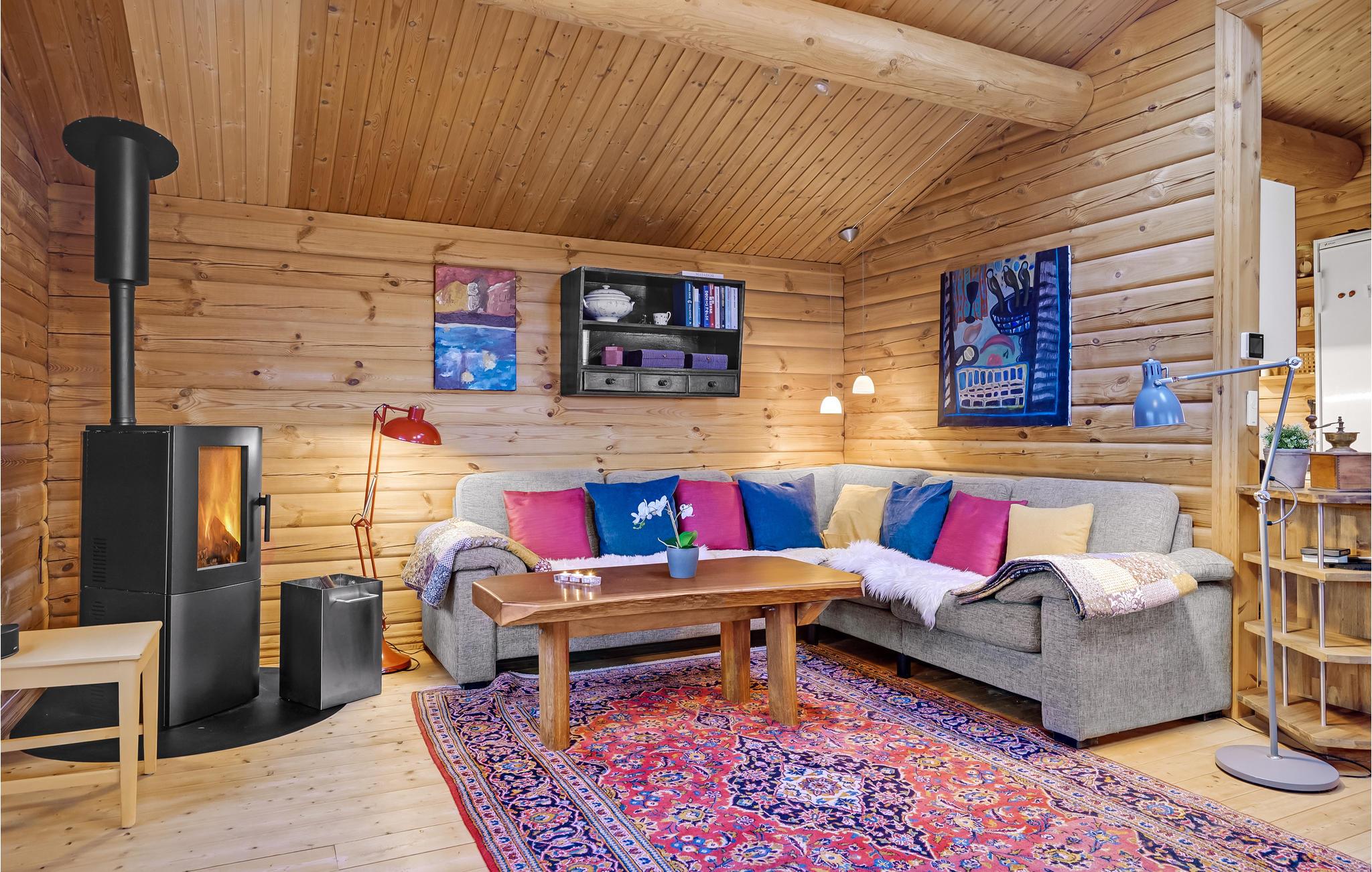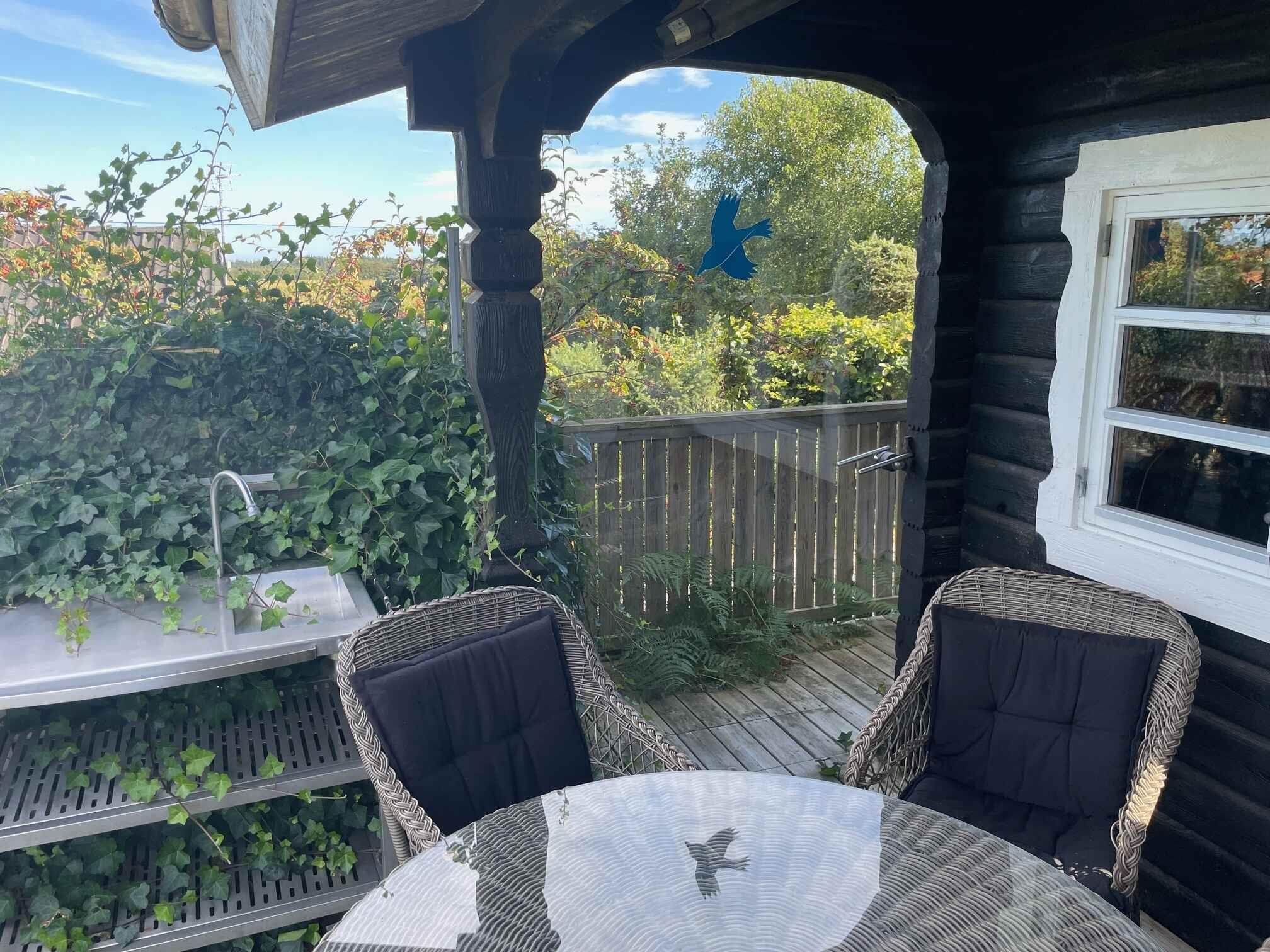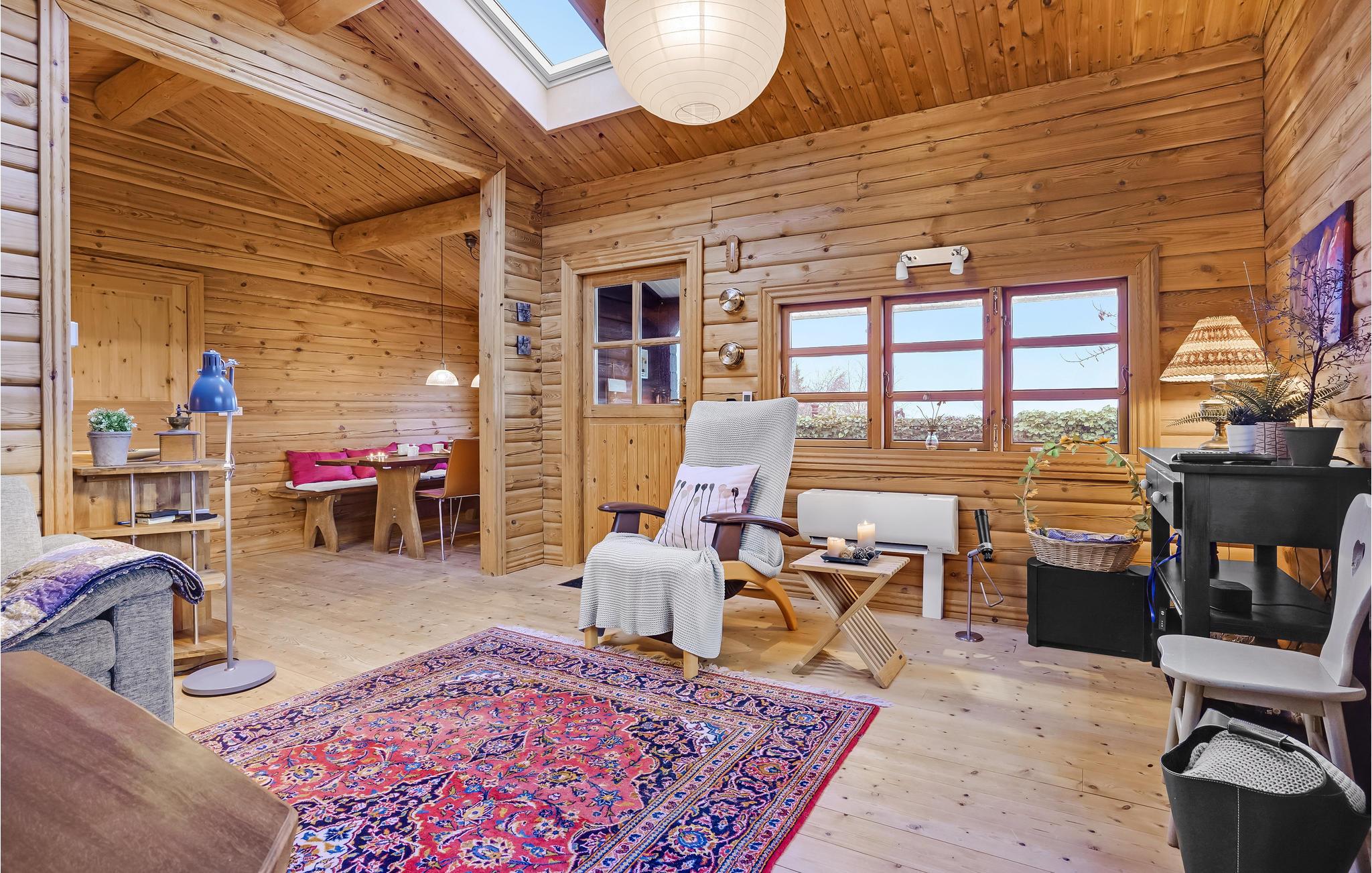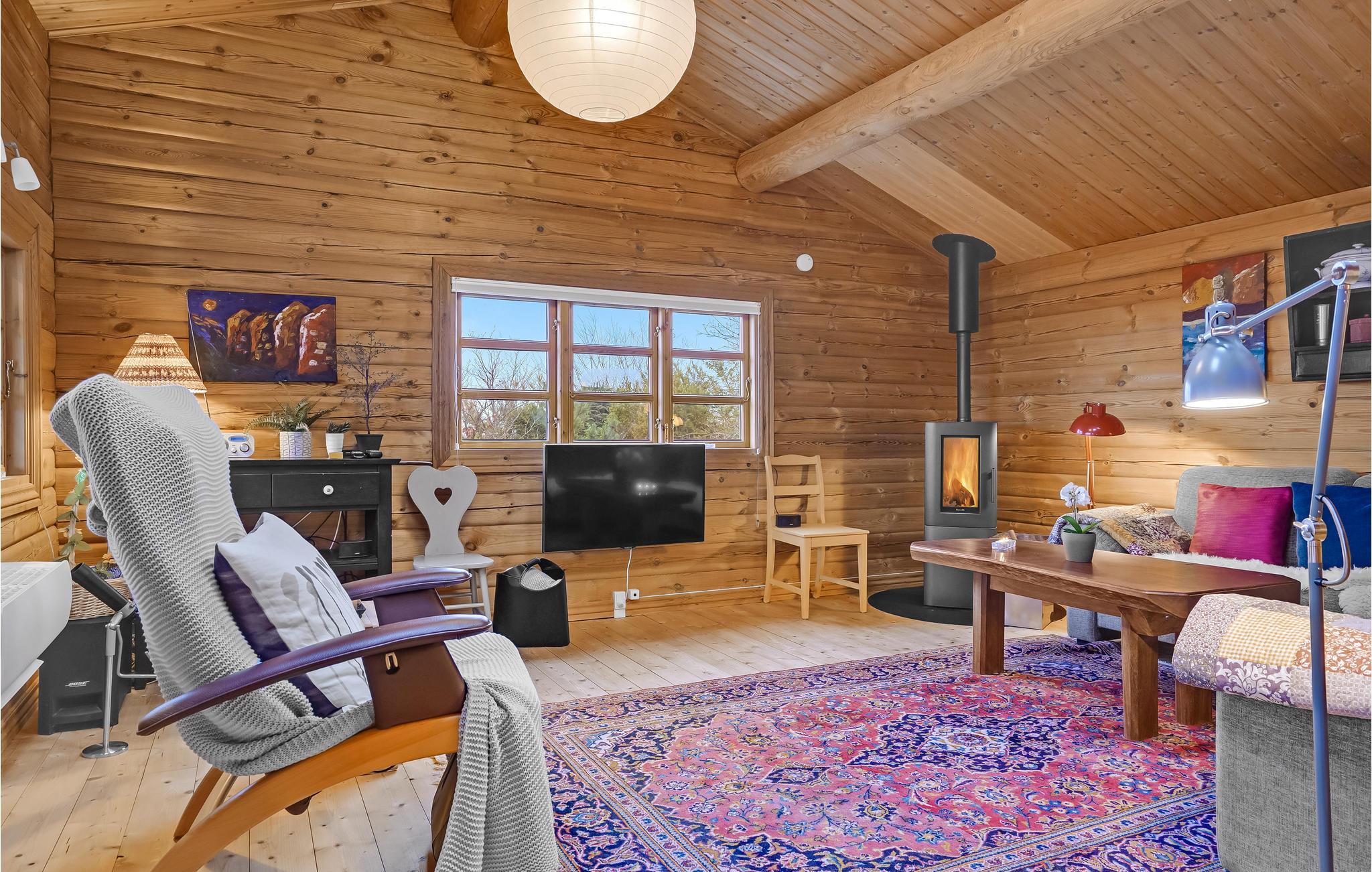 Hyggeligt bjælkehus med panoramaudsigt ved stranden