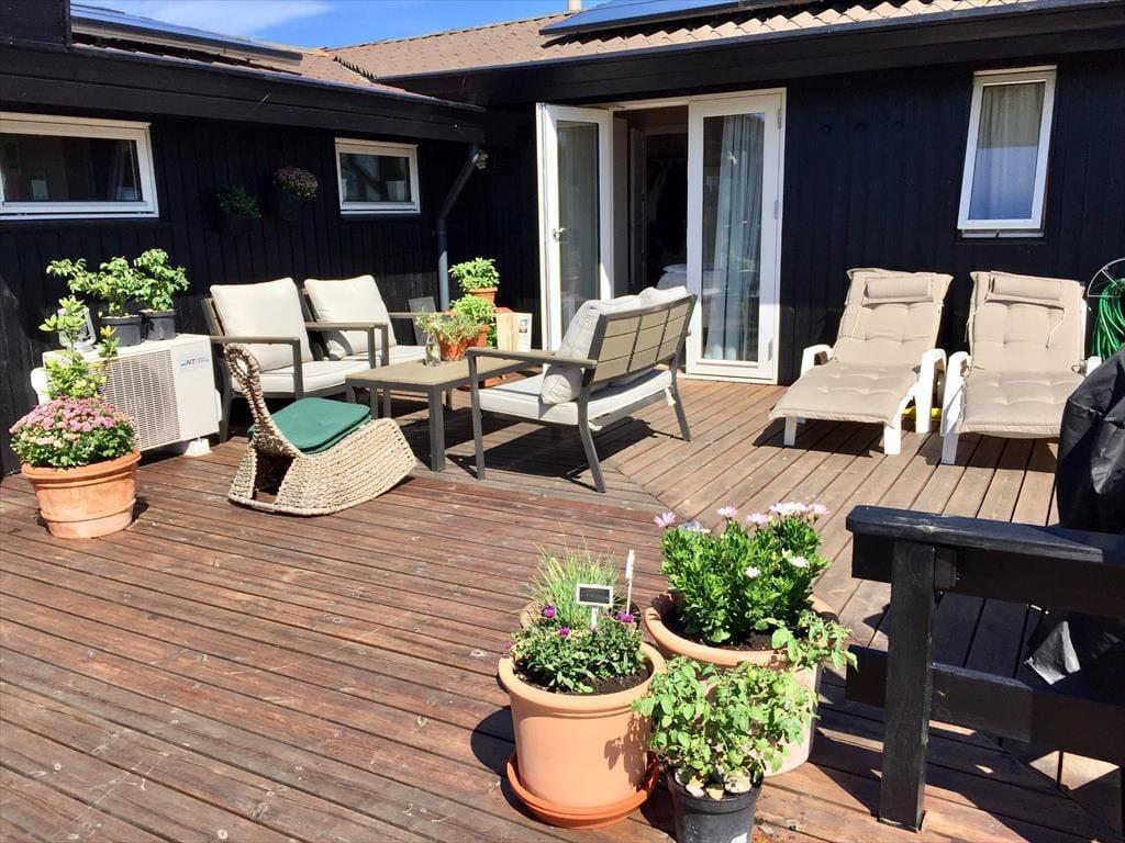 Fra den skønne terrasse kan I både nyde de dejlige sommeraftener og høre havets brusen, hvis ikke I bare foretrækker at slikke solskin, mens dagens aktiviteter planlægges. Husk også at skylle dig af under udebruseren efter en dejlig dag på stranden. I Havnebyen, nær sommerhuset, er der en lille fiskehandel, med et fantastisk udvalg af friskfangede fisk. Vi kan bestemt også anbefale at prøve den lækre buffet, hvis ikke I selv vil tilberede middagen. Et besøg på museet, der fortæller historien om de gode gamle dage, hvor man landede tun i massevis på Sj. Odde, kan også anbefales.