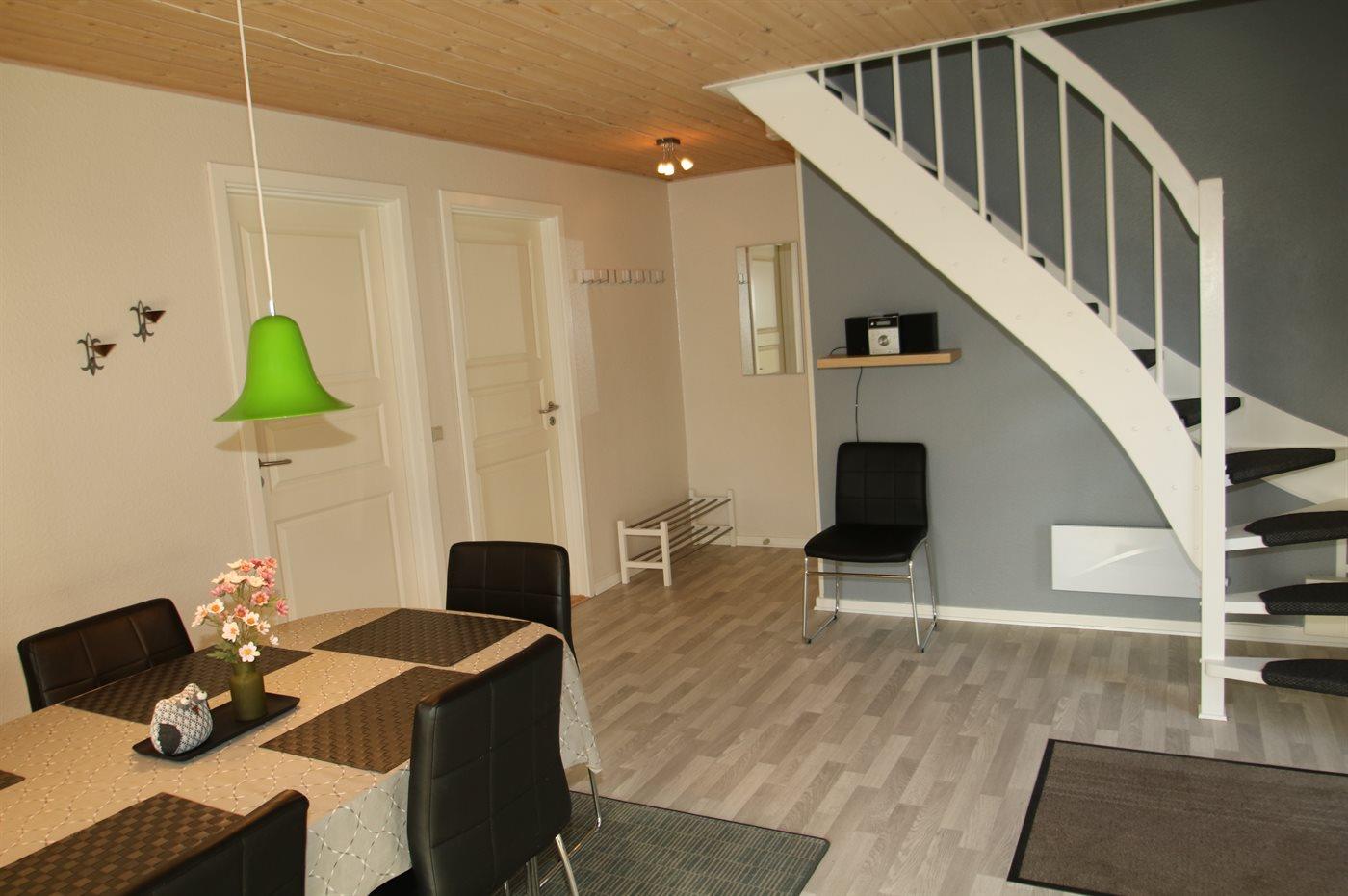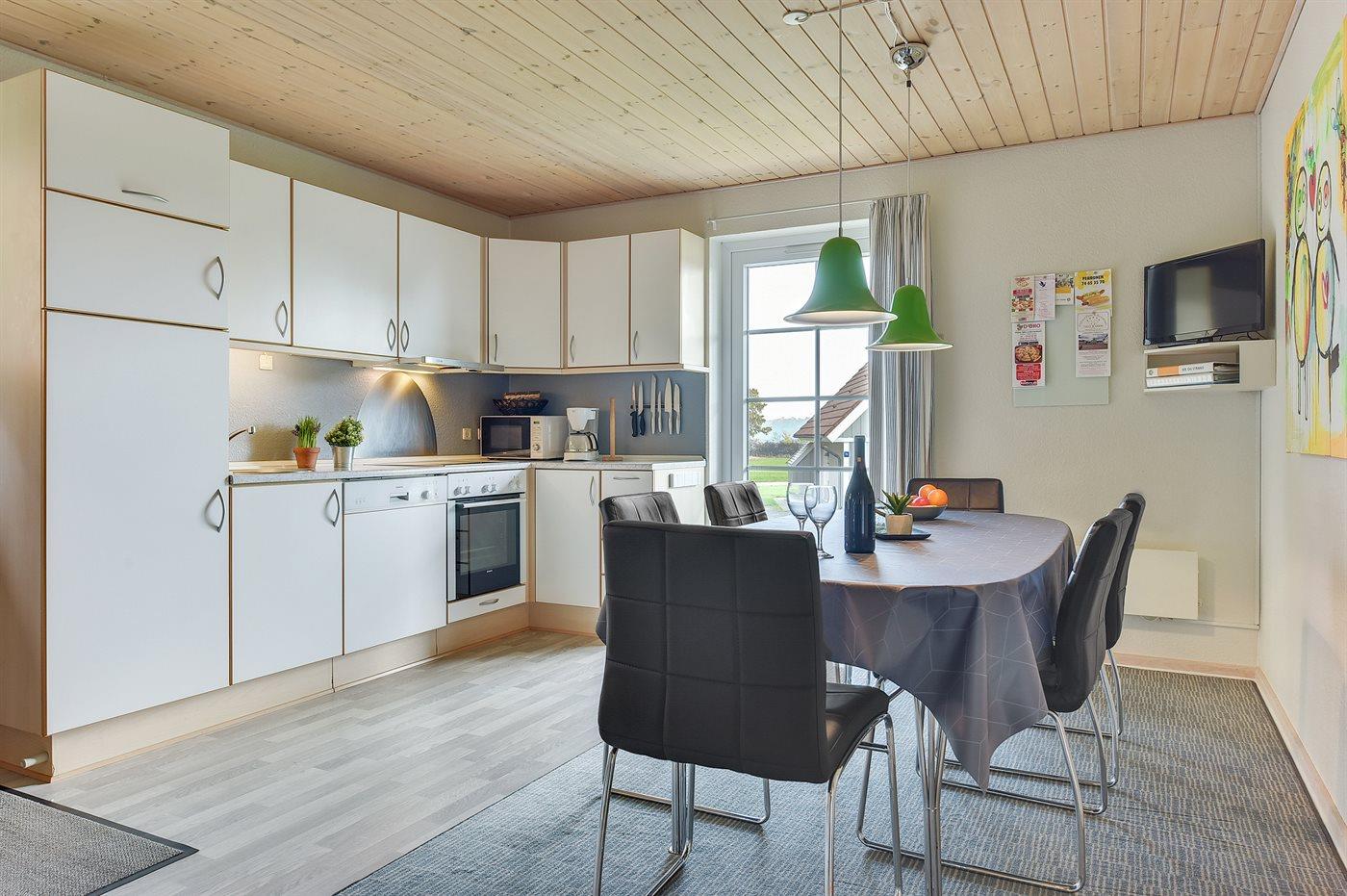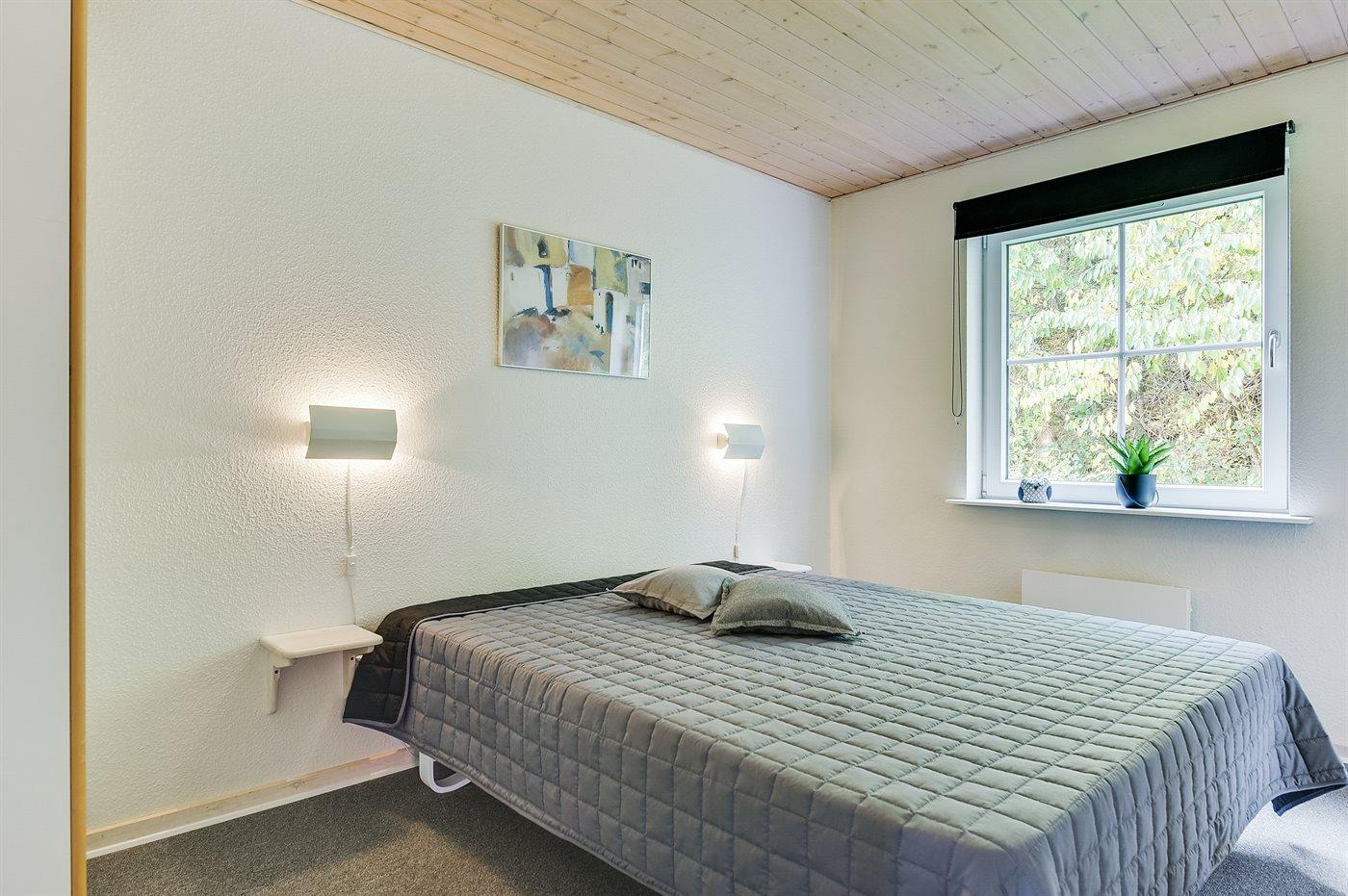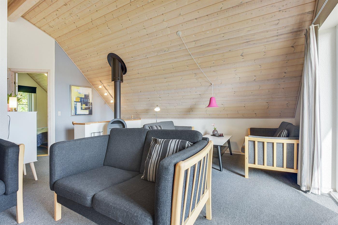 I stueetagen er der dels trægulve, dels flisegulv med gulvvarme. Gulvtæpper i soveværelserne. På 1. sal er der gulvtæpper. Trælofter og lyse, malede vægge overalt. I stueetagen er der et dejligt badeværelse med bruseniche, 2-pers. spa og sauna. Lækkert køkken, der er kombineret med spisestuen, med bl.a. opvaskemaskine, mikrobølgeovn, varmluftovn og komfur med keramiske kogeplader. 2 soveværelser med dobbeltseng. Fra såvel køkken som fra det ene soveværelse er der udgang til den overdækkede terrasse. Midt i huset fører en trappe op til 1. sal, hvor der er en velindrettet opholdsstue med udgang til balkon med en vidunderlig udsigt over vandet. Opholdsstuen er bl.a. indrettet med brændeovn, TV tilsluttet fællesantenne, video og stereoanlæg med CD-afspiller. På 1. sal findes der endvidere gæstetoilet med vaskemaskine og tørretumbler samt 2 soveværelser med dobbeltseng. Til husets udstyr hører også ekstra TV med Playstation2, barneseng og høj barnestol. Der er endvidere installeret stik til opladning af elbil. Trådløs ADSL-internetforbindelse på stedet (egen computer skal medbringes).