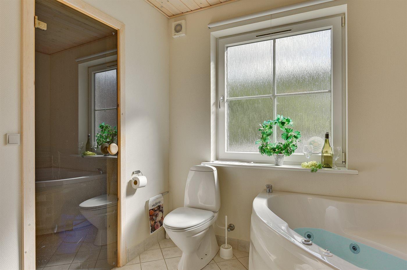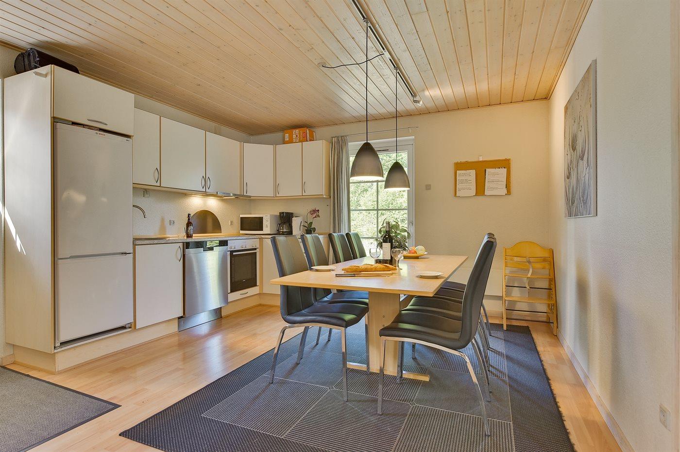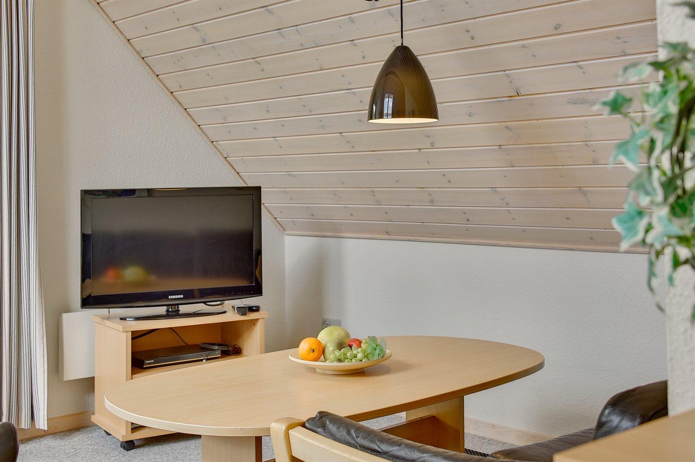 I stueetagen er der dels trægulve, dels flisegulv med gulvvarme. Gulvtæpper i soveværelserne og på 1. sal. Trælofter og lyse, malede vægge overalt. Dejligt badeværelse med bruseniche, 2-pers. spa samt adgang til husets sauna i stueetagen. Køkkenet er kombineret med spisestuen og bl.a. udstyret med opvaskemaskine, mikrobølgeovn, fryser, varmluftovn og komfur med keramiske kogeplader. 2 soveværelser med dobbeltseng. Fra såvel køkken som fra det ene soveværelse er der udgang til den overdækkede terrasse. Midt i huset fører en trappe op til 1. sal med en velindrettet og hyggelig opholdsstue med ovenlysvinduer og udgang til balkon. Opholdsstuen er bl.a. indrettet med brændeovn, TV (digital kabel-TV), DVD-afspiller og stereoanlæg. Gæstetoilet med vaskemaskine og tørretumbler. Endvidere findes der yderligere 2 soveværelser med dobbeltseng. Af yderligere udstyr kan høj barnestol nævnes.