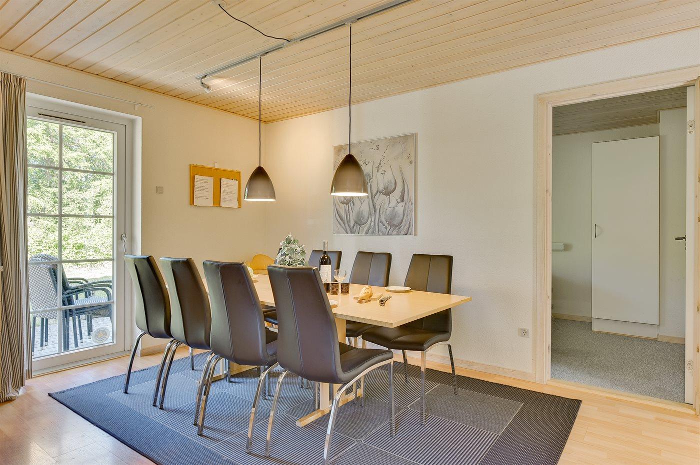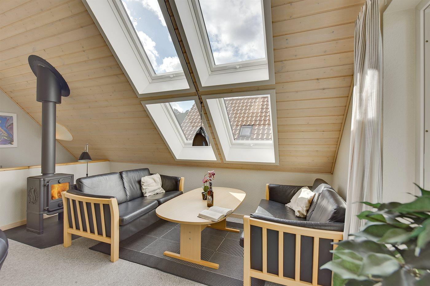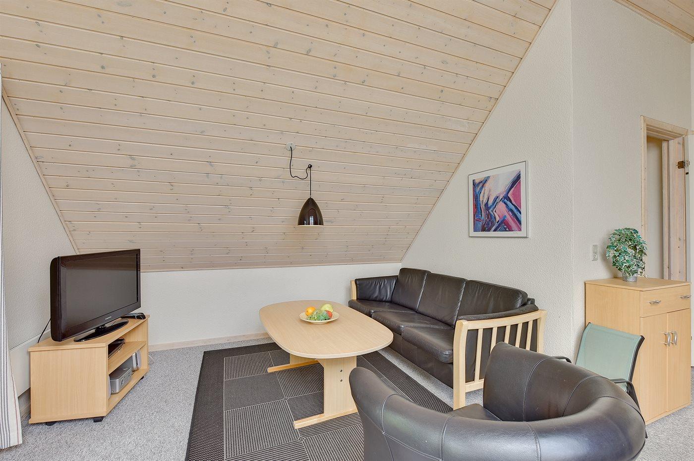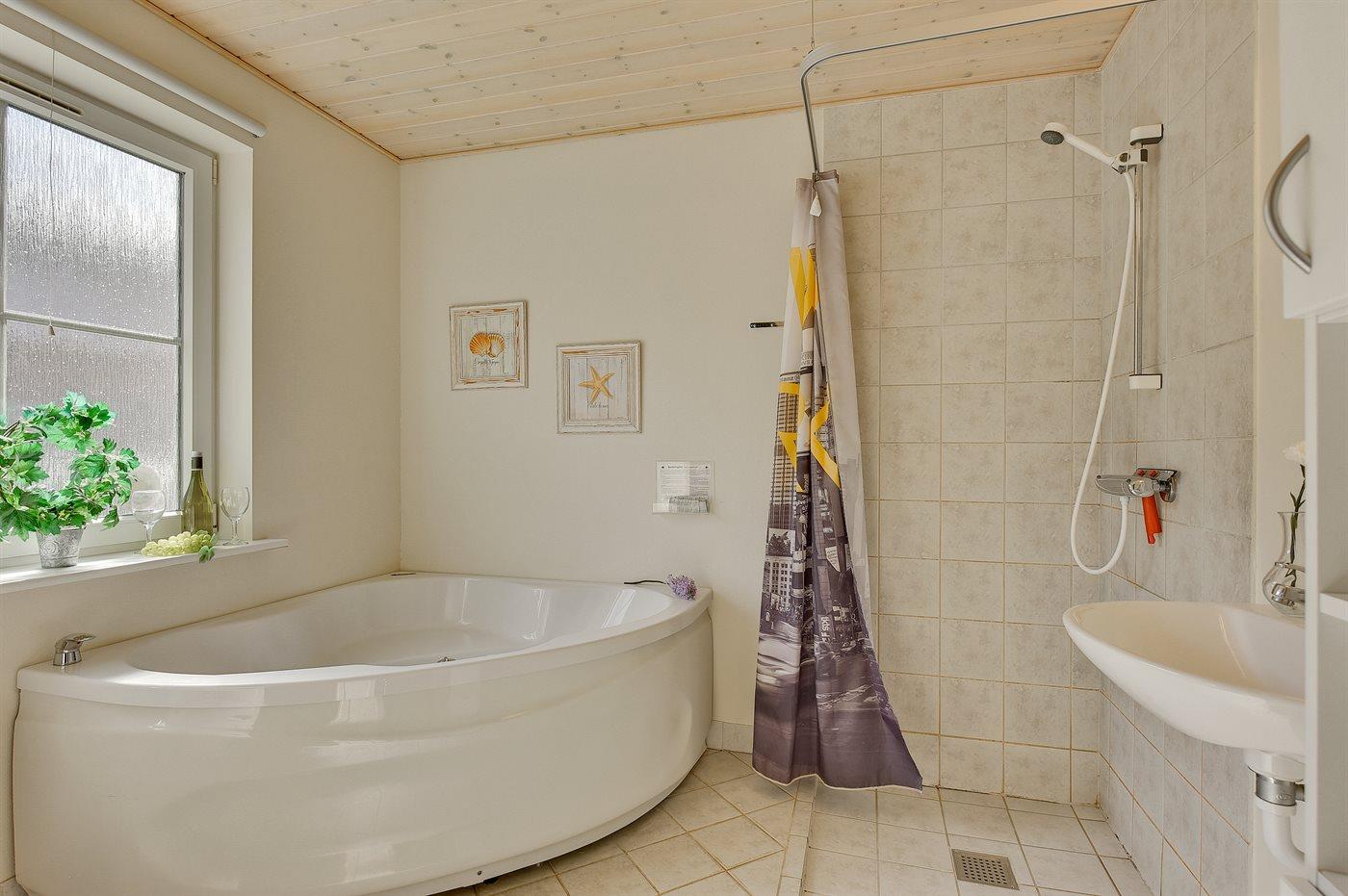 I stueetagen er der dels trægulve, dels flisegulv med gulvvarme. Gulvtæpper i soveværelserne og på 1. sal. Trælofter og lyse, malede vægge overalt. Dejligt badeværelse med bruseniche, 2-pers. spa samt adgang til husets sauna i stueetagen. Køkkenet er kombineret med spisestuen og bl.a. udstyret med opvaskemaskine, mikrobølgeovn, fryser, varmluftovn og komfur med keramiske kogeplader. 2 soveværelser med dobbeltseng. Fra såvel køkken som fra det ene soveværelse er der udgang til den overdækkede terrasse. Midt i huset fører en trappe op til 1. sal med en velindrettet og hyggelig opholdsstue med ovenlysvinduer og udgang til balkon. Opholdsstuen er bl.a. indrettet med brændeovn, TV (digital kabel-TV), DVD-afspiller og stereoanlæg. Gæstetoilet med vaskemaskine og tørretumbler. Endvidere findes der yderligere 2 soveværelser med dobbeltseng. Af yderligere udstyr kan høj barnestol nævnes.