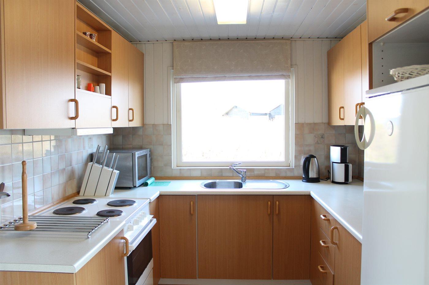 Køkkenet er udstyret med 1 køleskab. Der er 4 elkogeplader, varmluftovn.