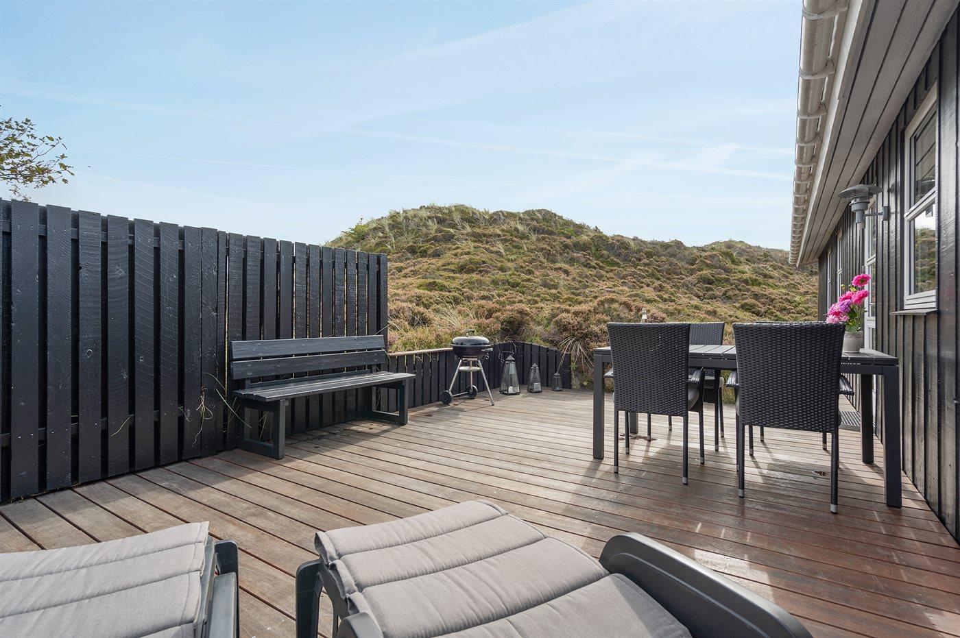 Til ferieboligen hører et eksklusivt 80 m² åbent sammenhængende og ugeneret terrasseareal, 27 m² mod øst, 30 m² mod syd samt 23 m² mod vest. Heraf er der 16 m² overdækket terrasse med direkte adgang fra stuen mod syd. I redskabsrum findes vaskemaskine, tørretumbler, brænde depot og grilludstyr. Lige udenfor forefindes tørresnor. Terrassemøbler består af 3 borde, 2 parasoller, 8 stole (stabelbare), 6 stole (fem-pos.), 2 bænke samt 4 solvogne.