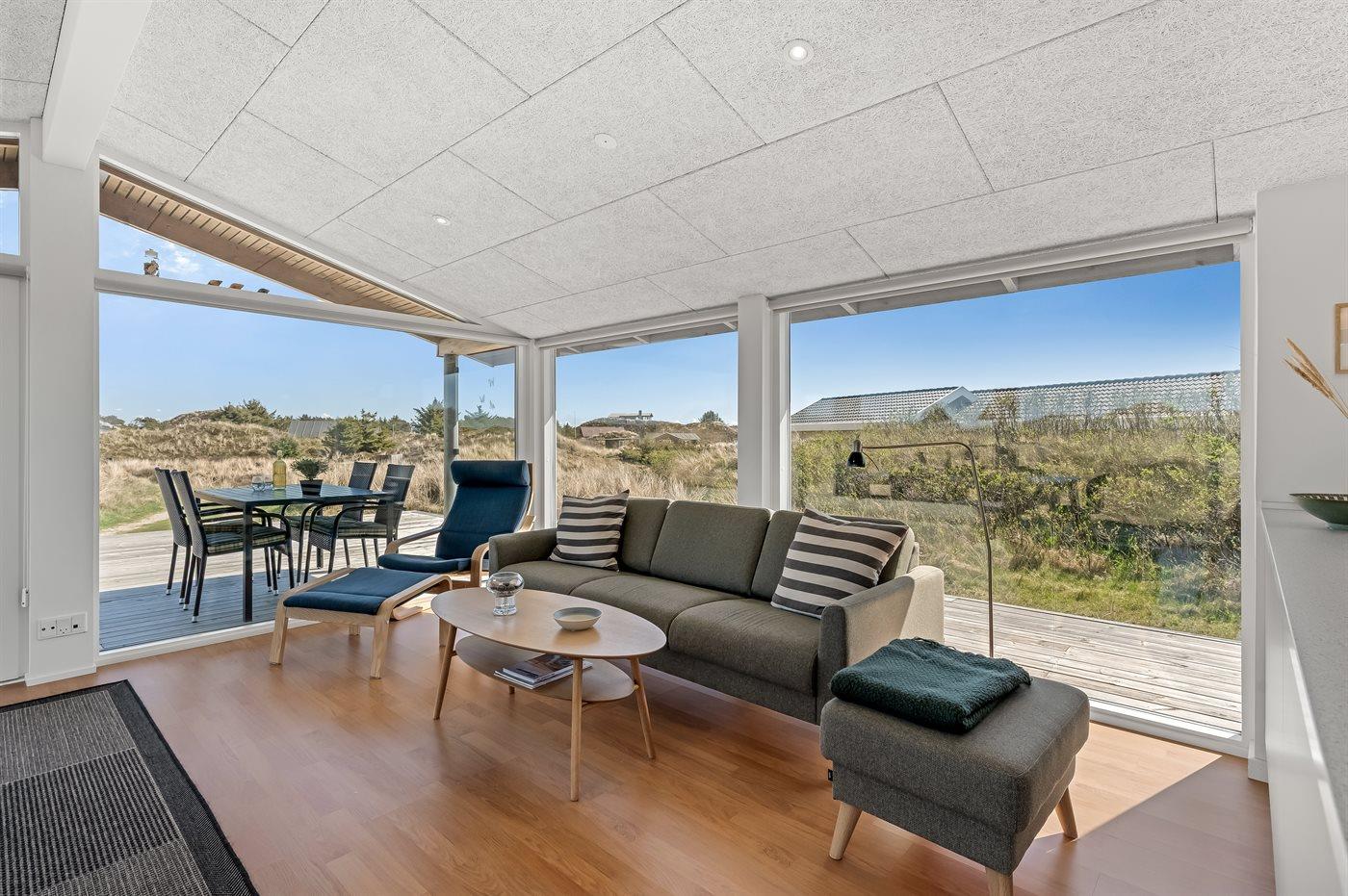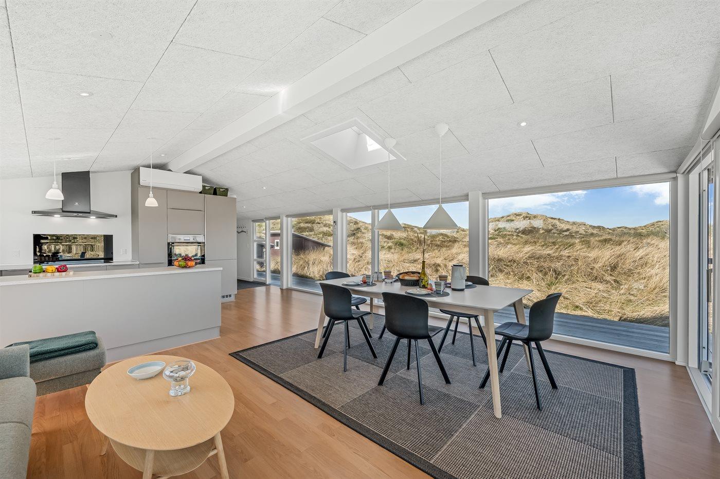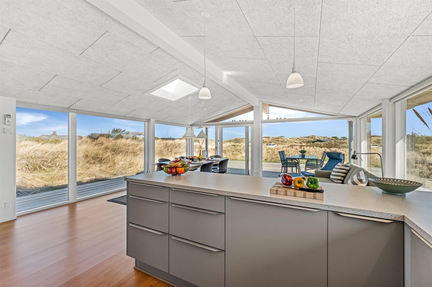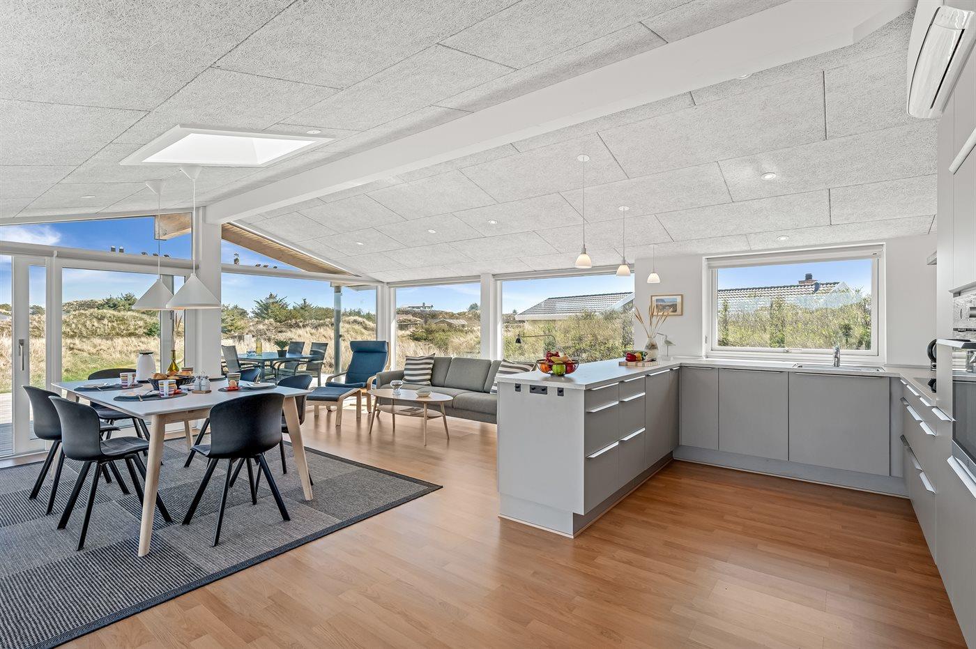 Dette lyse og velholdte sommerhus ligger på en stor naturgrund, midt i Grærups storslåede grønne klitlandskab. Det mærkes især i husets køkken-alrum, hvor de mange vinduer fra gulv til loft giver følelsen af at være placeret lige midt i naturen.