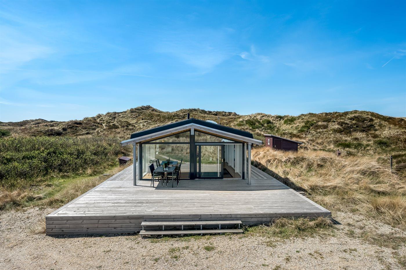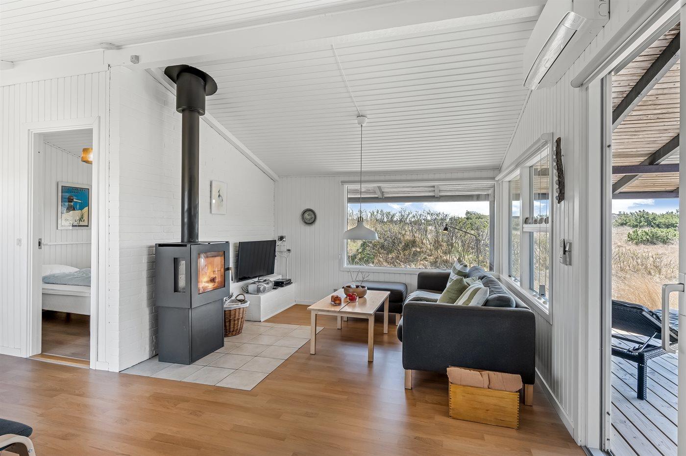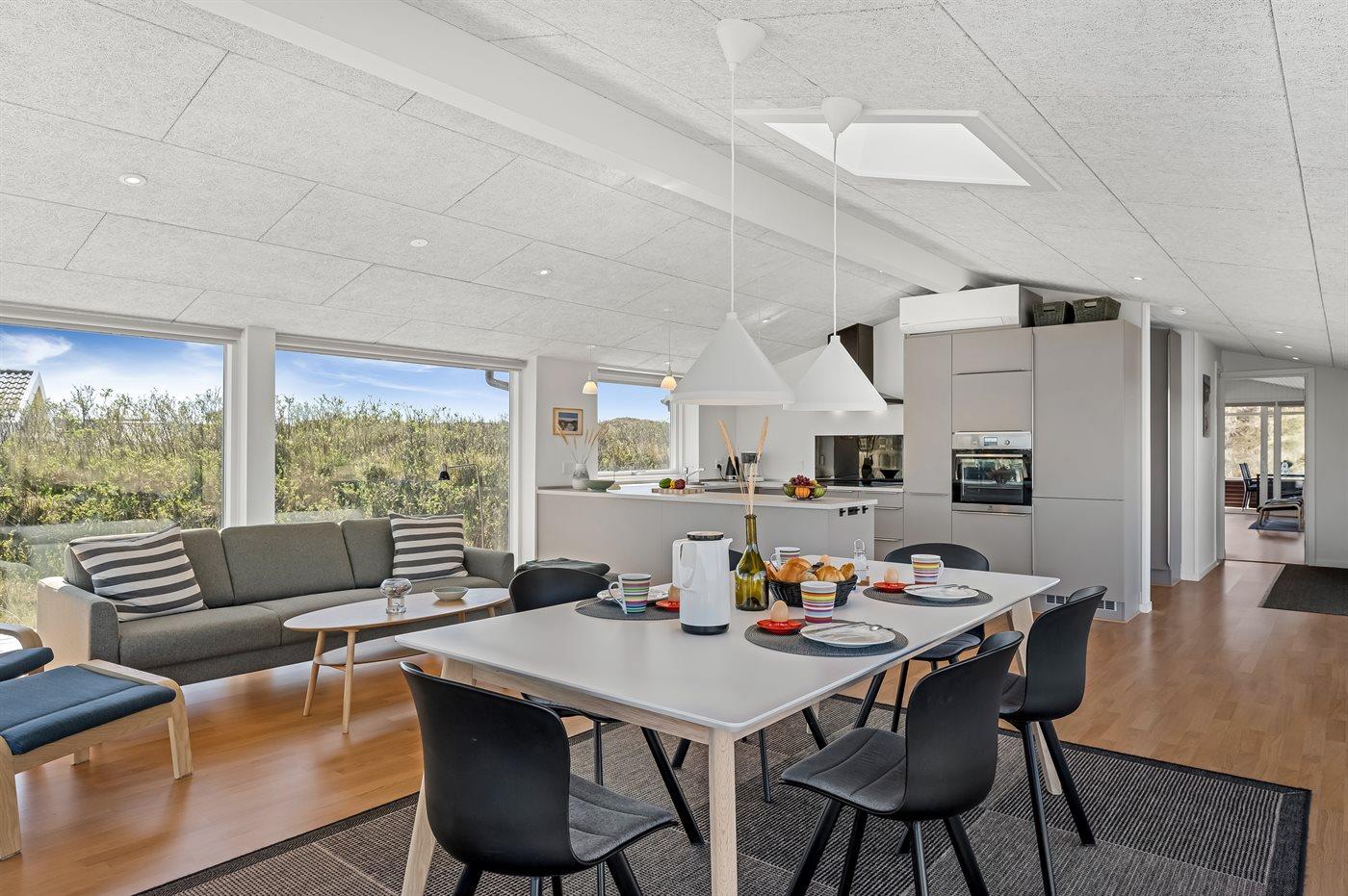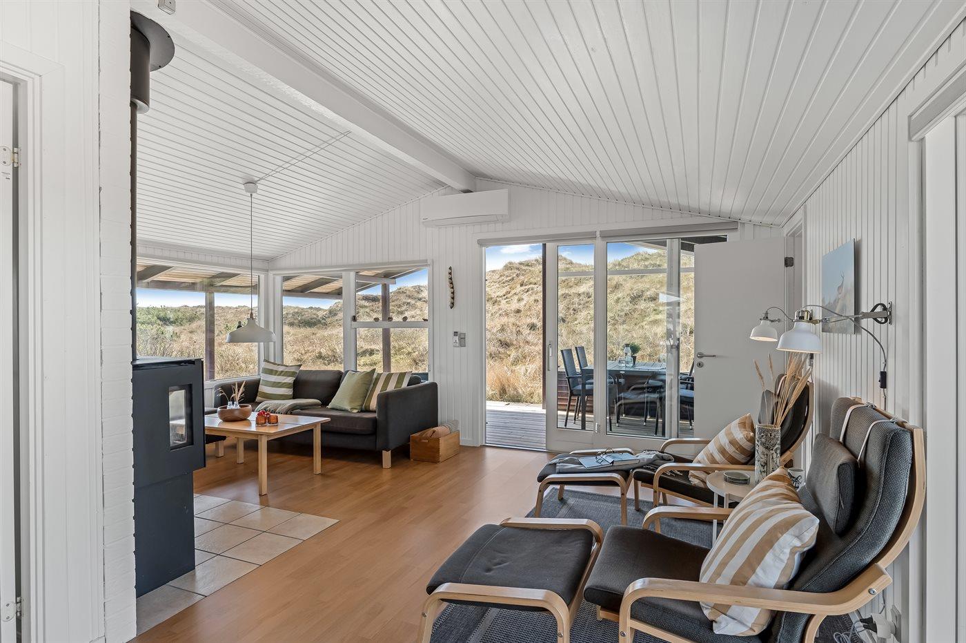 Dette lyse og velholdte sommerhus ligger på en stor naturgrund, midt i Grærups storslåede grønne klitlandskab. Det mærkes især i husets køkken-alrum, hvor de mange vinduer fra gulv til loft giver følelsen af at være placeret lige midt i naturen.