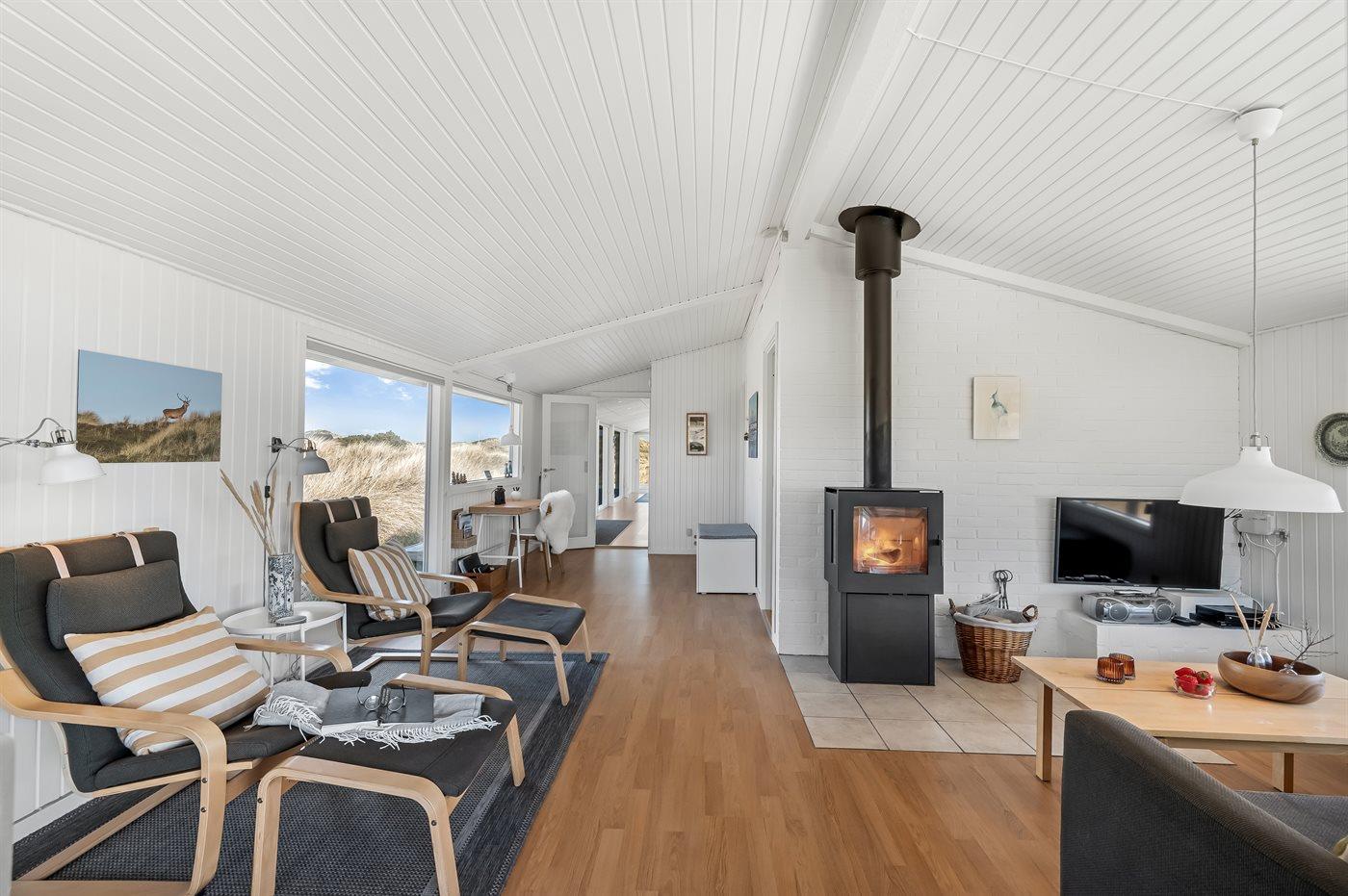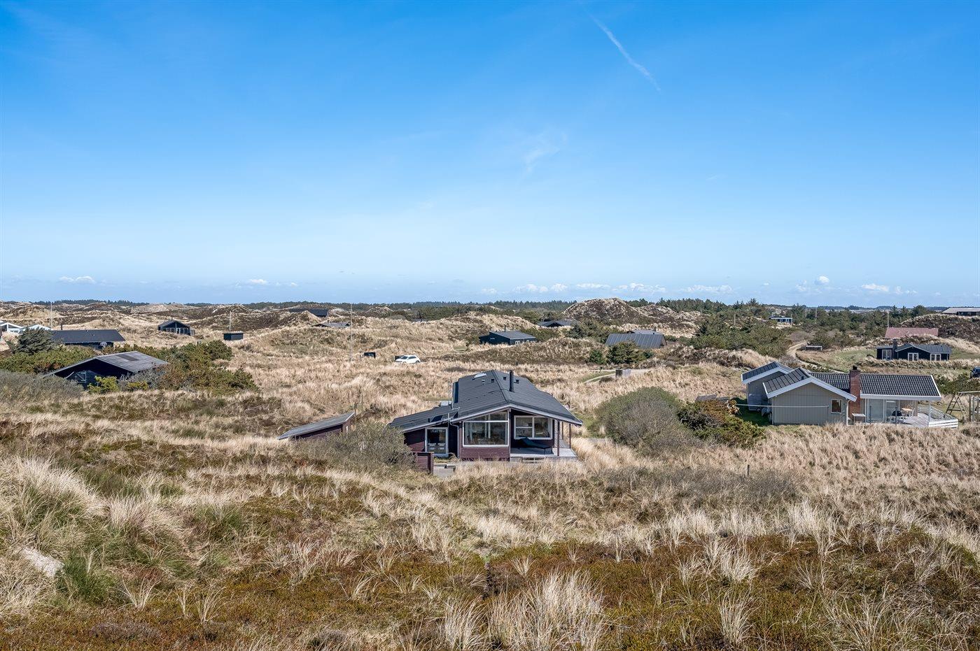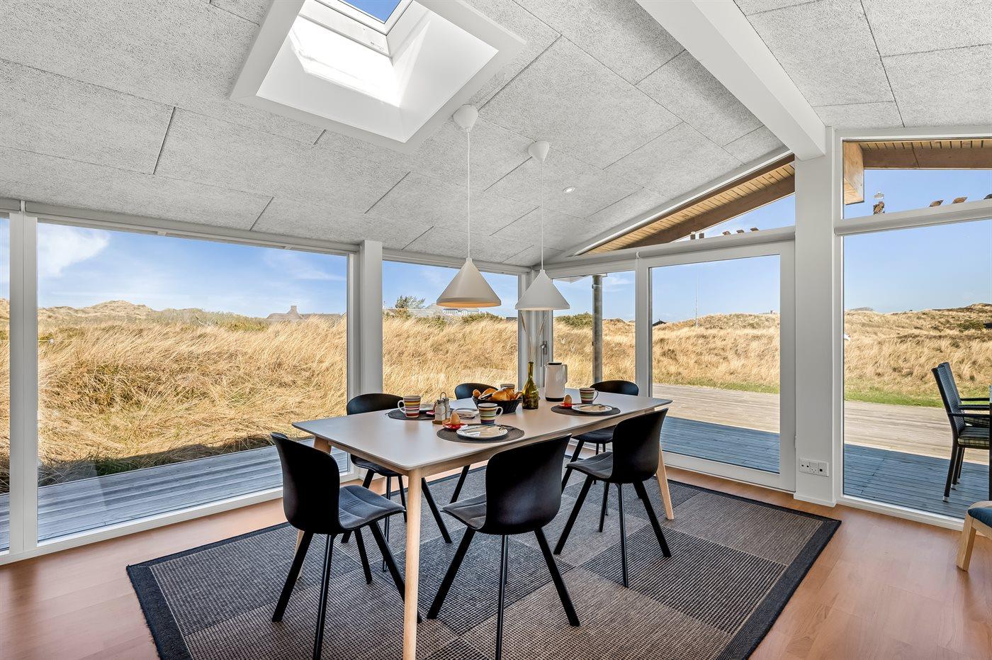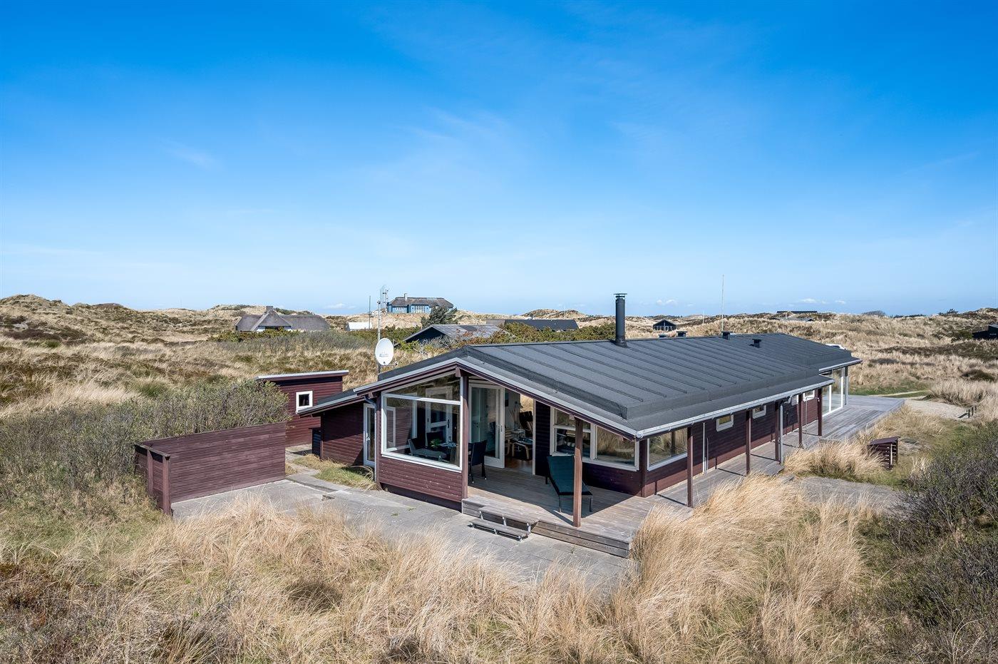 Dette lyse og velholdte sommerhus ligger på en stor naturgrund, midt i Grærups storslåede grønne klitlandskab. Det mærkes især i husets køkken-alrum, hvor de mange vinduer fra gulv til loft giver følelsen af at være placeret lige midt i naturen.