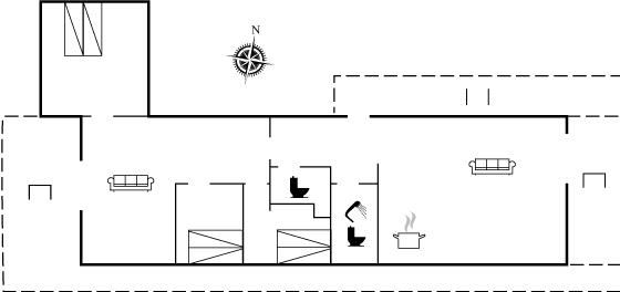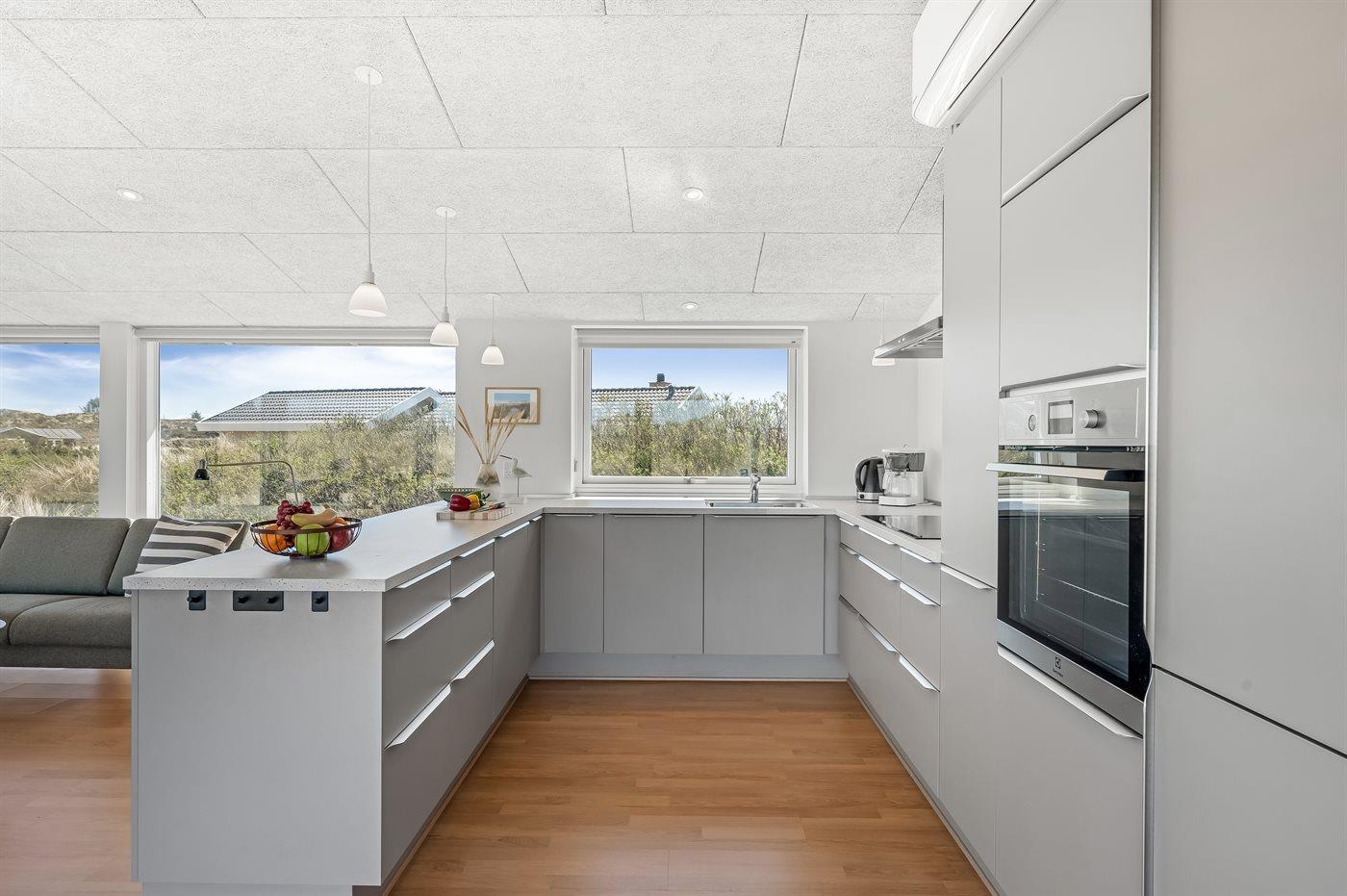 Køkkenet er udstyret med 1 køleskab (168 L). Der er 5 induktionskogeplader, varmluftovn, mikrobølgeovn samt opvaskemaskine.