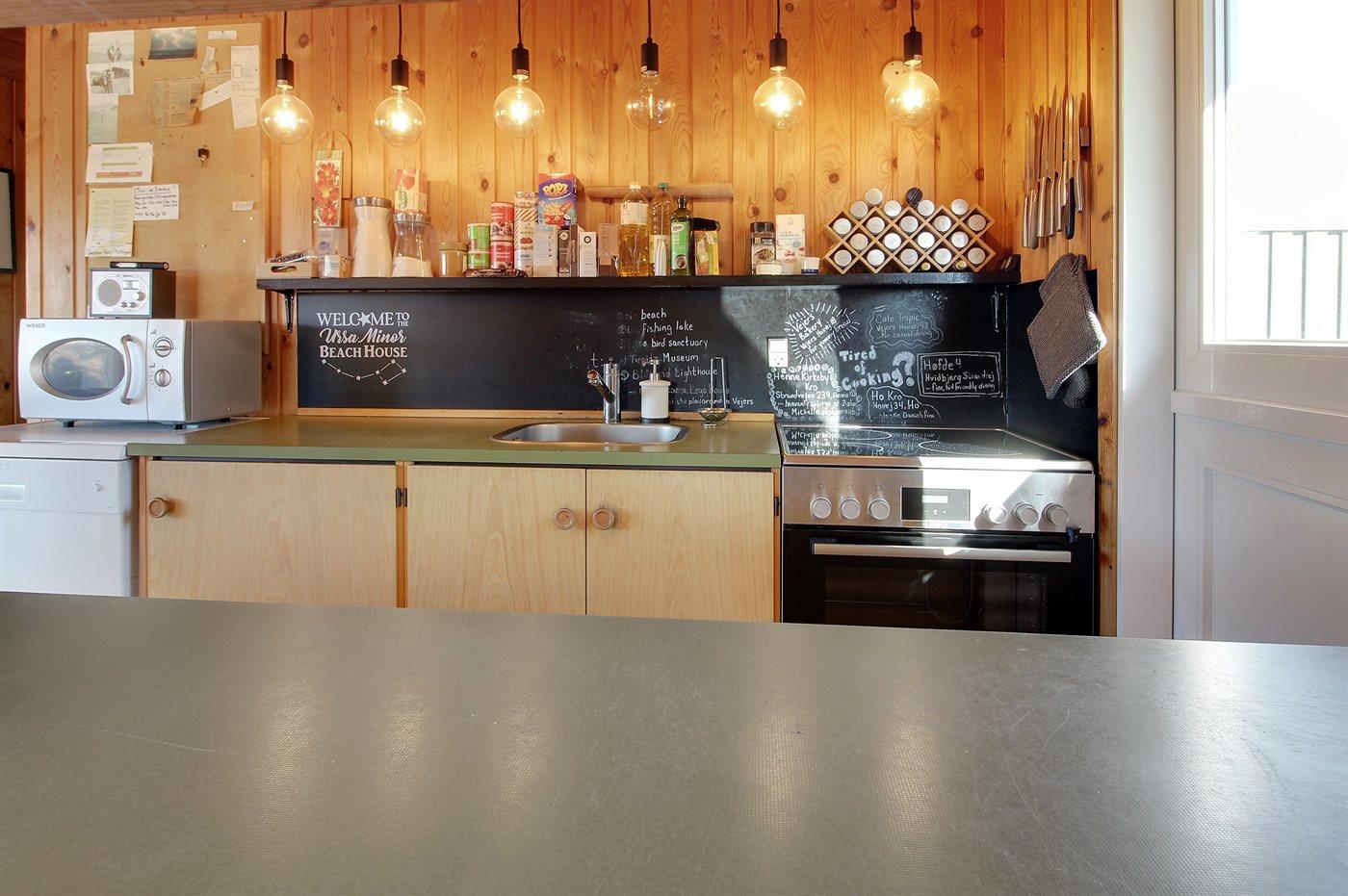 Køkkenet er udstyret med 1 køleskab. Der er 4 elkogeplader, bageovn, mikrobølgeovn samt opvaskemaskine.