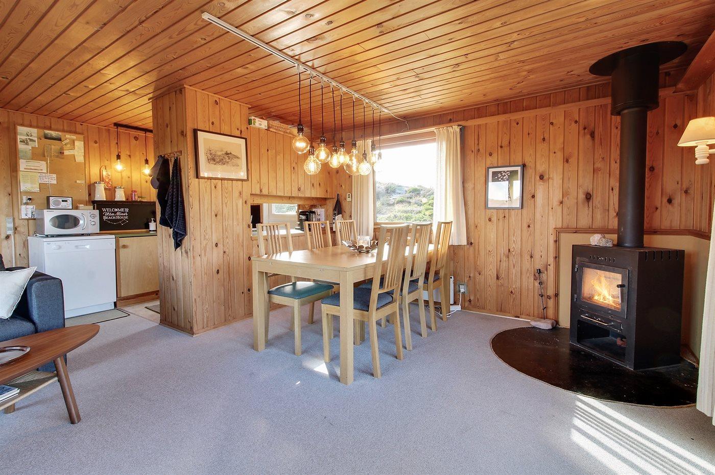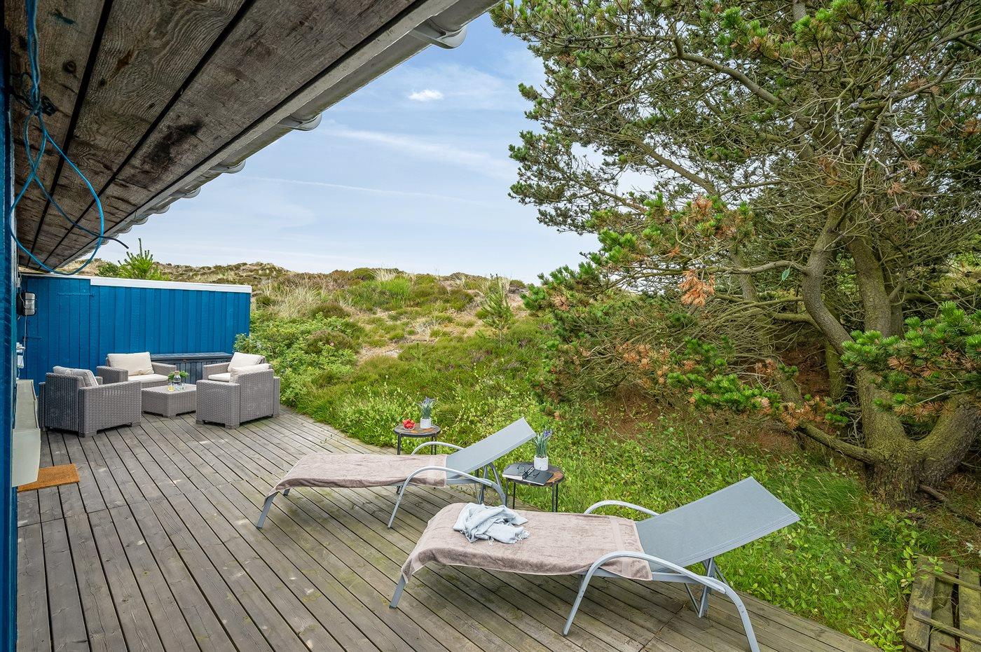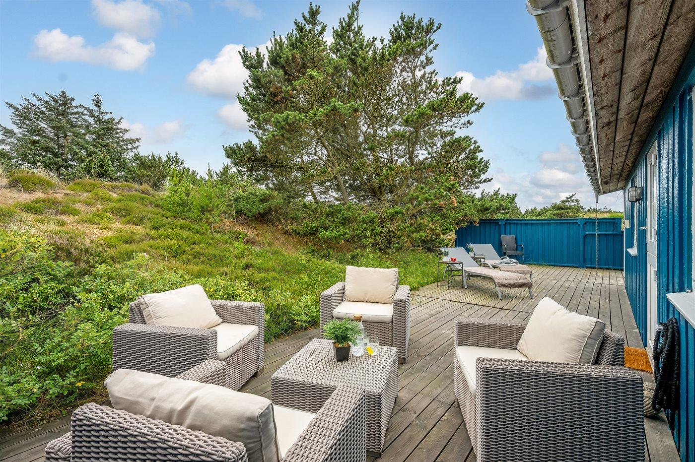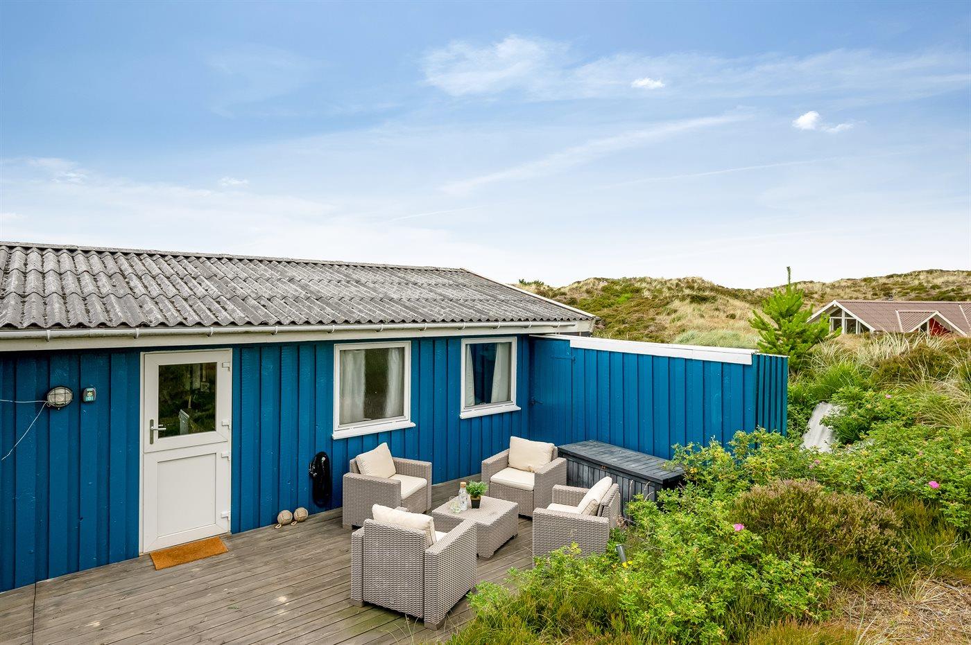 Hyggeligt feriehus i sommerhusområdet som ligger i klitterne på typisk naturgrund med højt græs. Der findes grill og havemøbler til de varme sommerdage. Fra stuen, som er hyggelig indrettet er der adgang til den overdækket terrasse.