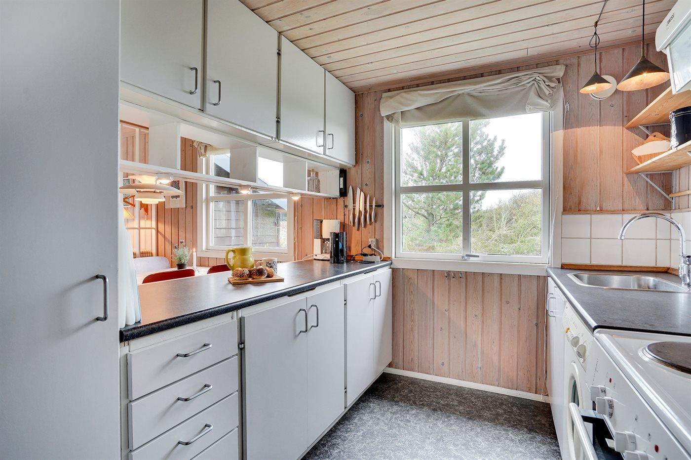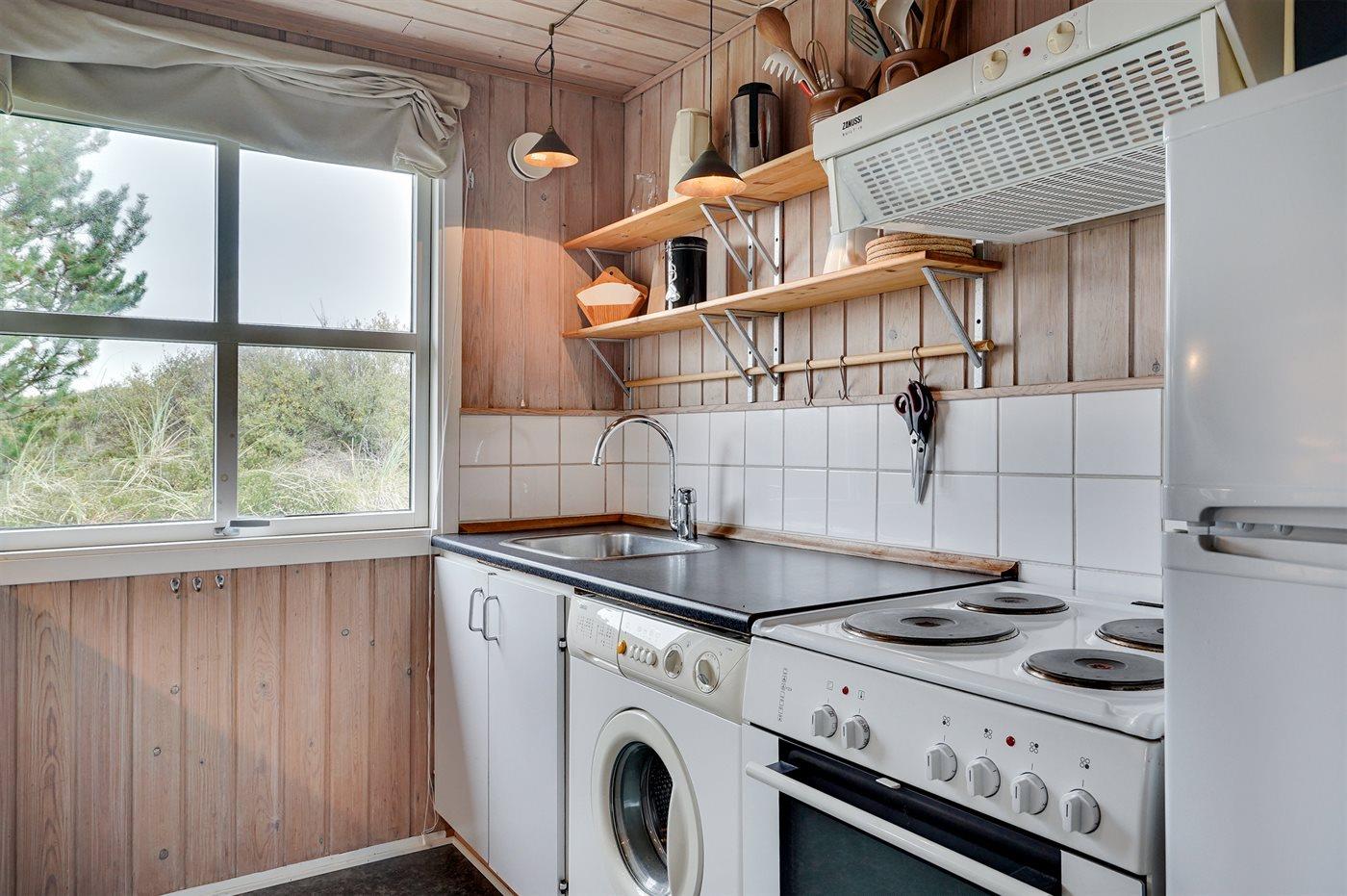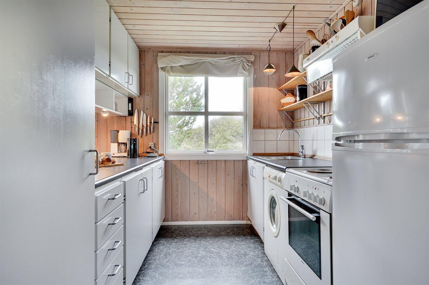 Køkkenet er udstyret med 1 køleskab. Der er 4 elkogeplader, bageovn, mikrobølgeovn.
