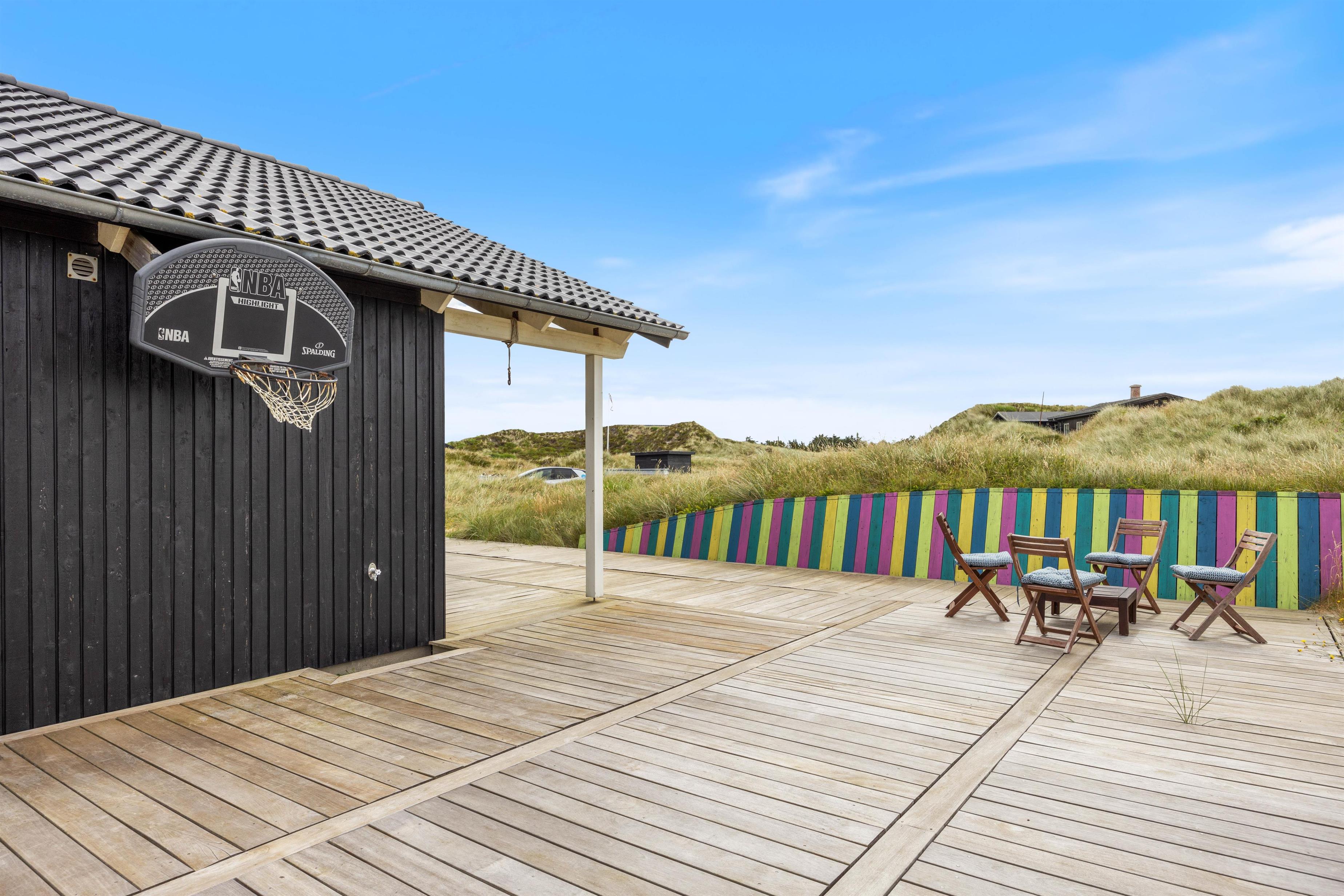 Den store træterrasse rundt på 3 sider af sommerhuset giver dels masser af plads til både hængekøje og basketball, men også til flere hyggekroge, så I altid kan finde læ, sol eller skygge efter behov. Der er naturligvis også en grill, så I kan hygge jer med lækre måltider til solnedgangen.