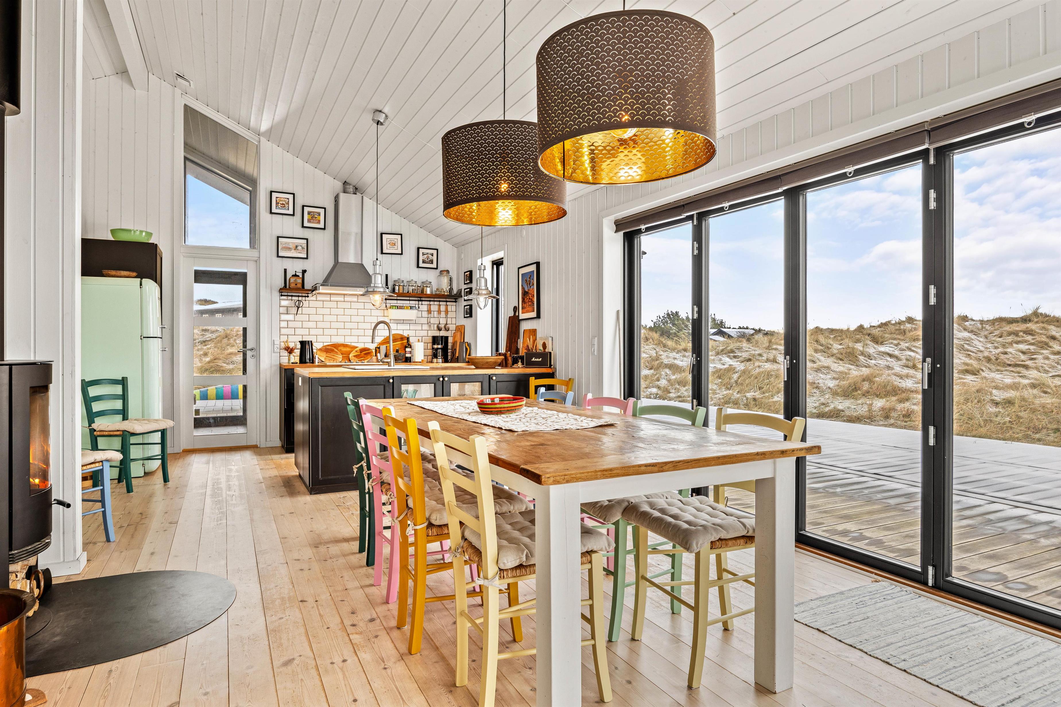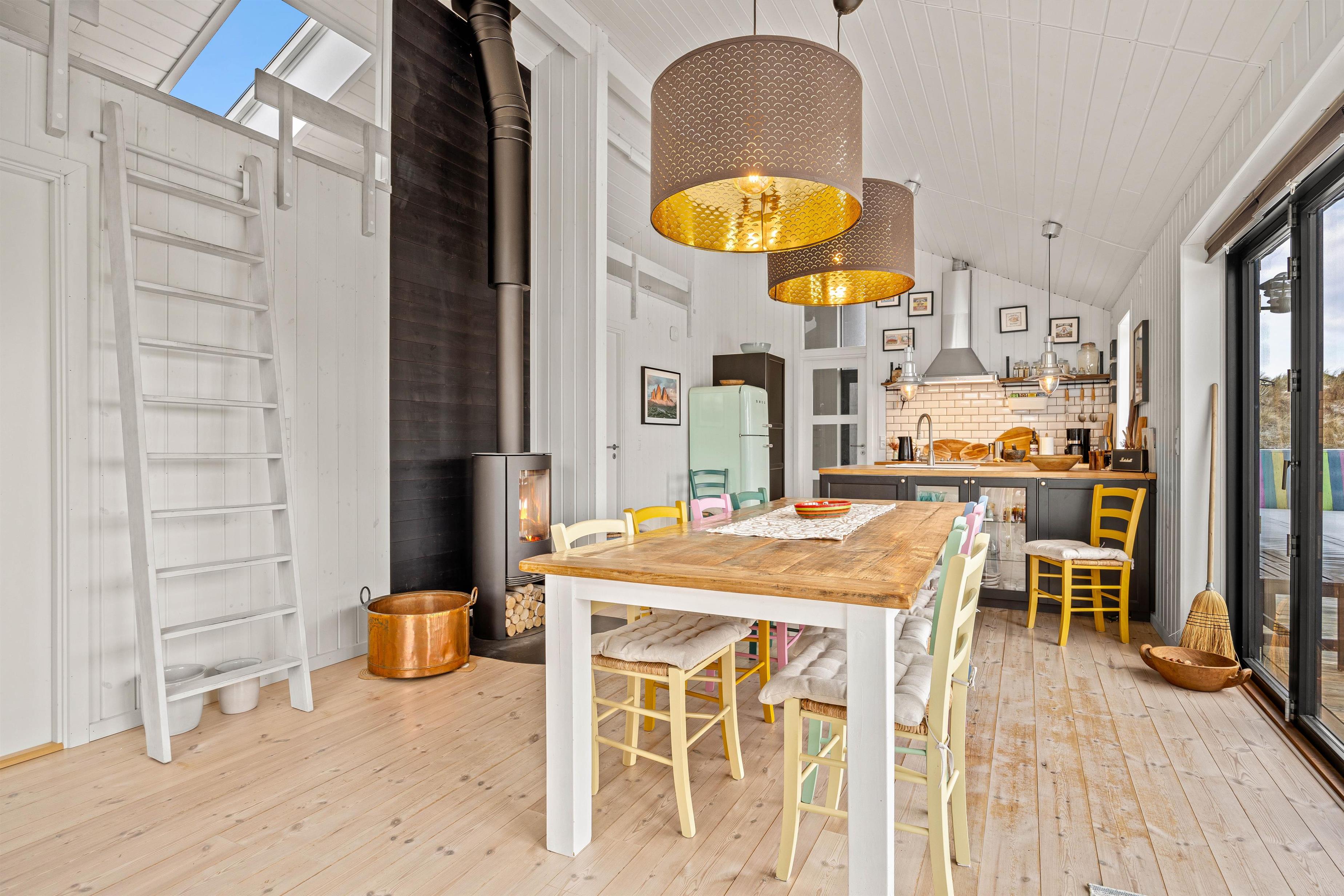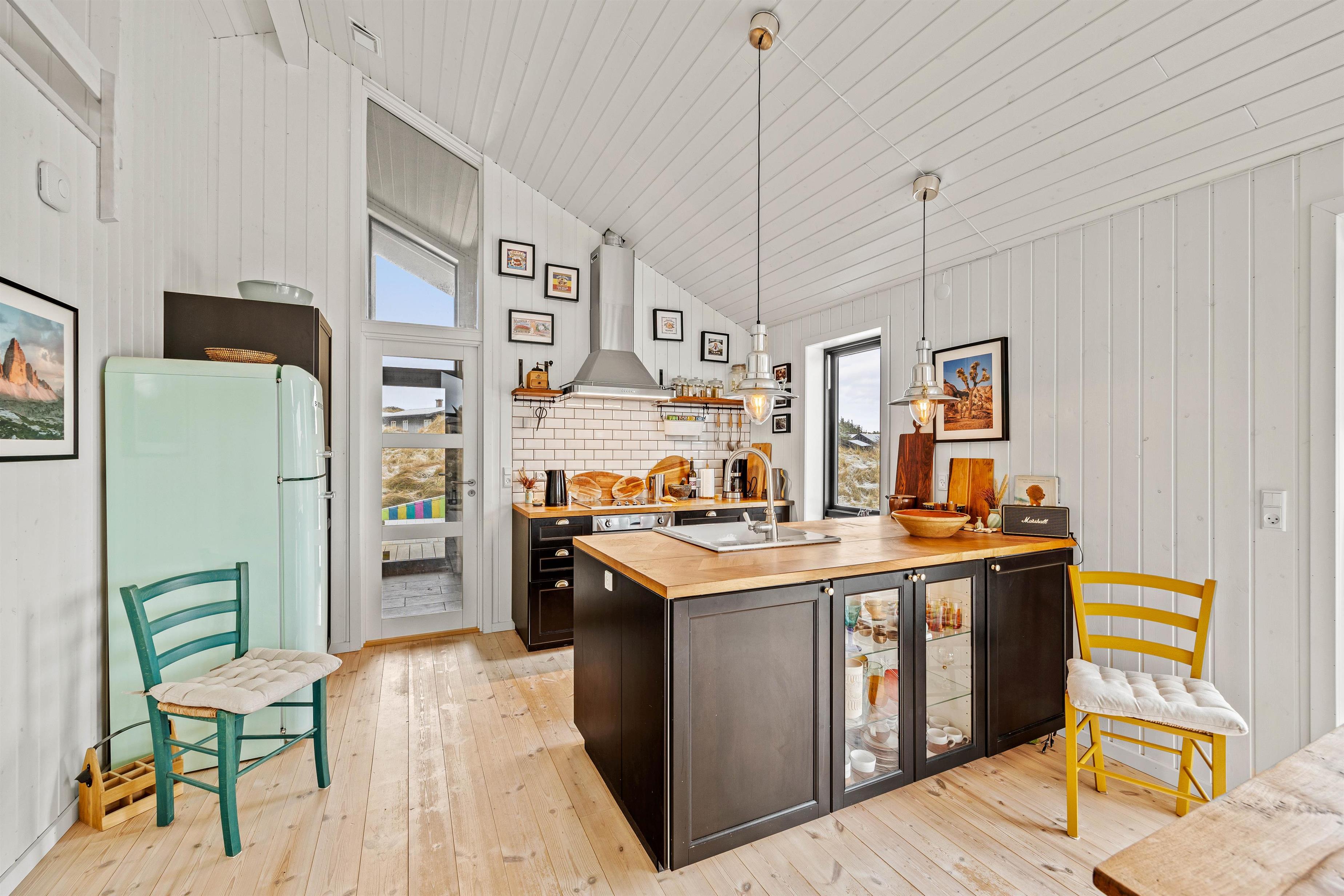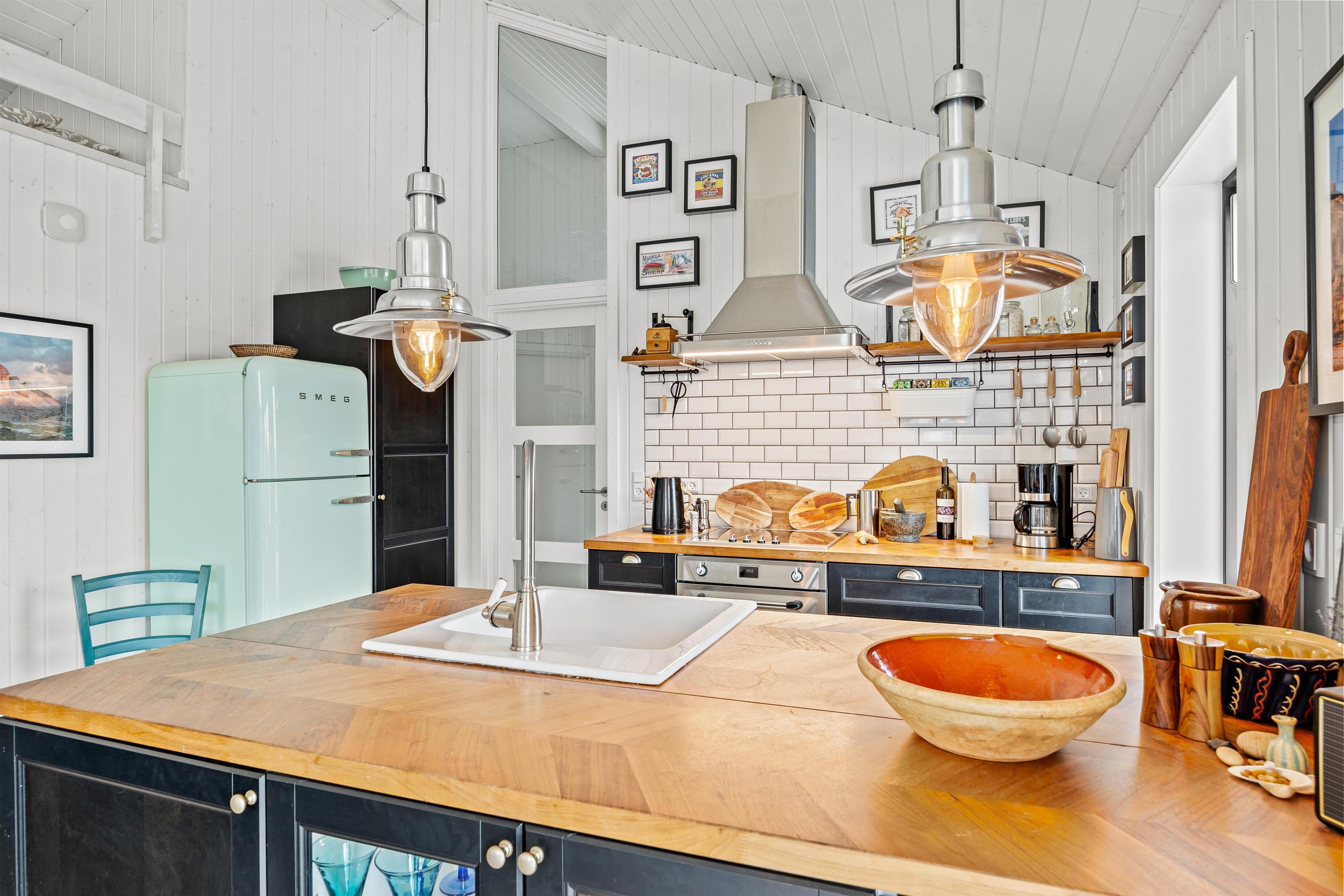 Feriehusets 95 m2 er særdeles godt udnyttet, og giver en let og lys stemning gennem den personlige og moderne indretning i det højloftede rum. Det åbne køkken med store porcelænsvask, induktionskogeplade, ovn og opvaskemaskine rundes af med det pastelgrønne amerikanske køleskab. På spisebordet foran brændeovnen kan gæster fordele sig på de ens, men forskelligt farvede stole – igen en meget moderne og let indretning, der kalder på smilet.