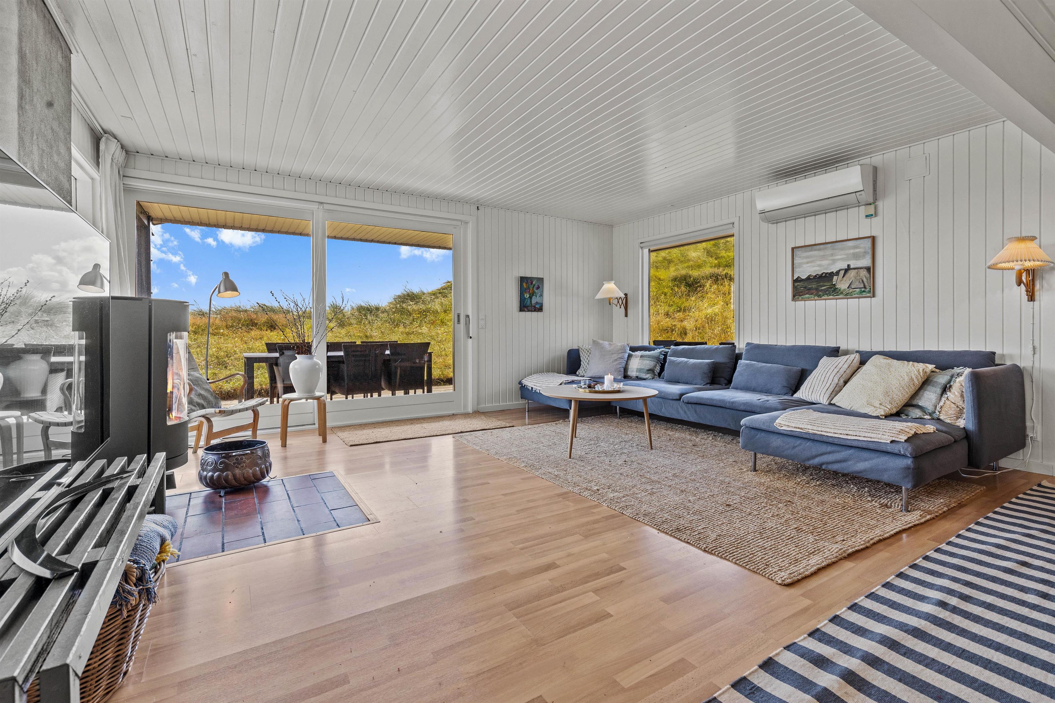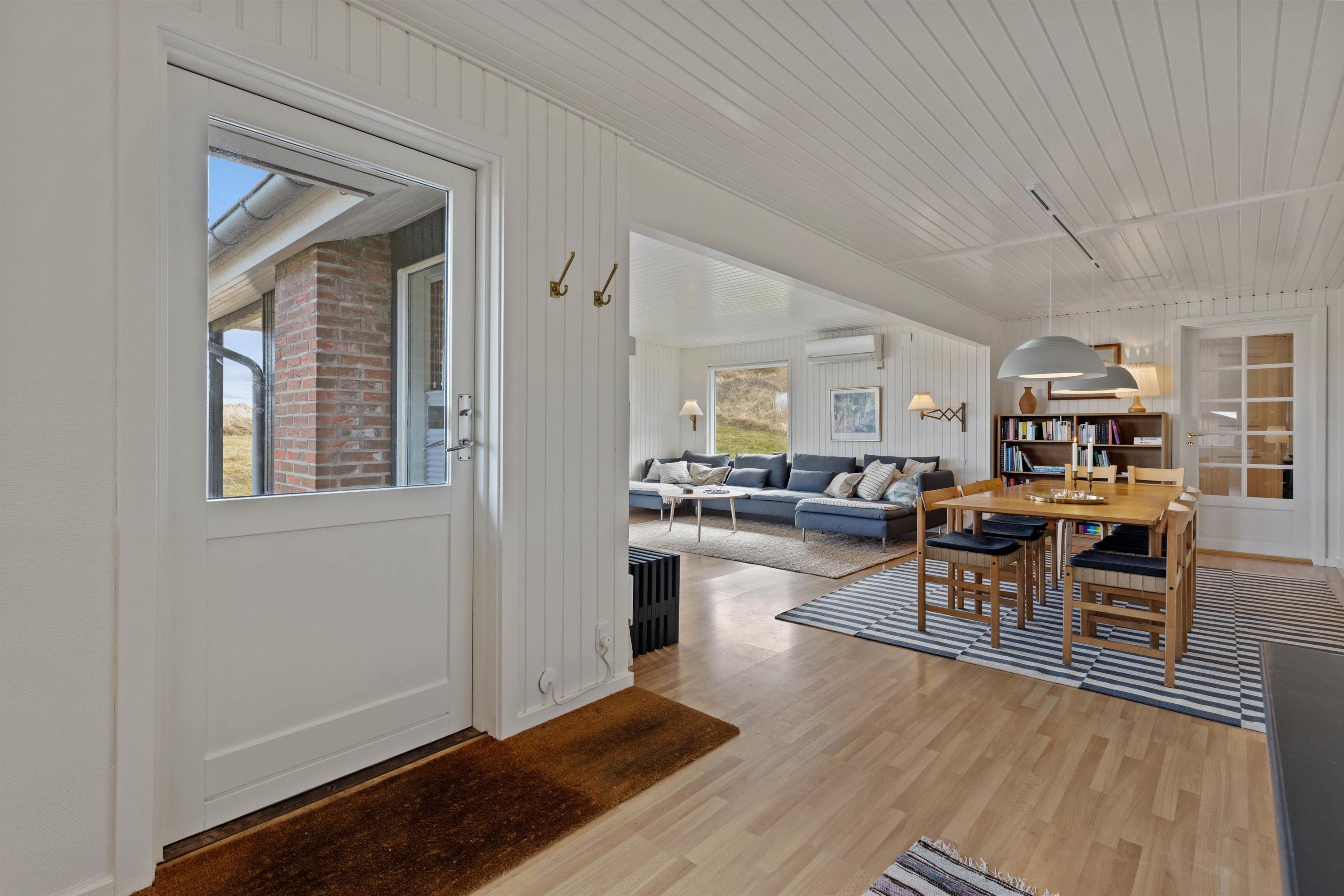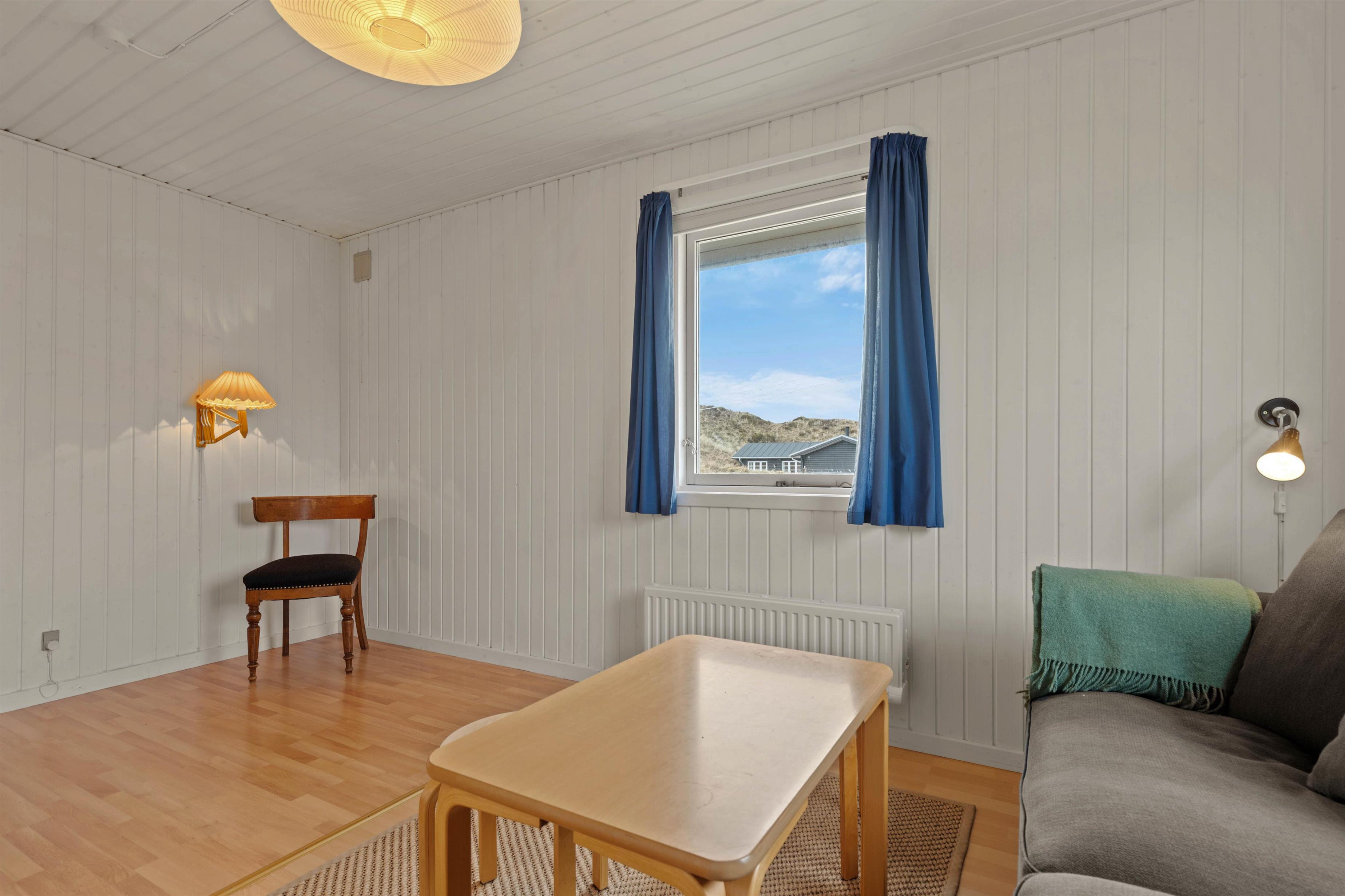 De store vinduespartier i opholdsstuen giver et flot lysindfald og en fantastisk udsigt over klitlandskabet i Grærup. Du kan sætte dig til rette i gyngestolen med en kop te - eventuelt med ild i pejsen - og bare nyde naturen. I opholdsstuen vil I kunne nyde samværet, få mange gode snakke, spille spil eller læse en god bog. Hurtigt vil hverdagens stress forsvinde og den dejlige feriestemning fylde i stedet.