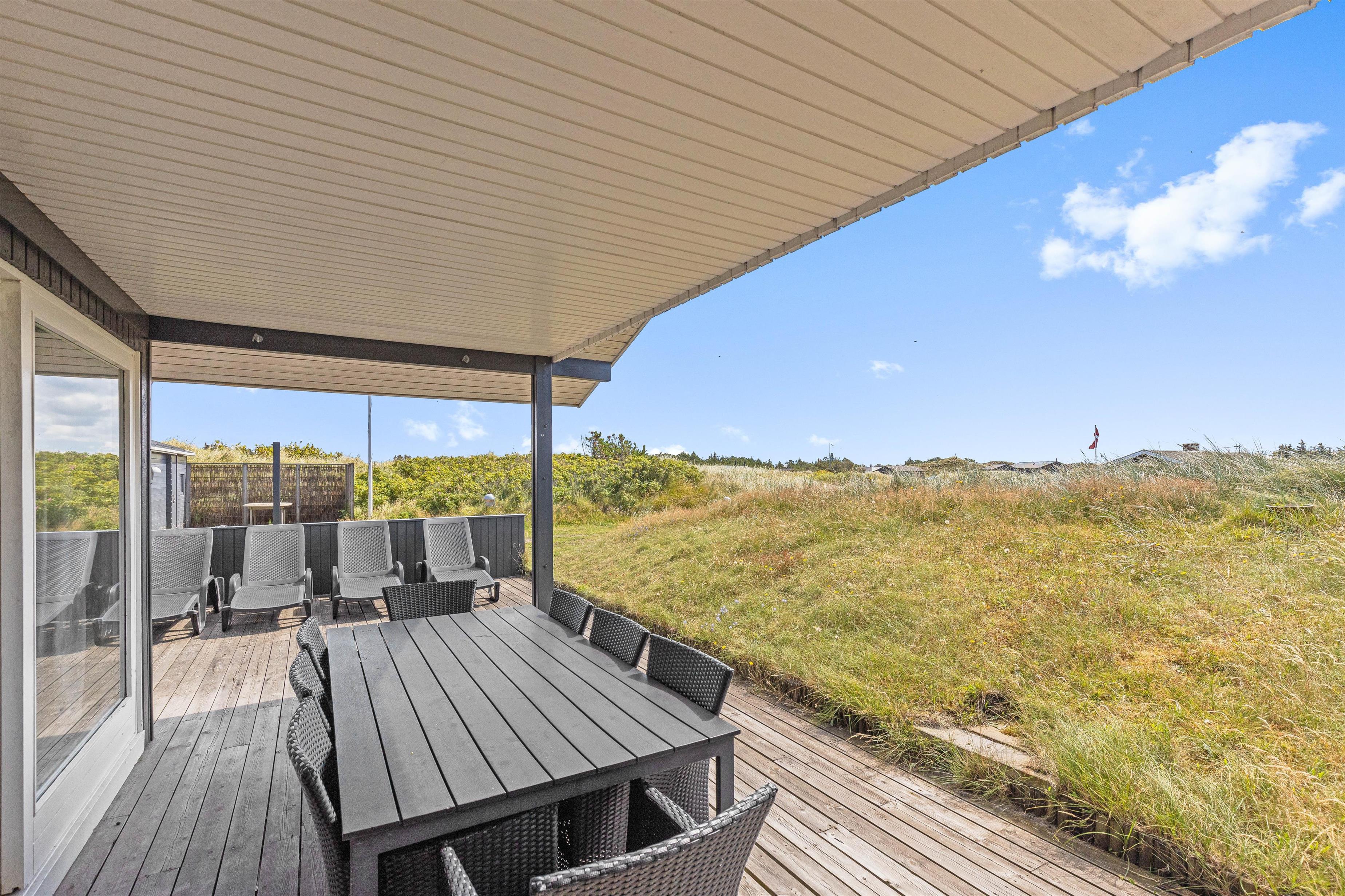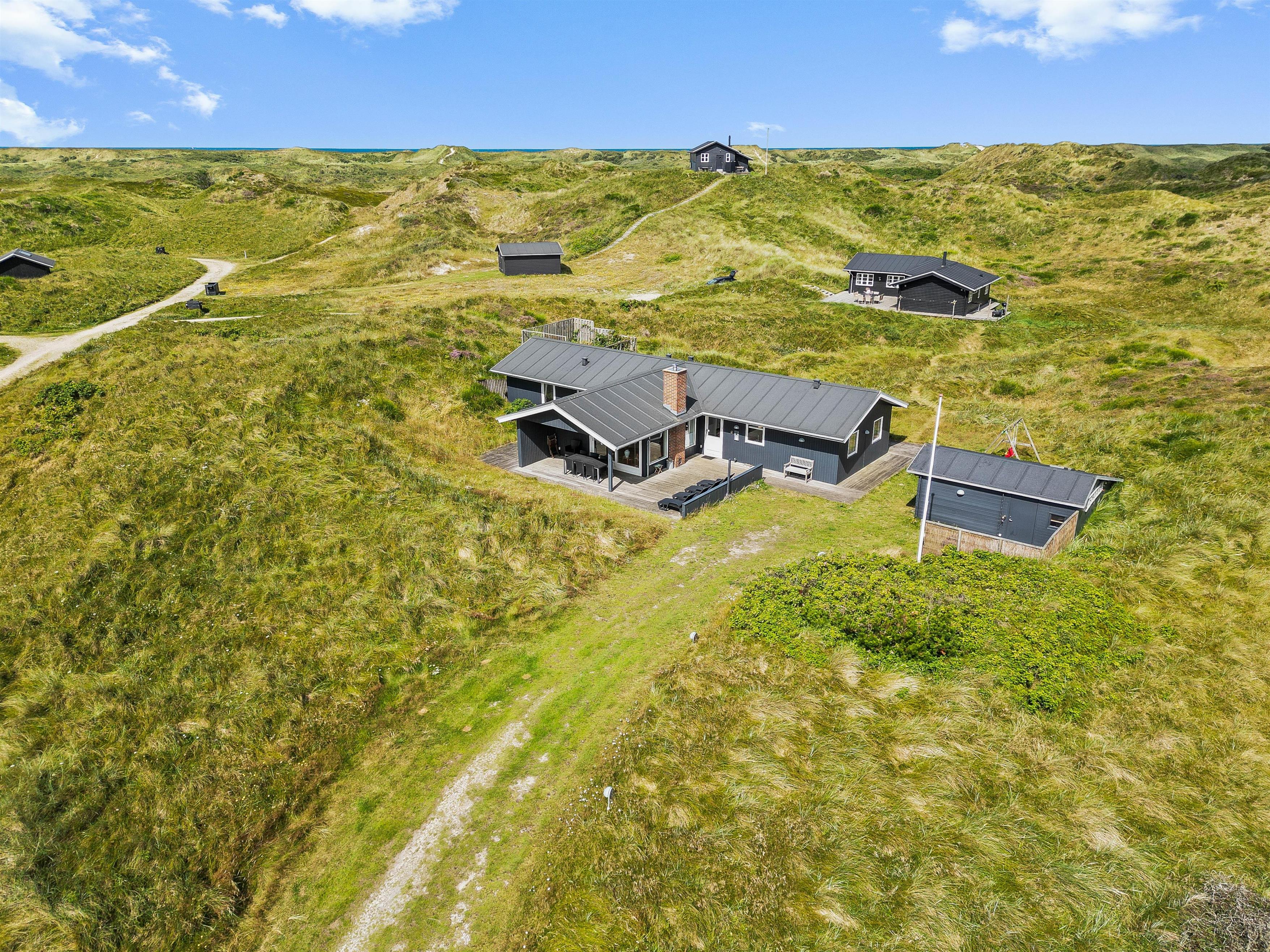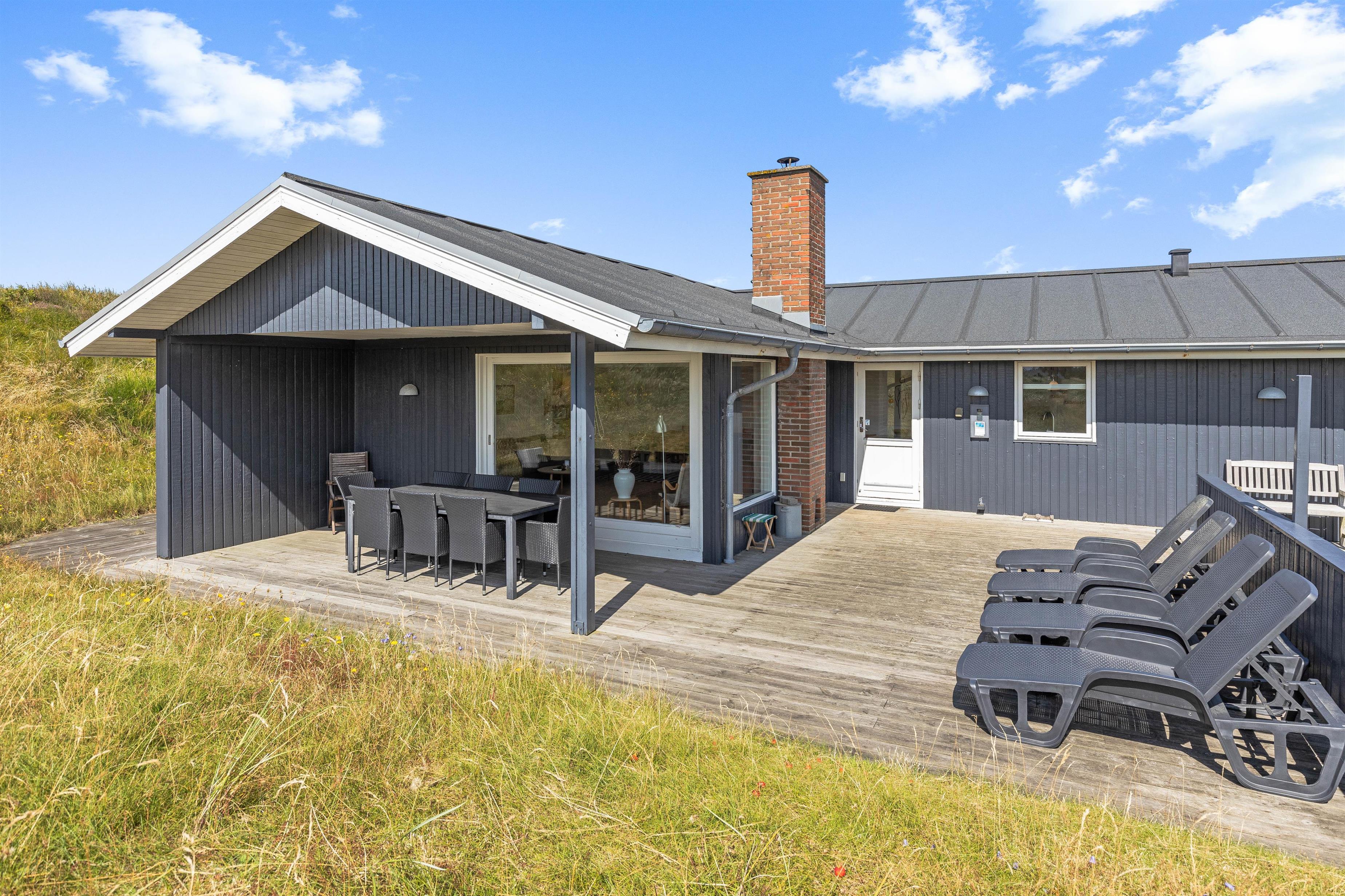 De store vinduespartier i opholdsstuen giver et flot lysindfald og en fantastisk udsigt over klitlandskabet i Grærup. Du kan sætte dig til rette i gyngestolen med en kop te - eventuelt med ild i pejsen - og bare nyde naturen. I opholdsstuen vil I kunne nyde samværet, få mange gode snakke, spille spil eller læse en god bog. Hurtigt vil hverdagens stress forsvinde og den dejlige feriestemning fylde i stedet.