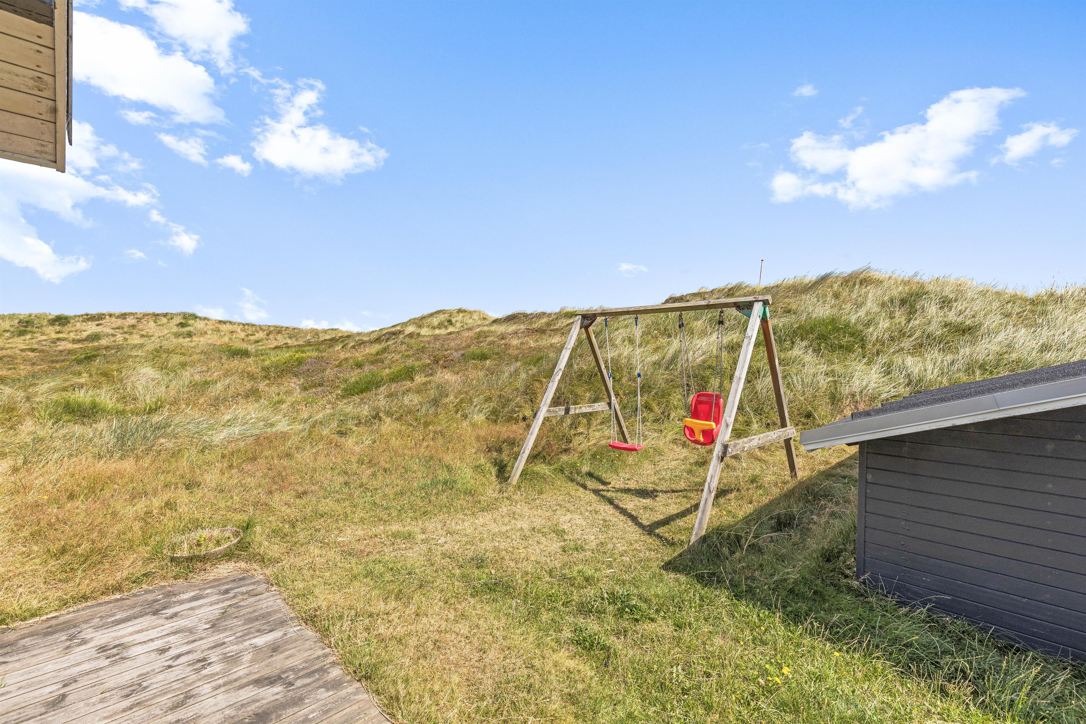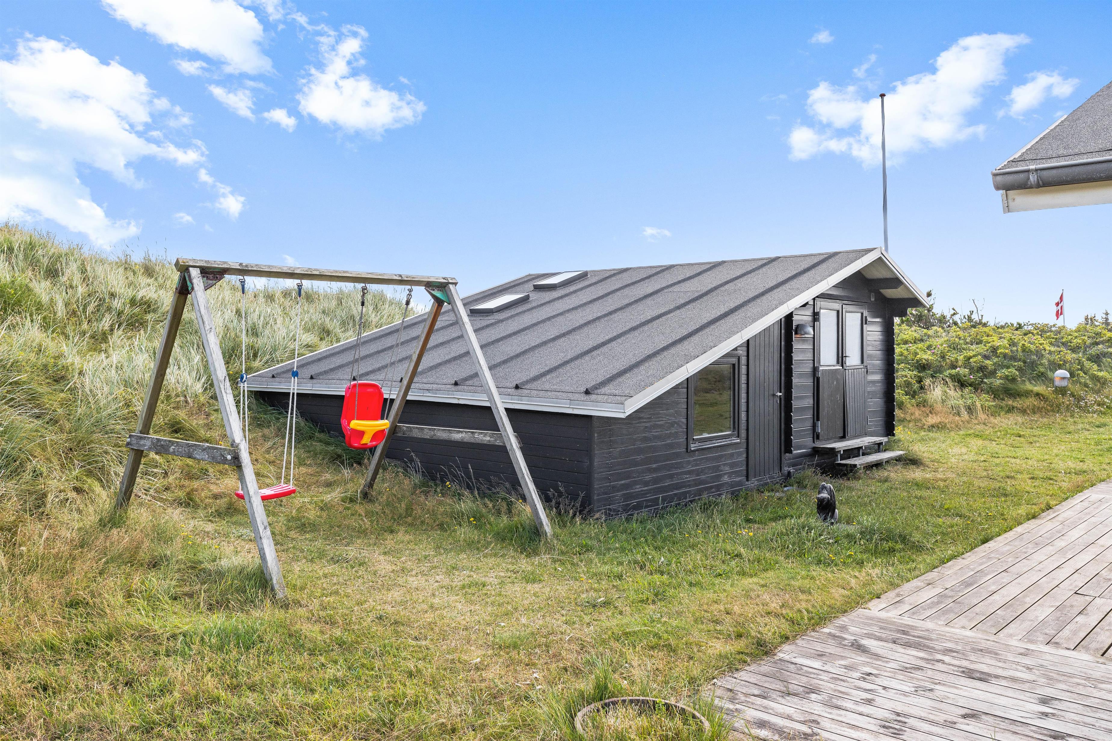 Der er terrasse på alle sider af sommerhuset, så I kan følge solen hele dagen, når I ønsker at slappe af på de komfortable liggestole og havemøbler. Ligesom I altid kan finde en lækrog til en stille stund med en kop kaffe. På den 3.600 m2 store naturgrund er der masser af plads til at boltre sig for både børn og voksne. Spil et vikingespil, eller lad børnene brænde energi af i gyngerne. På en stille sommeraften kan I også tænde op i grillen og slutte dagen af med en fælles barbeque.