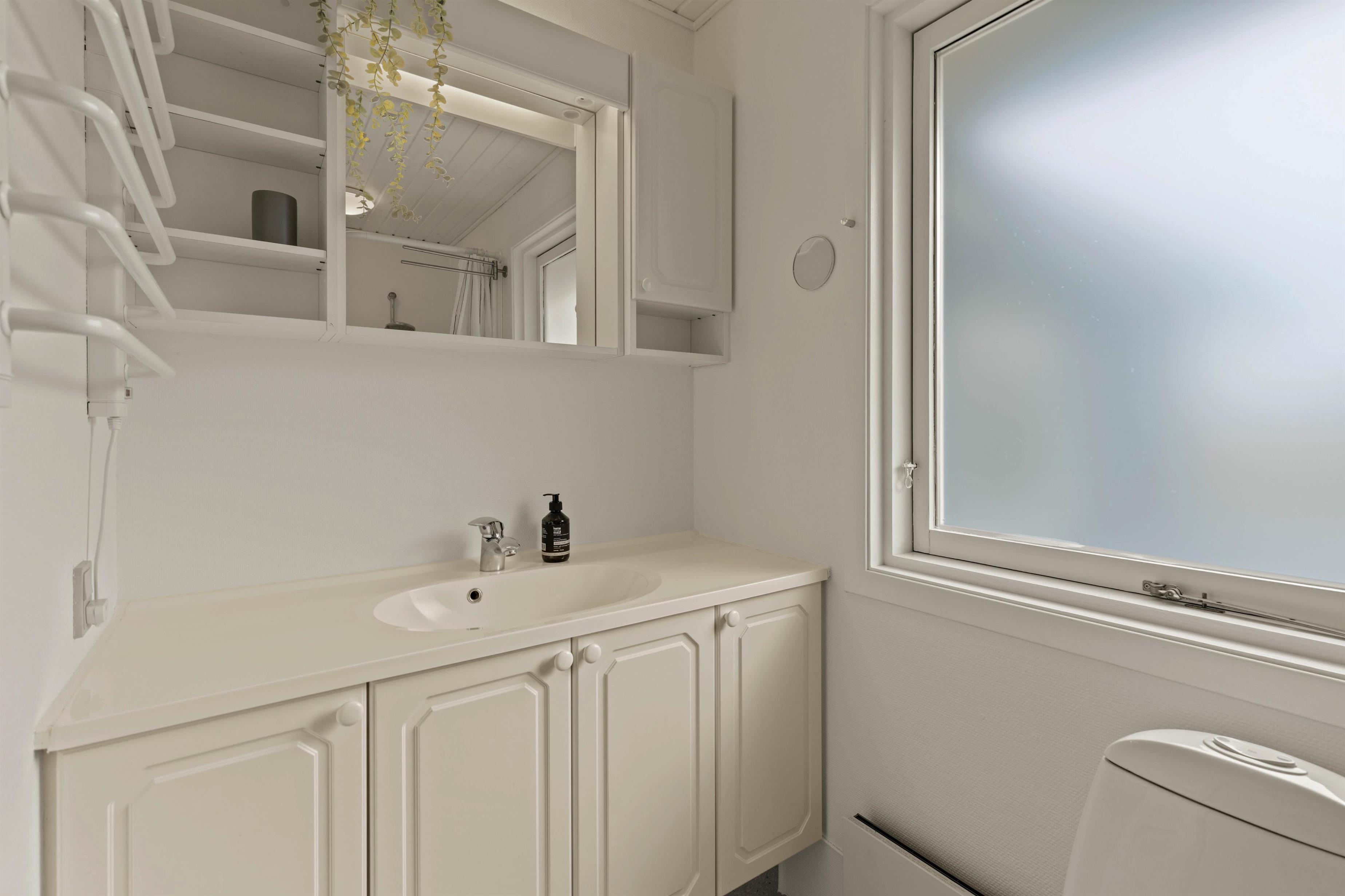 De 2 badeværelser med gulvvarme betyder, at I ikke behøver at stå i kø til morgenbadet. Det ene har badekar, det andet bruser – så der er noget for enhver smag. Sommerhuset opfylder også kravene fra en moderne familie med f.eks. vaskemaskine og tørretumbler, opvaskemaskine og en energibesparende varmepumpe.