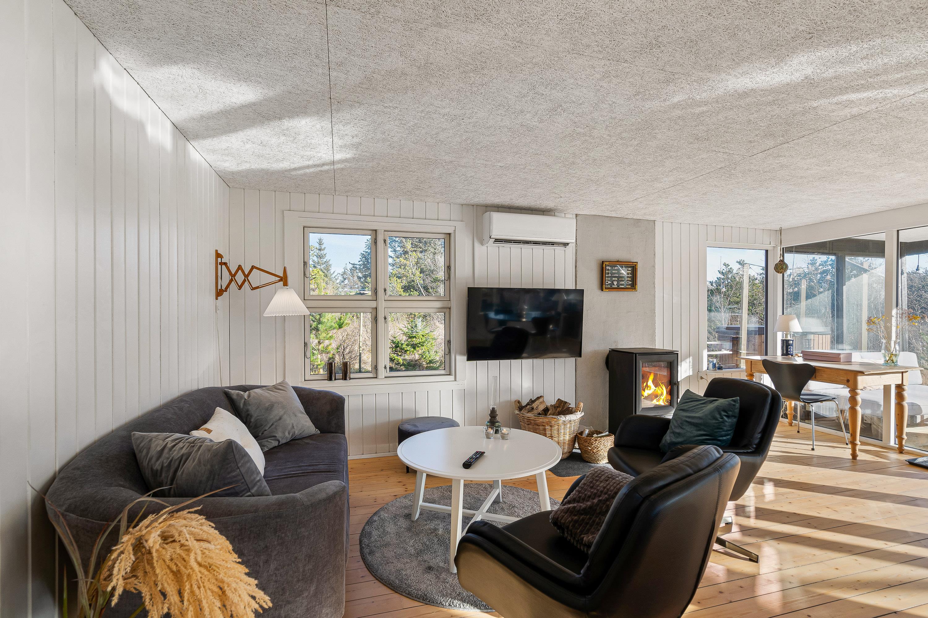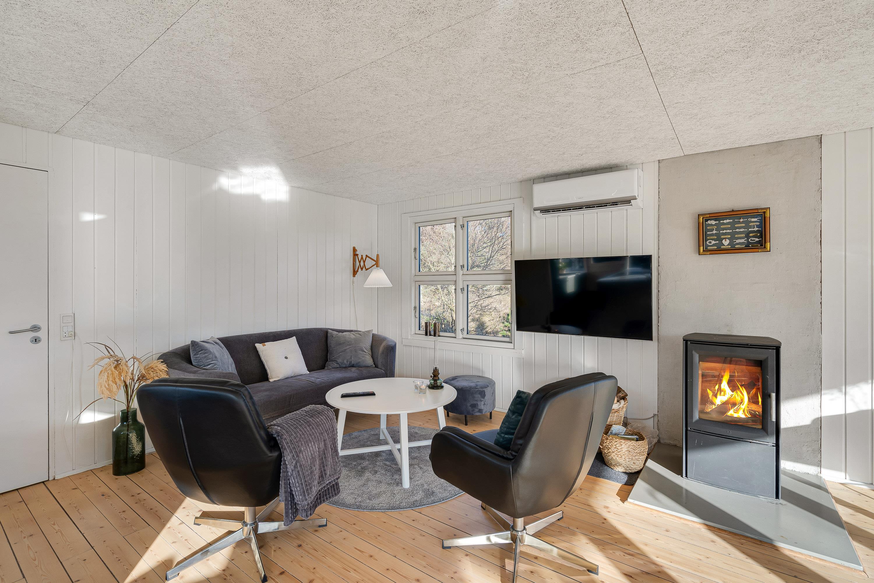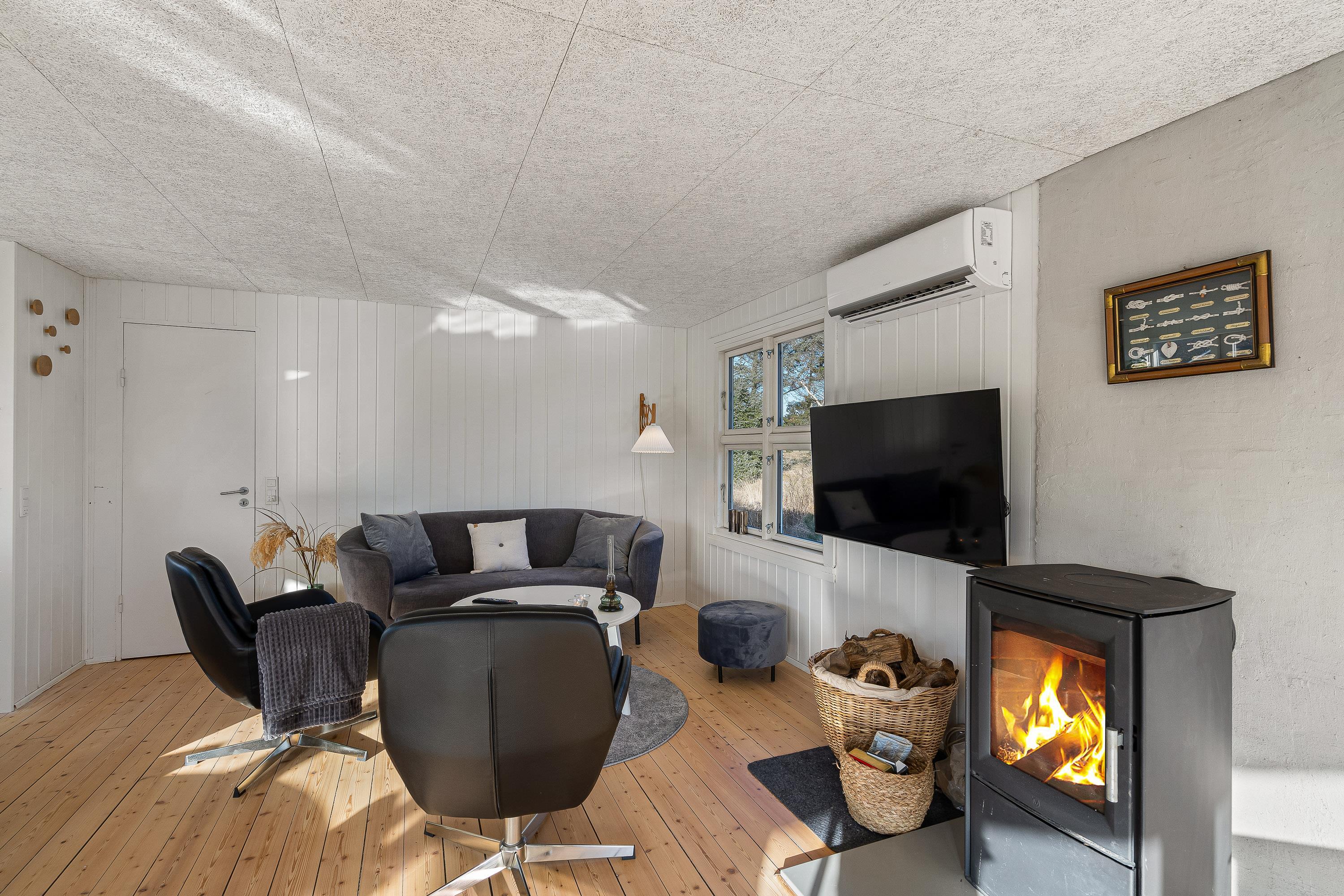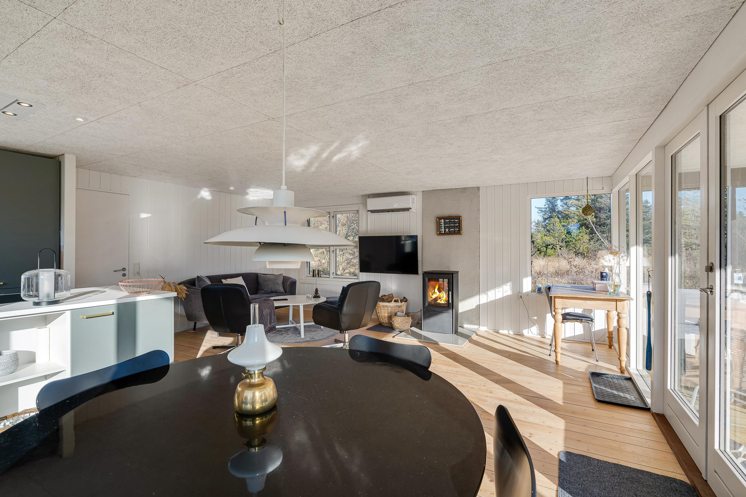 I sommerhusets stue kan I nyde mange hyggelige feriestunder sammen på ferien. Her sørger brændeovnen for både at fuldende den hyggelige feriestemning, og samtidig spreder den en dejlig varme. Udover brændeovnen er der også en energivenlig varmepumpe i sommerhuset, der sørger for, at I har et godt indeklima på ferien.