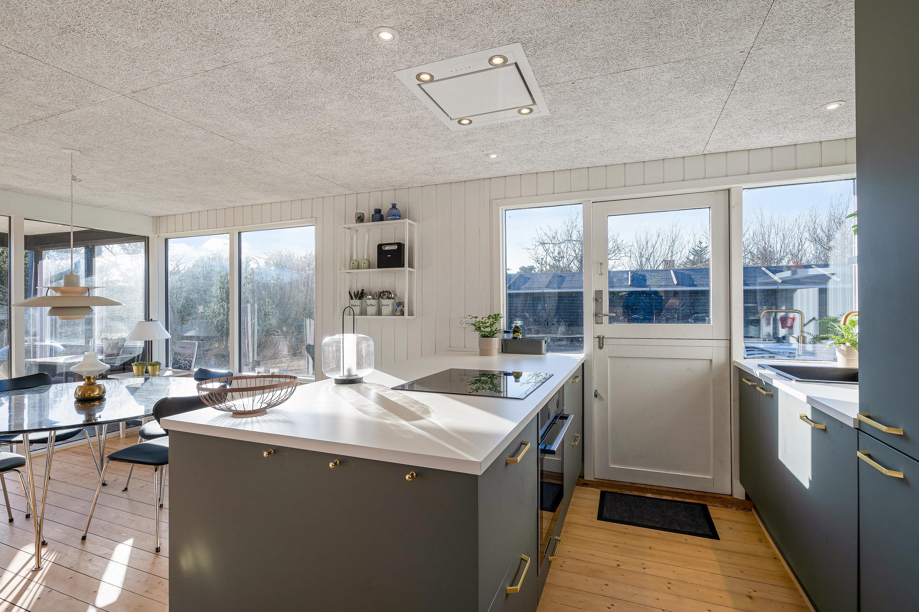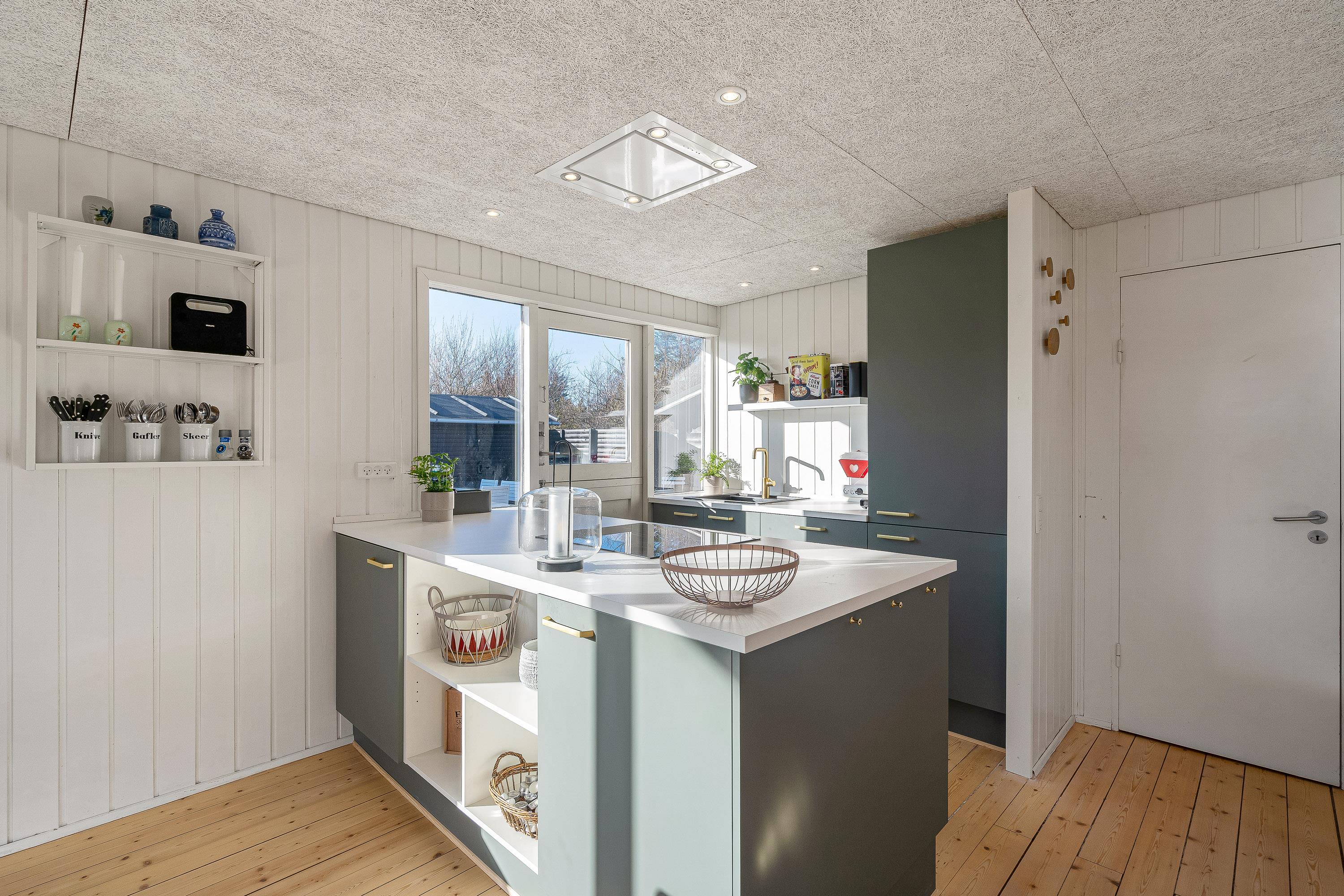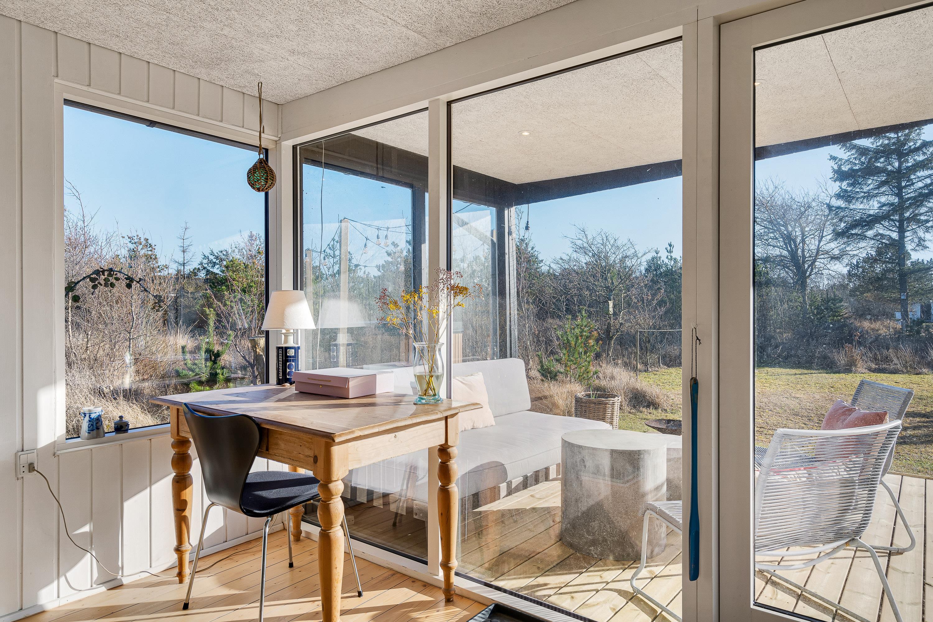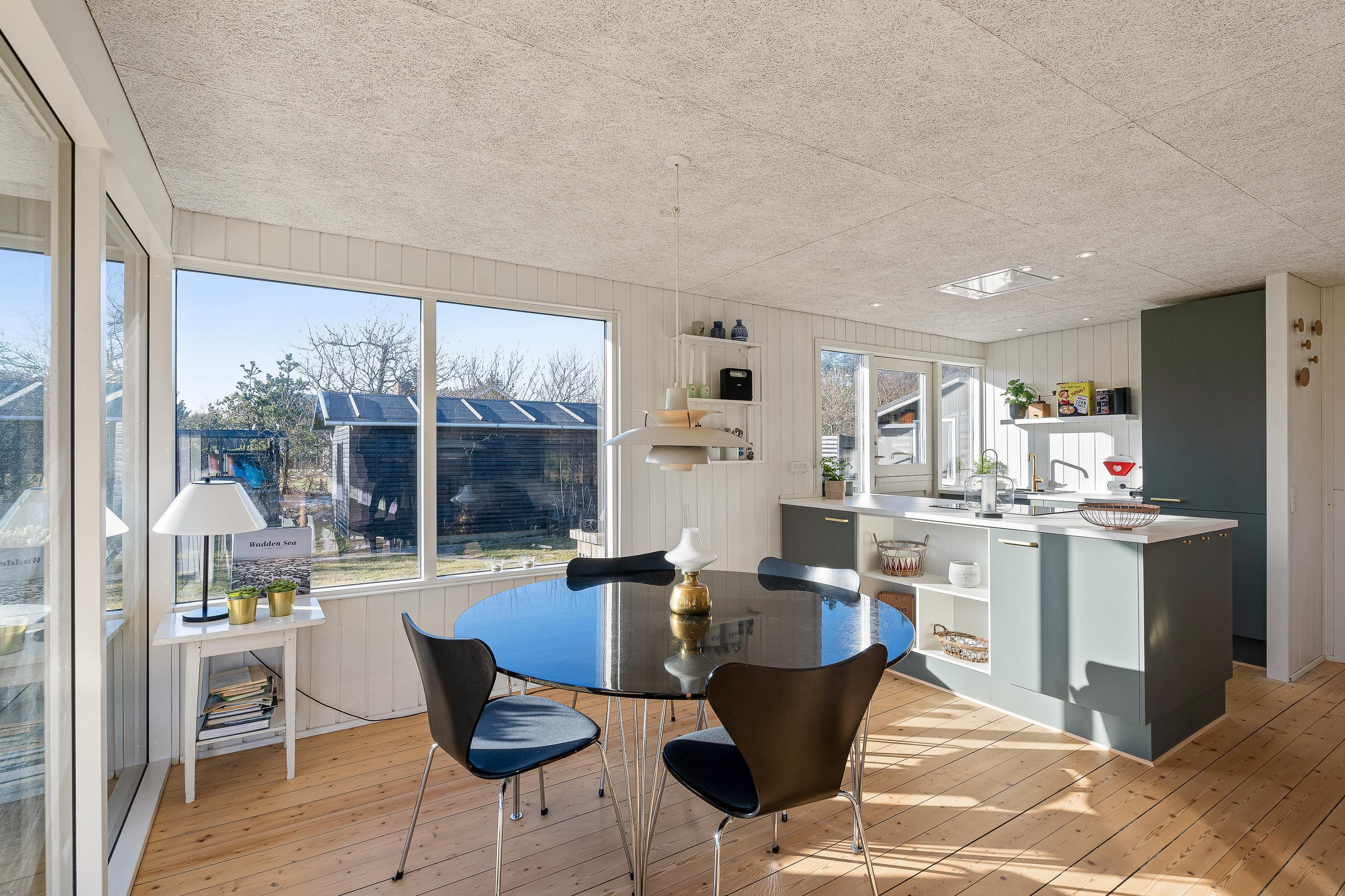 I sommerhusets stue kan I nyde mange hyggelige feriestunder sammen på ferien. Her sørger brændeovnen for både at fuldende den hyggelige feriestemning, og samtidig spreder den en dejlig varme. Udover brændeovnen er der også en energivenlig varmepumpe i sommerhuset, der sørger for, at I har et godt indeklima på ferien.