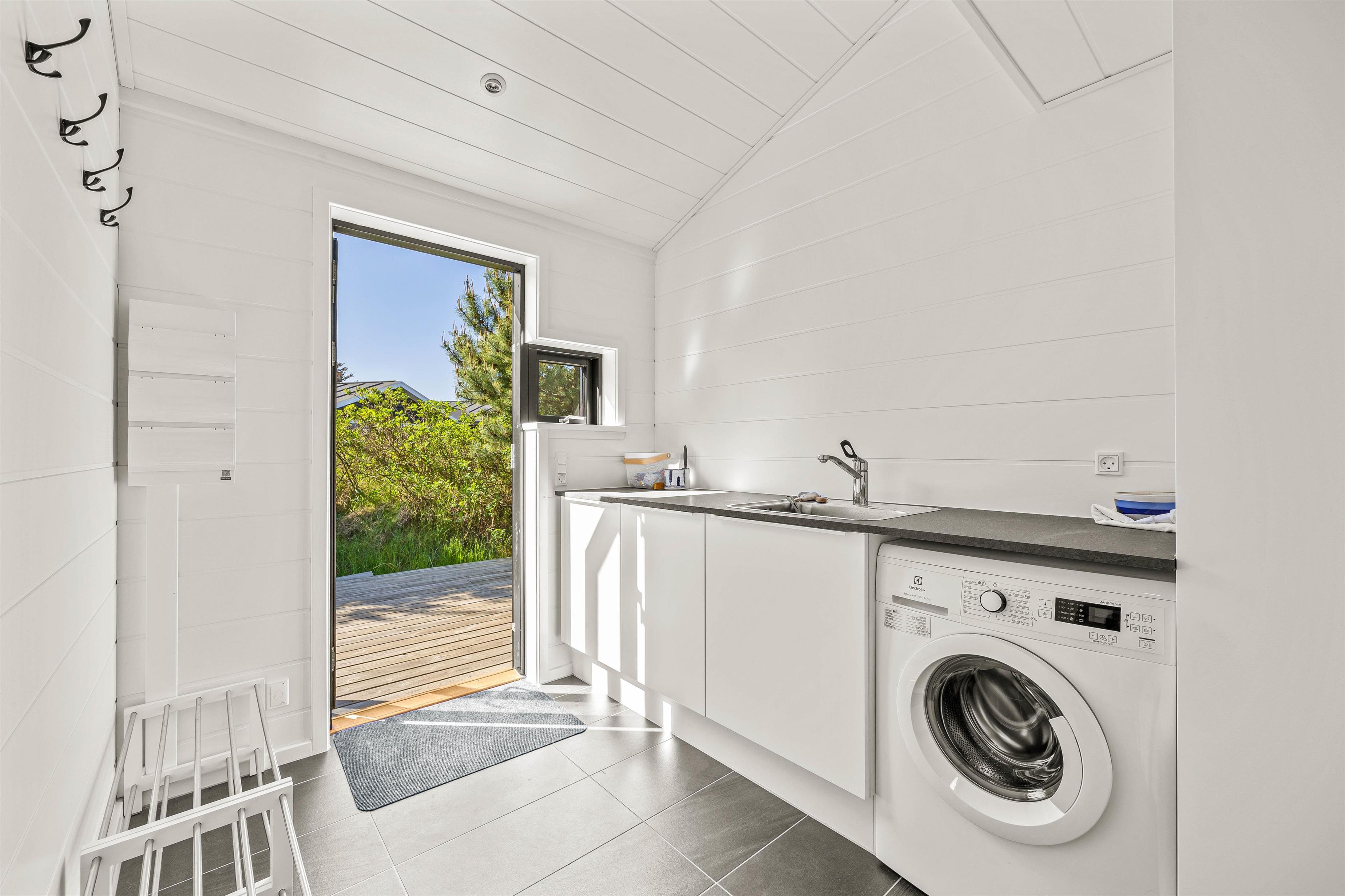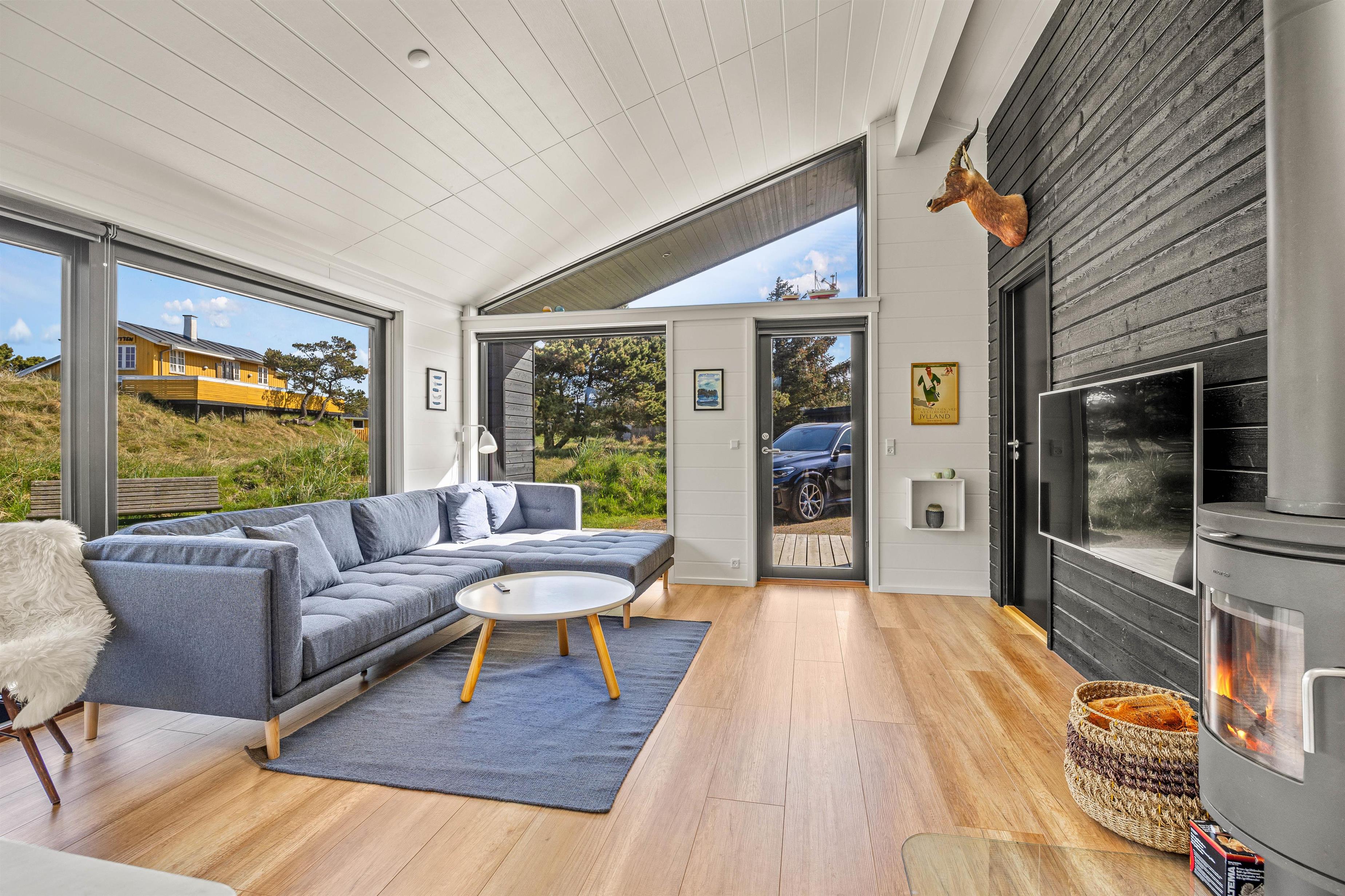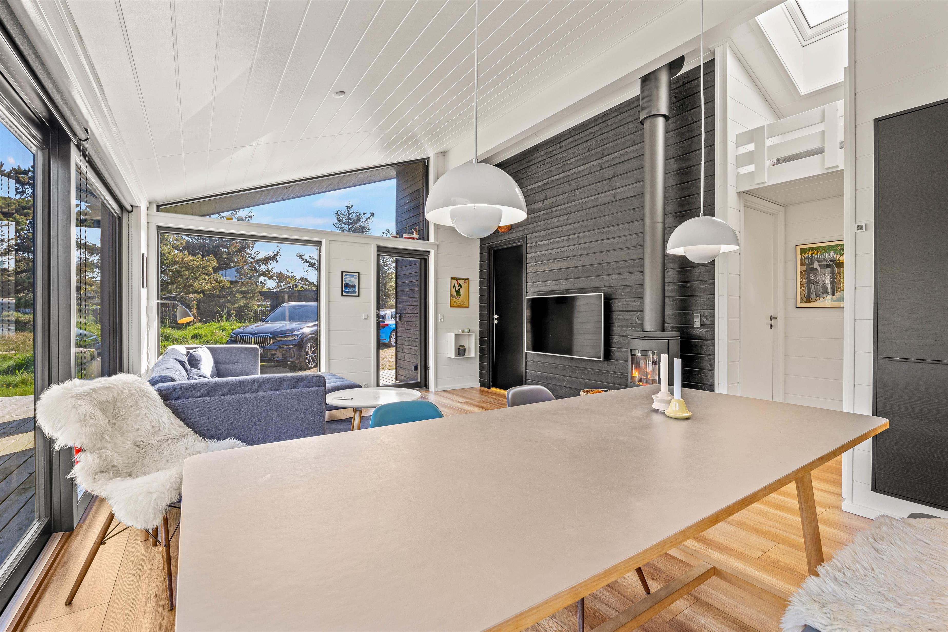 Sommerhusets byder på et charmerende og rummeligt indre, hvor de varme farver og knitrende brændeovn sørger for at skabe den helt rigtige ferieatmosfære. Her er god plads til familielivet – og I kan både hygge jer med fælles madlavning, brætspil eller dase på sofaen foran tv´et. I rummet sørger en energibesparende varmepumpe for en behagelig indetemperatur året rundt.