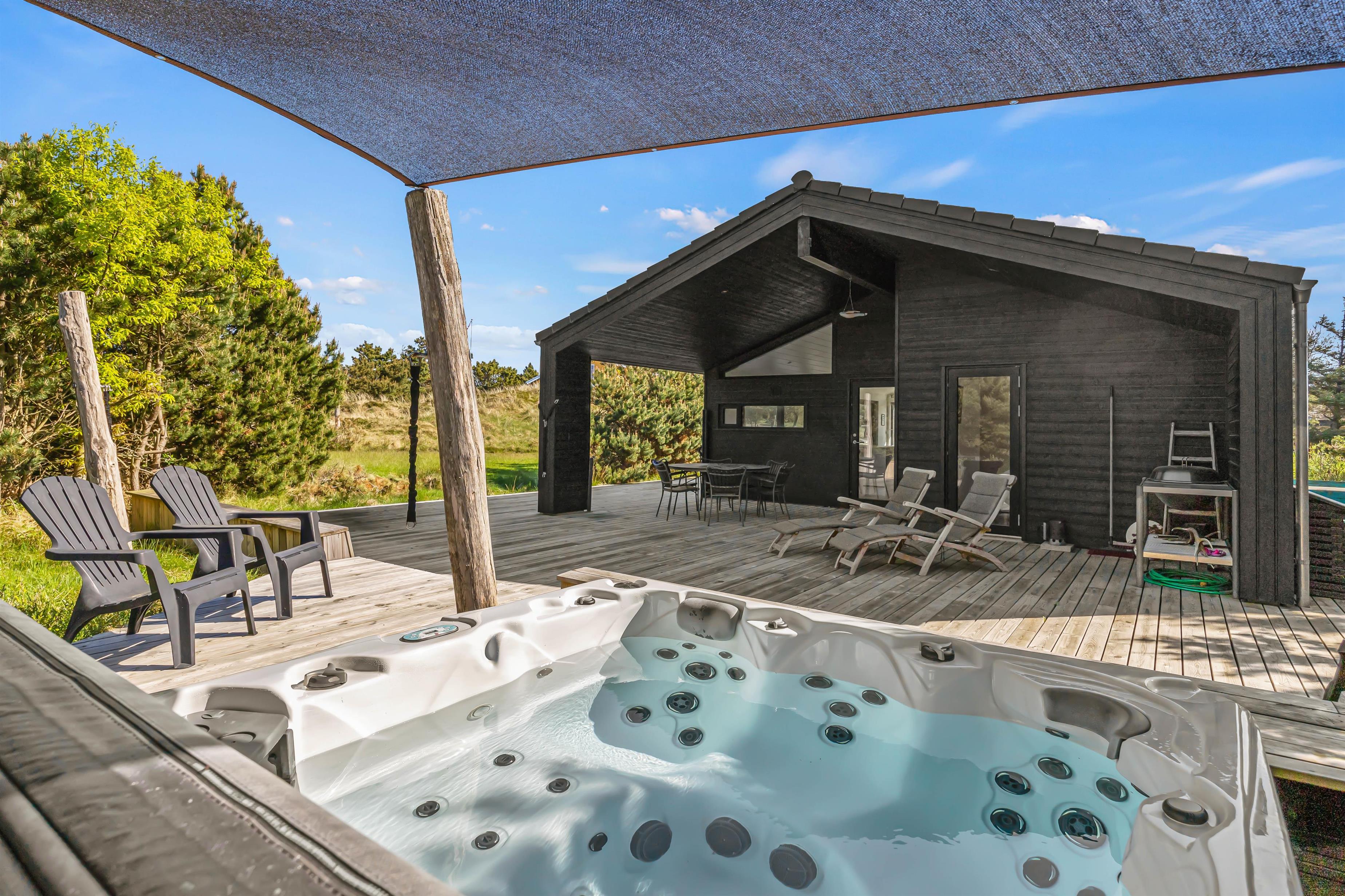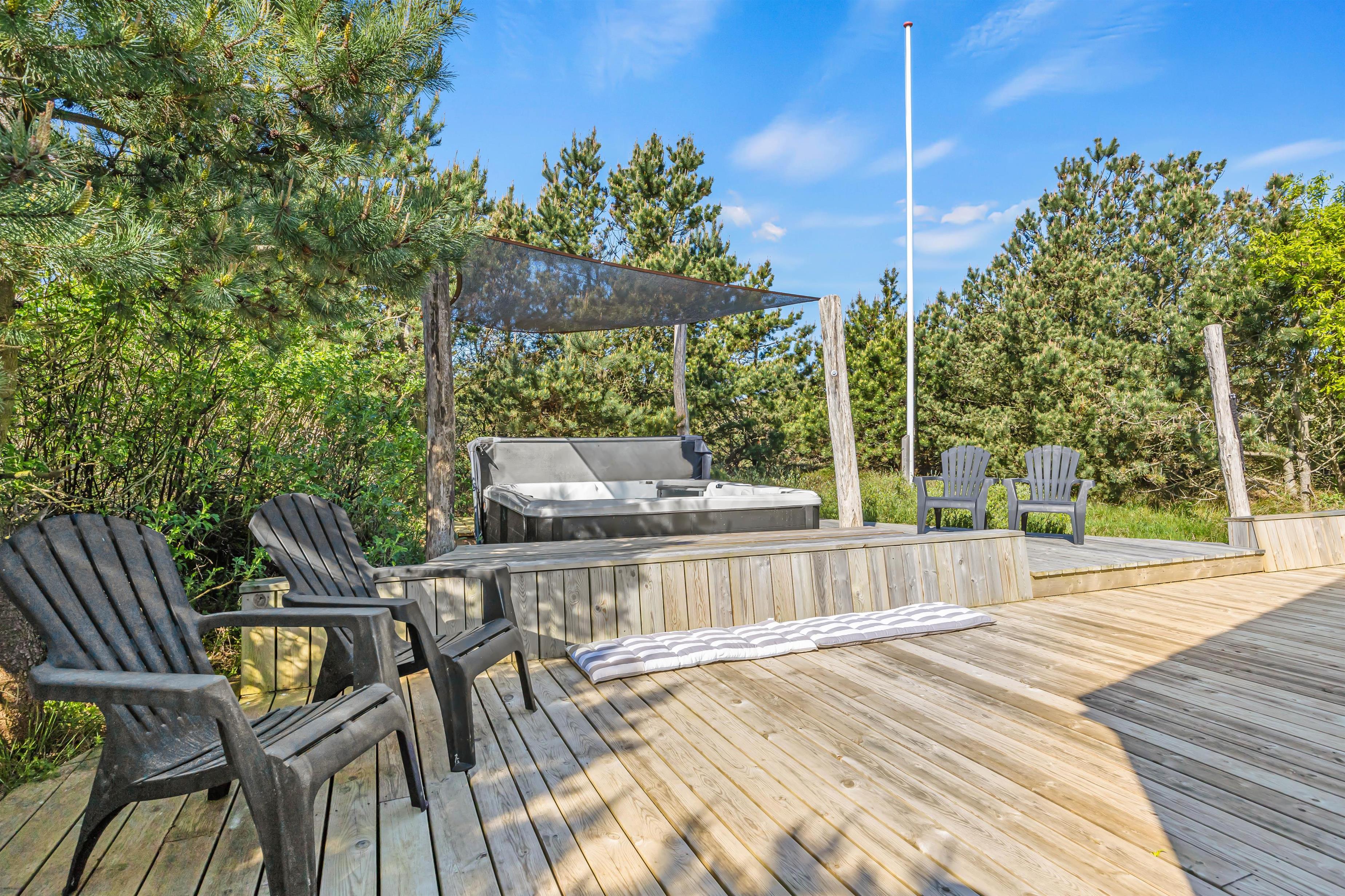 På terrassen finder I desuden et af sommerhusets absolutte highlights. Her står et stort udendørs spabad, som giver jer mulighed for at nyde lidt ekstra wellness på ferien. Forestil jer at slappe af i det varme vand under stjernehimmelen efter en dag fyldt med eventyr.
