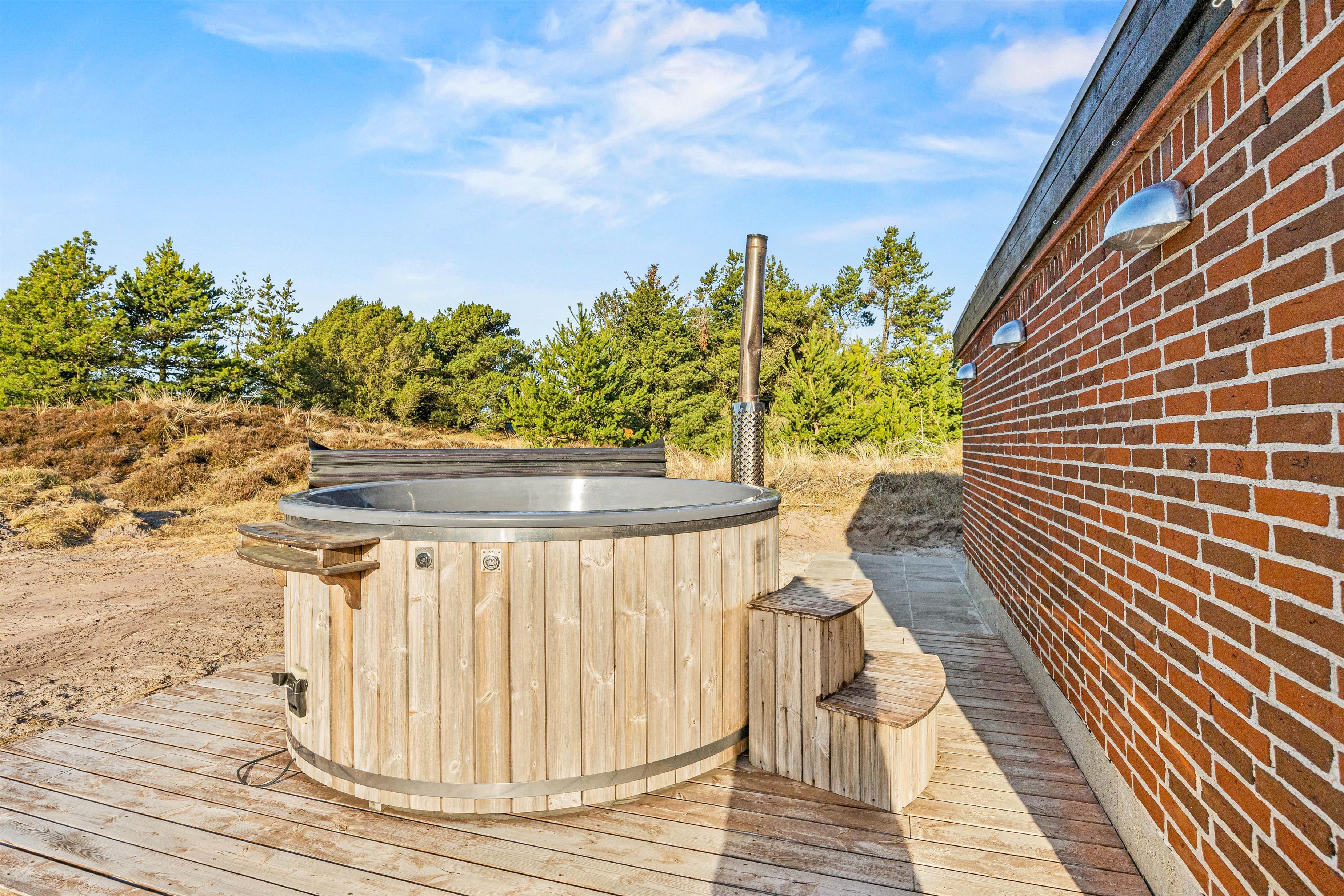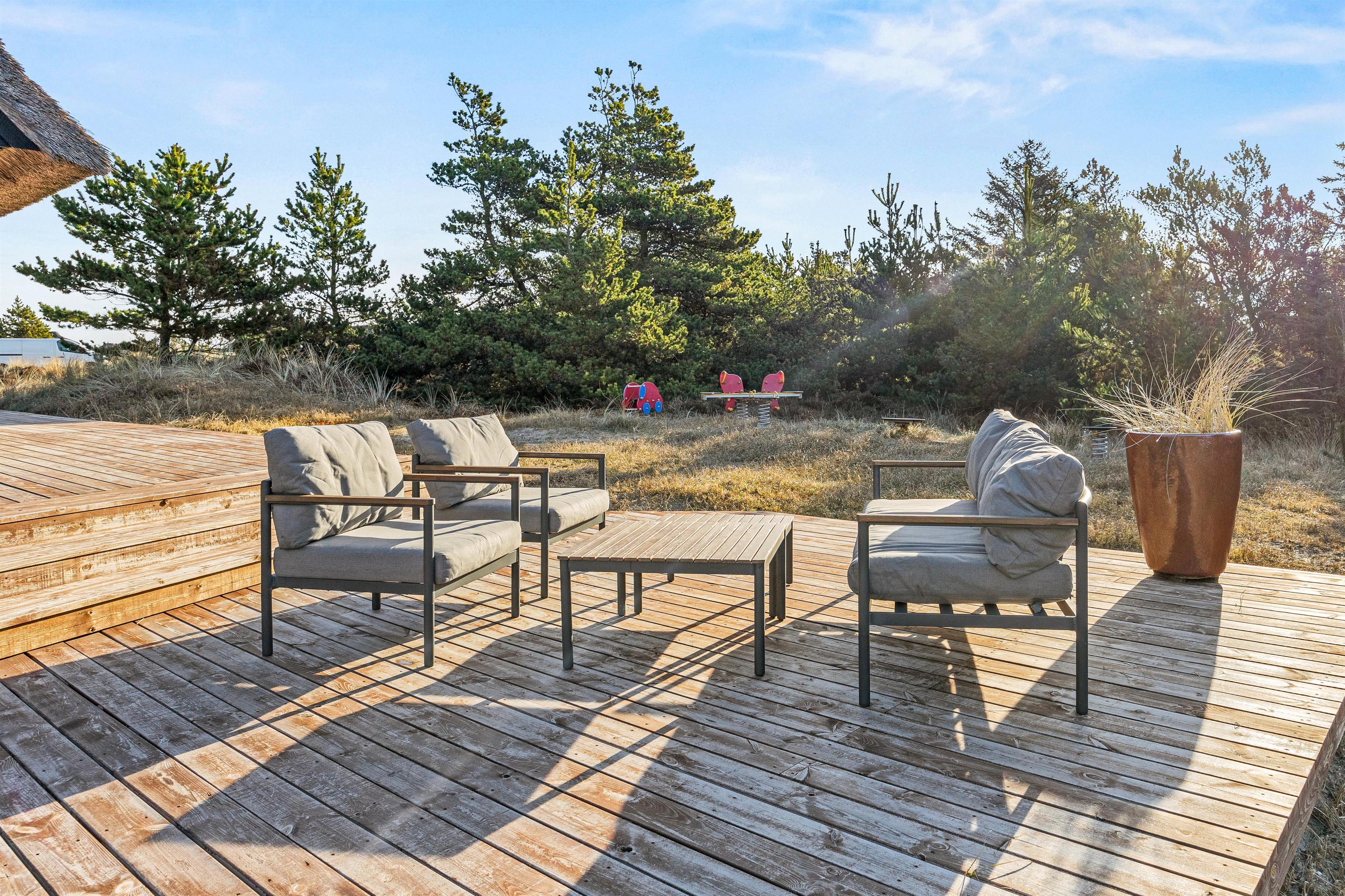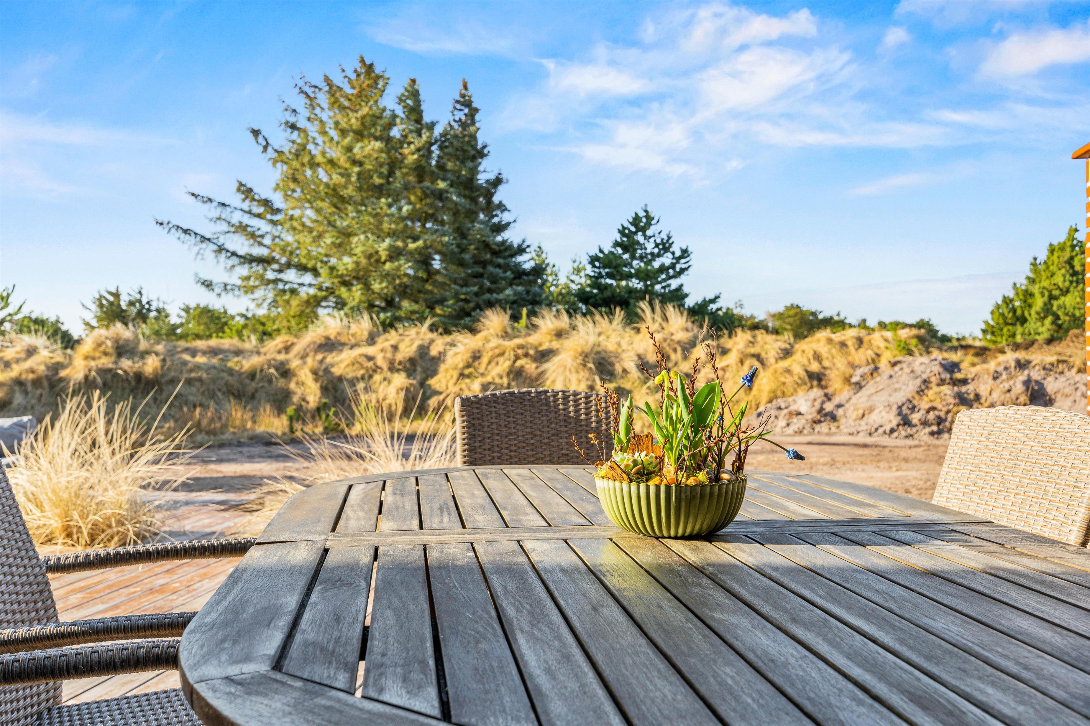 Ferieadressen Lyngvej 5 er mere end retvisende for sommerhusets beliggenhed. Her er I omgivet af den lyngklædte hede, og den naturskønne udsigt kan nydes fra de afskærmede terrasser, som er forbundet med flisesti.