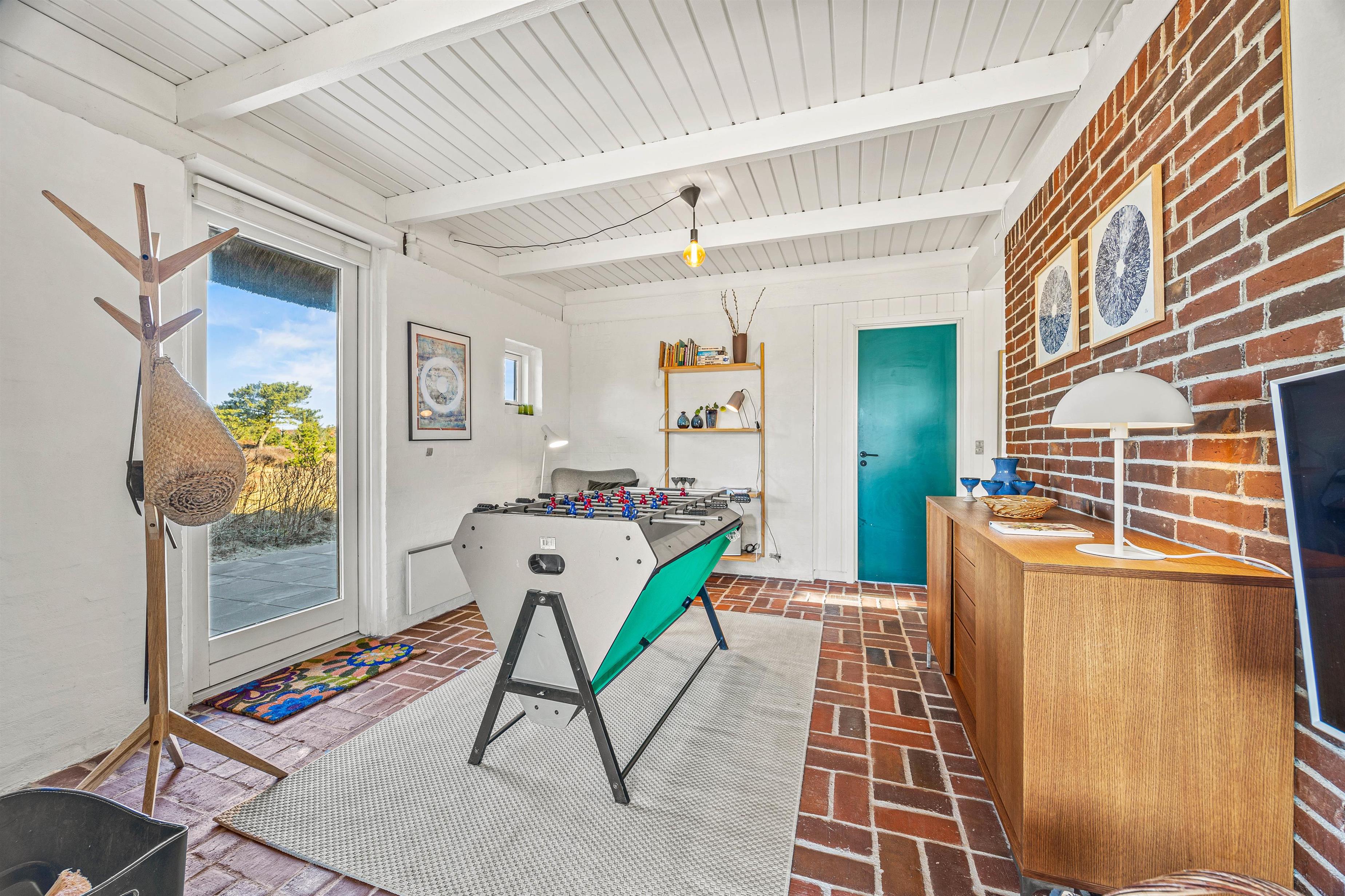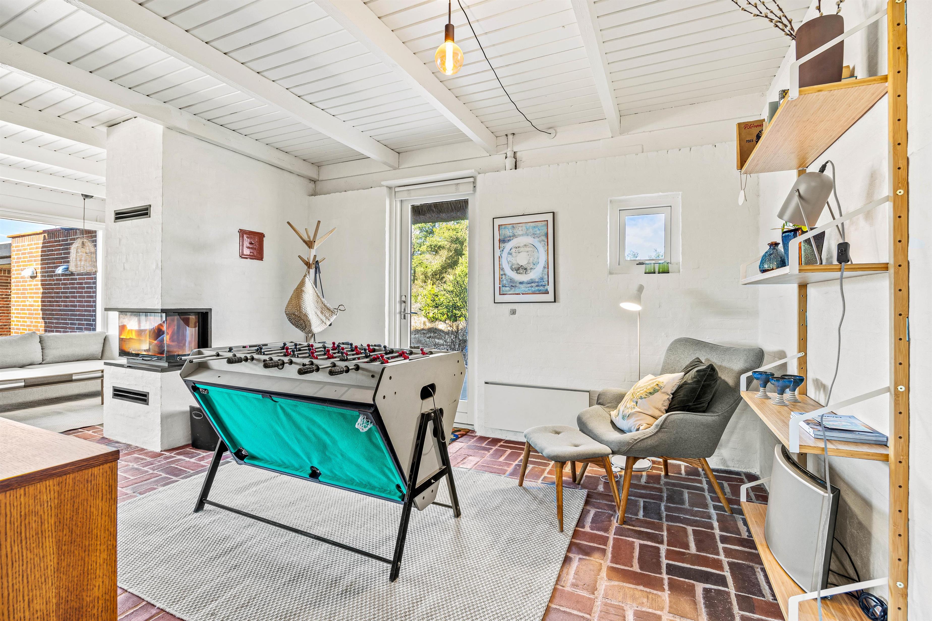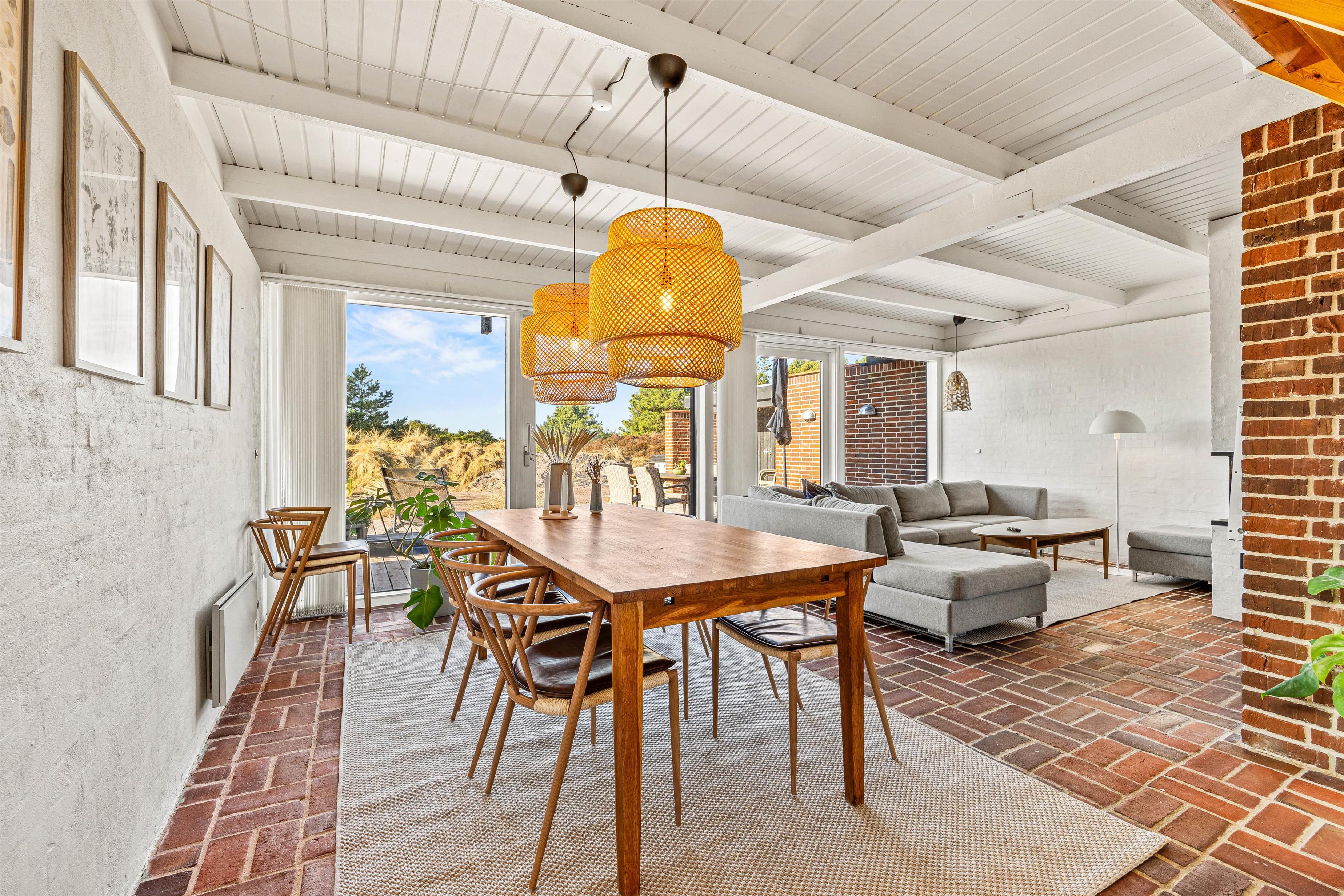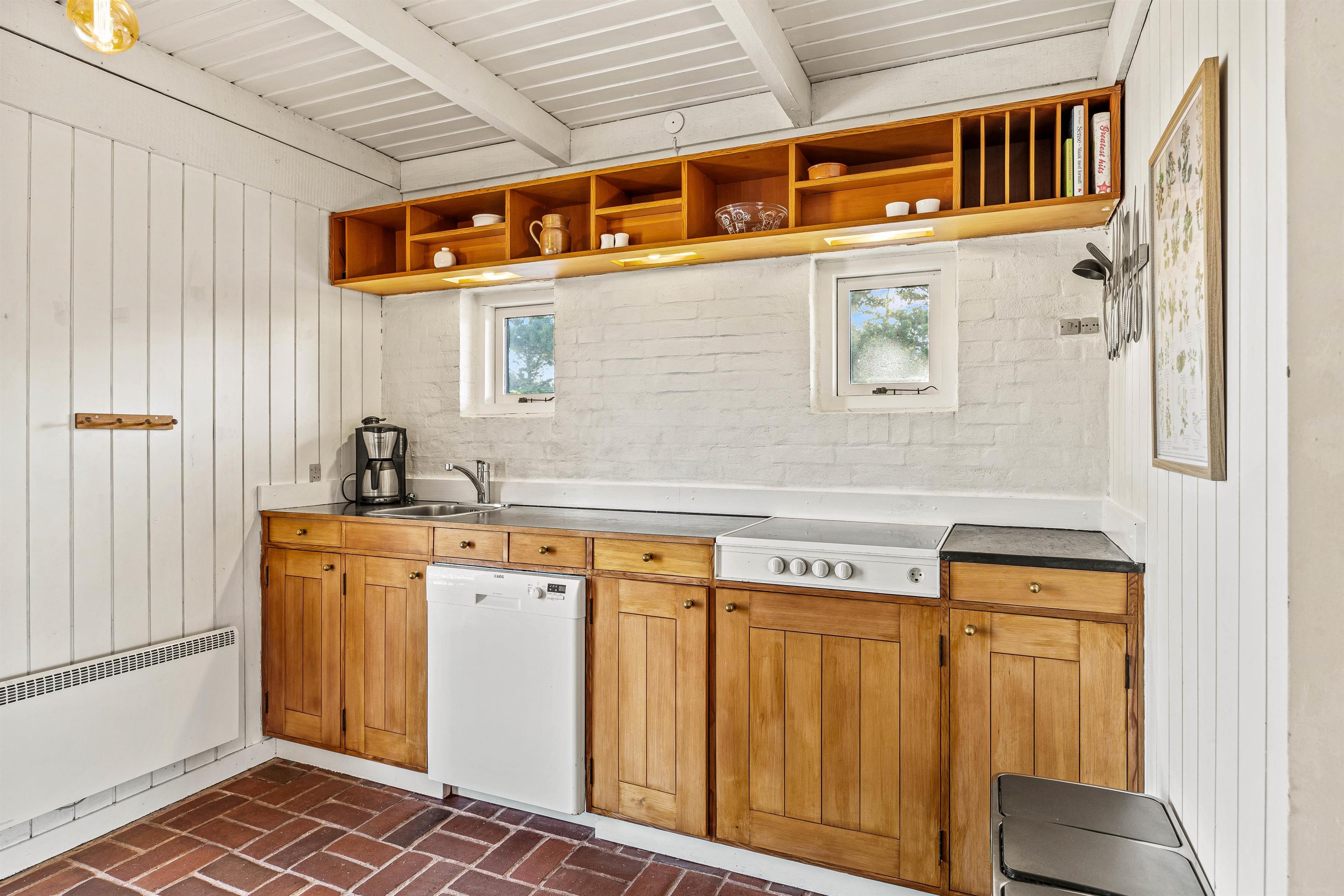 Det røde murstenshus med sit stråtækte tag inviterer til en afslappende sommerhusferie af den helt klassiske slags. Der hersker en charmerende atmosfære indenfor, som hjælpes godt på vej af de synlige loftsbjælker og den detaljerige indretning, blandt andet med brændeovn.