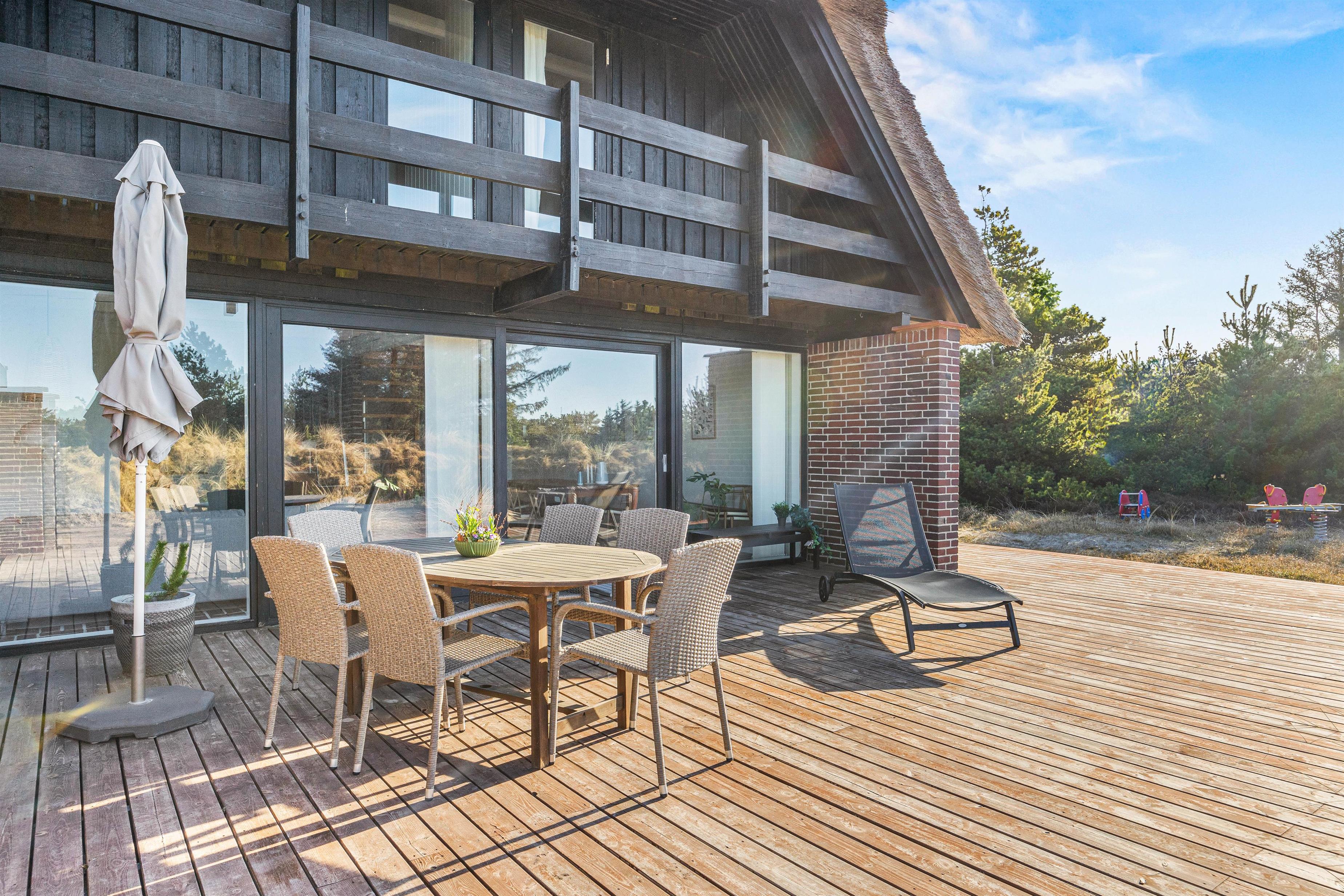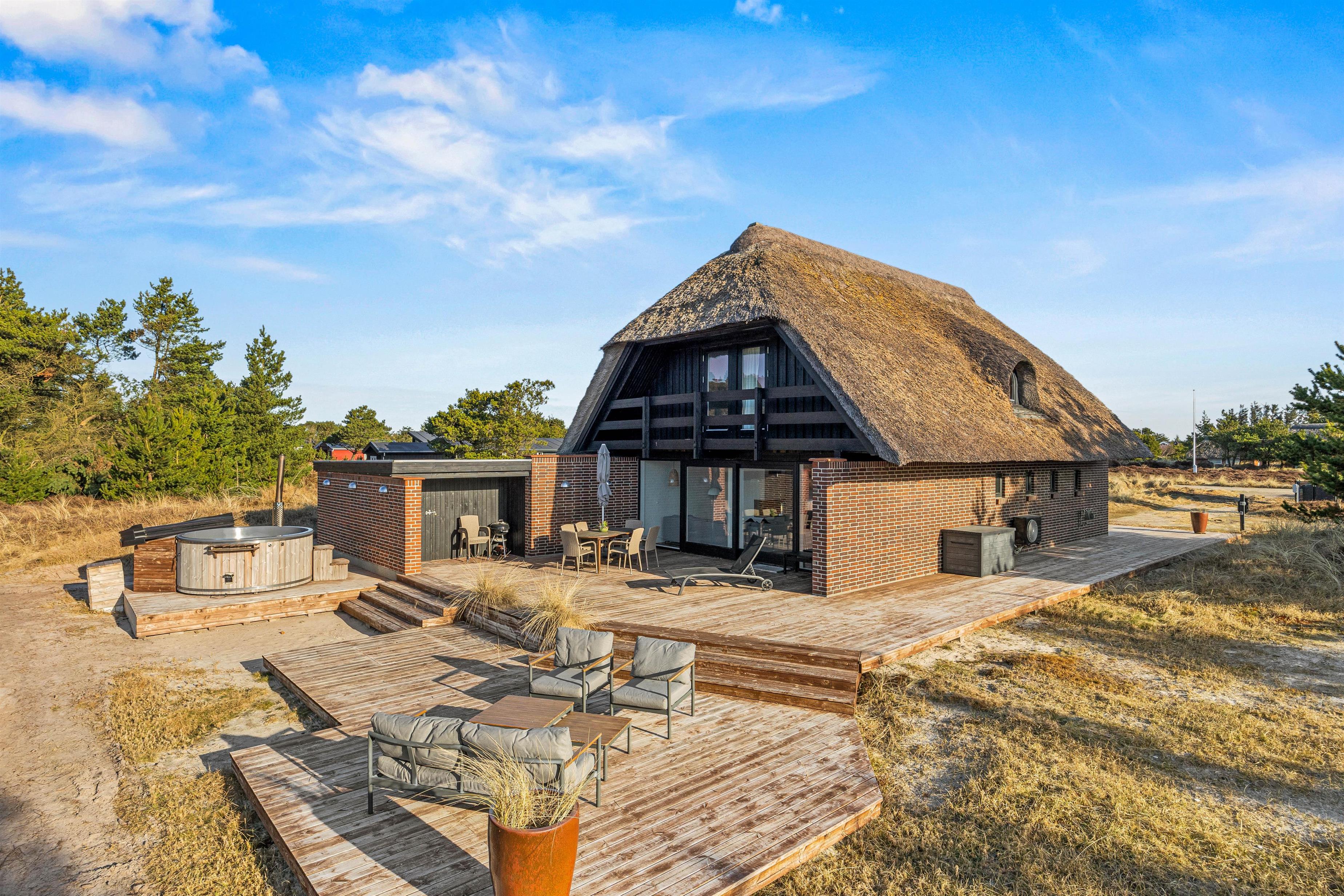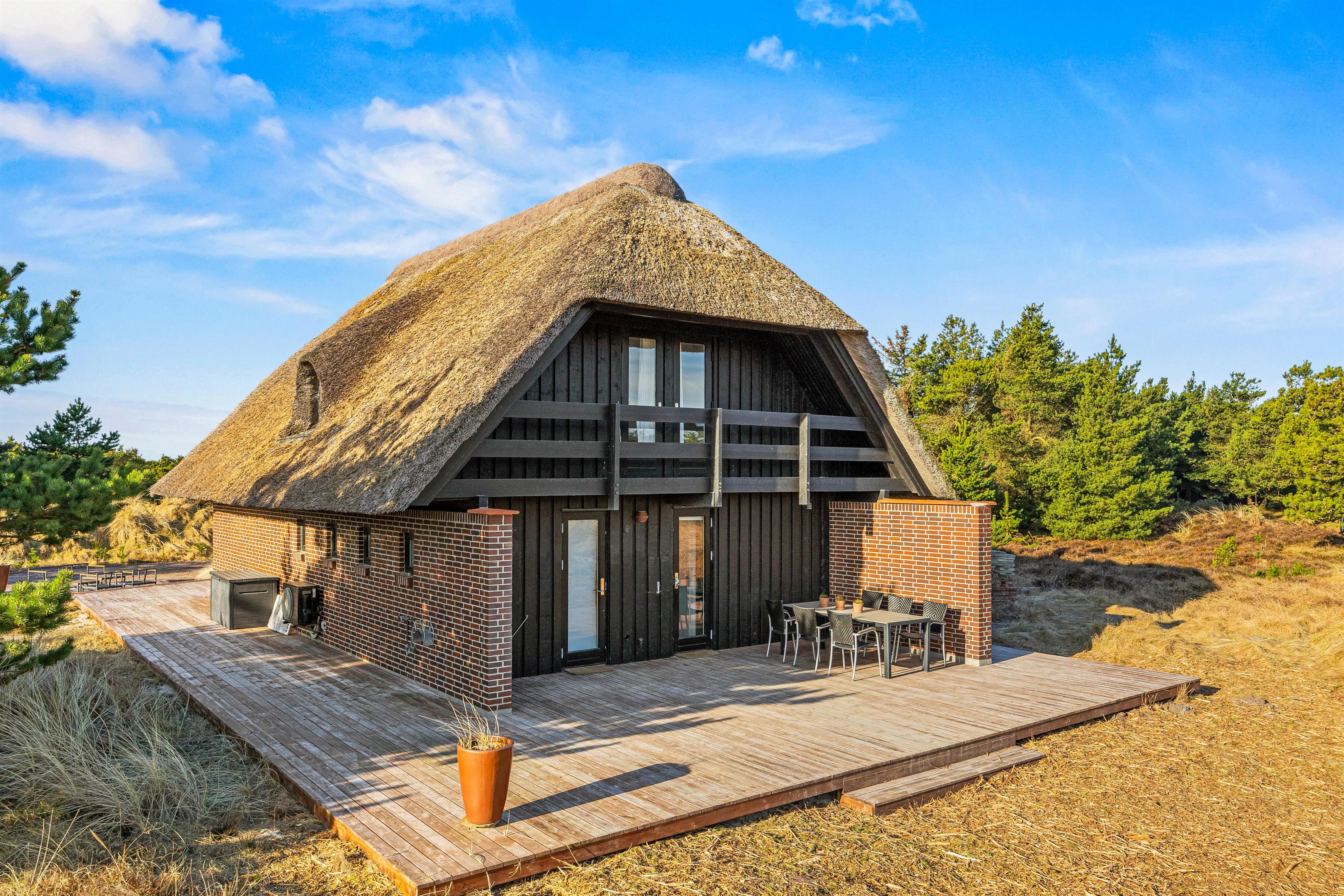 Drømmer I om at bo midt i den vestjyske hede, omgivet af flot natur og kort vej fra stranden? Så er dette stråtækte sommerhus i Grærup en mulig kandidat til jeres næste ferie. Det røde murstenshus er indrettet til 8 personer, og hundene kan også komme med på ferie her. Nyd udsigten fra de afskærmede terrasser – eller fra balkonen, der giver et ekstra flot panoramaudsyn til landskabet.