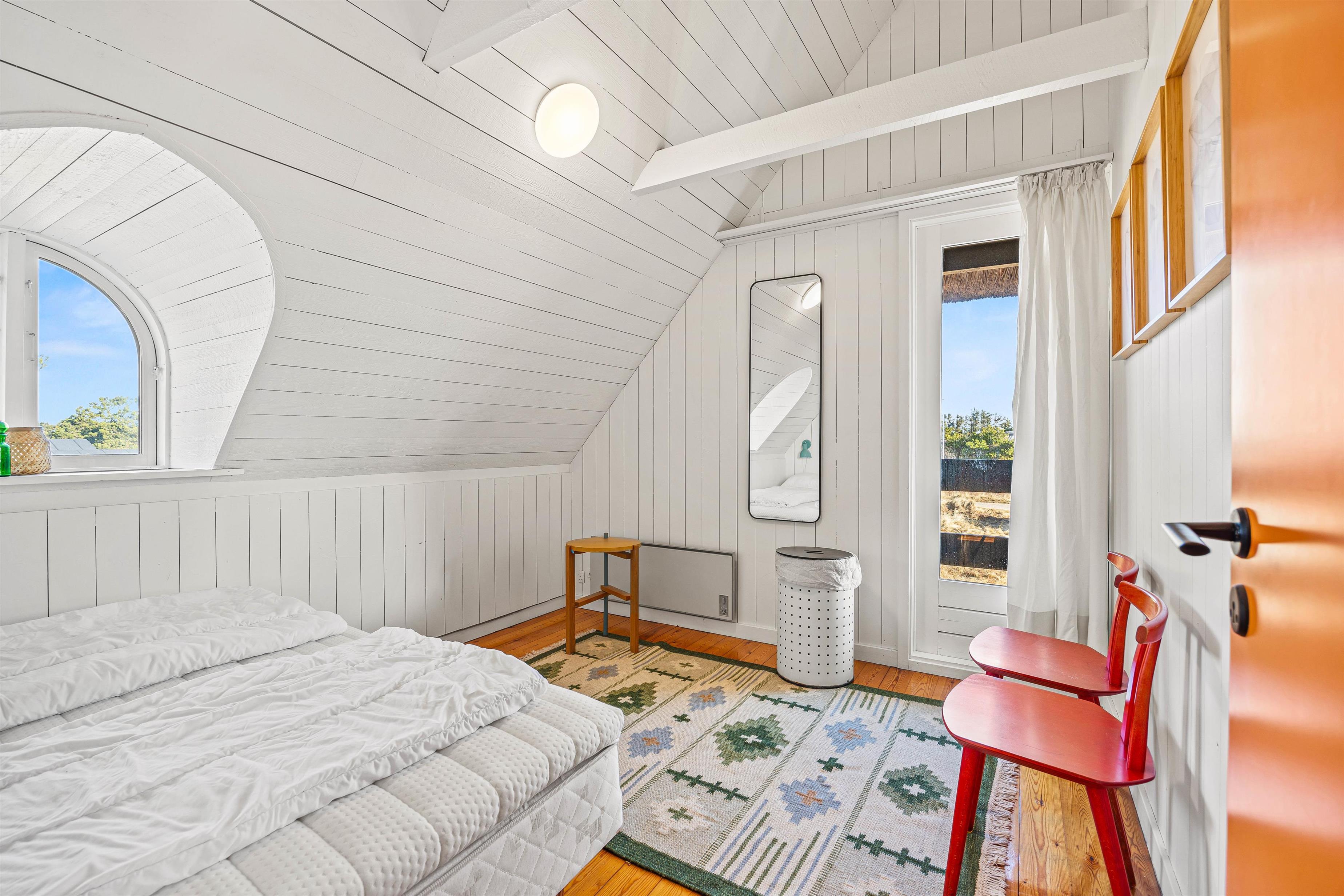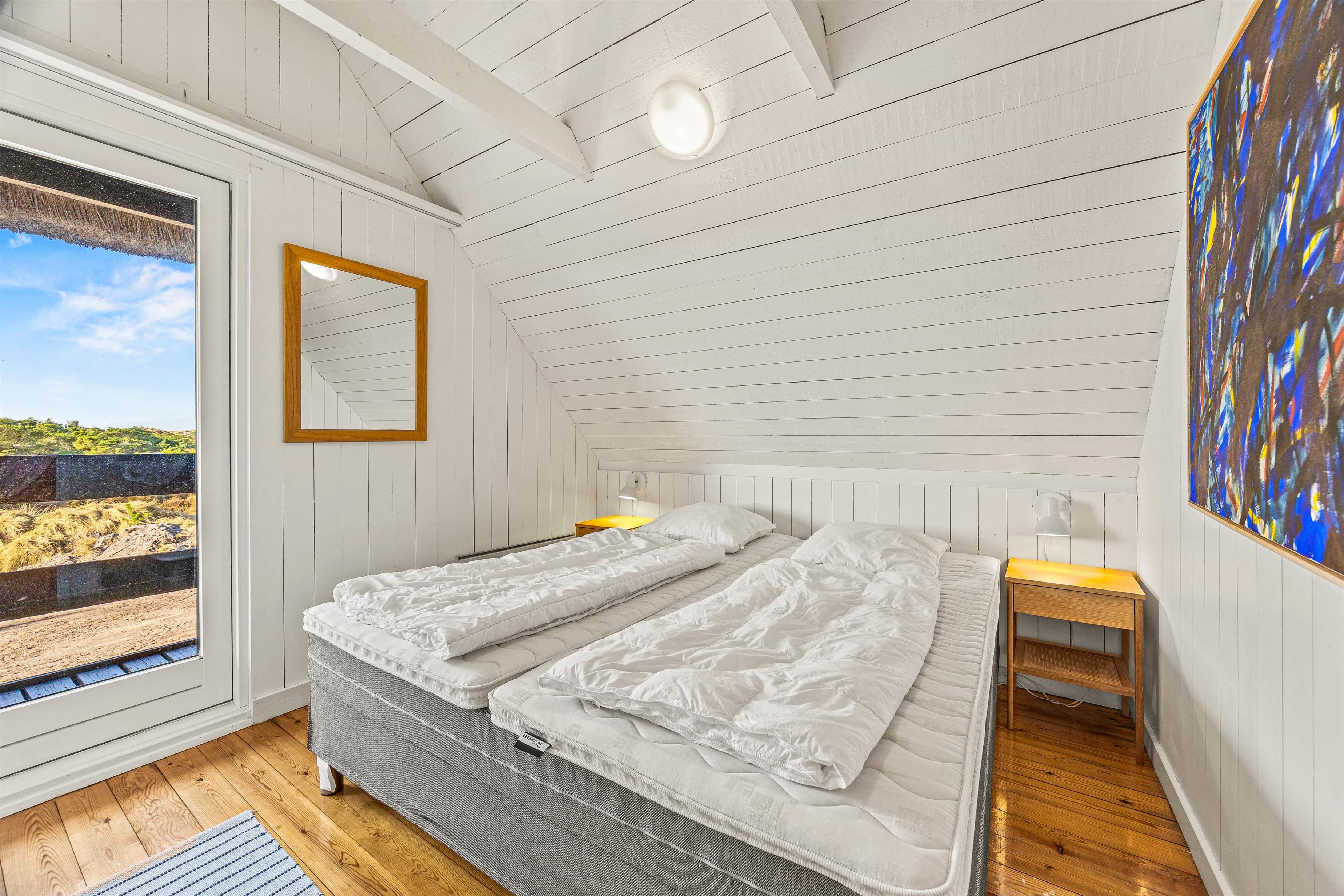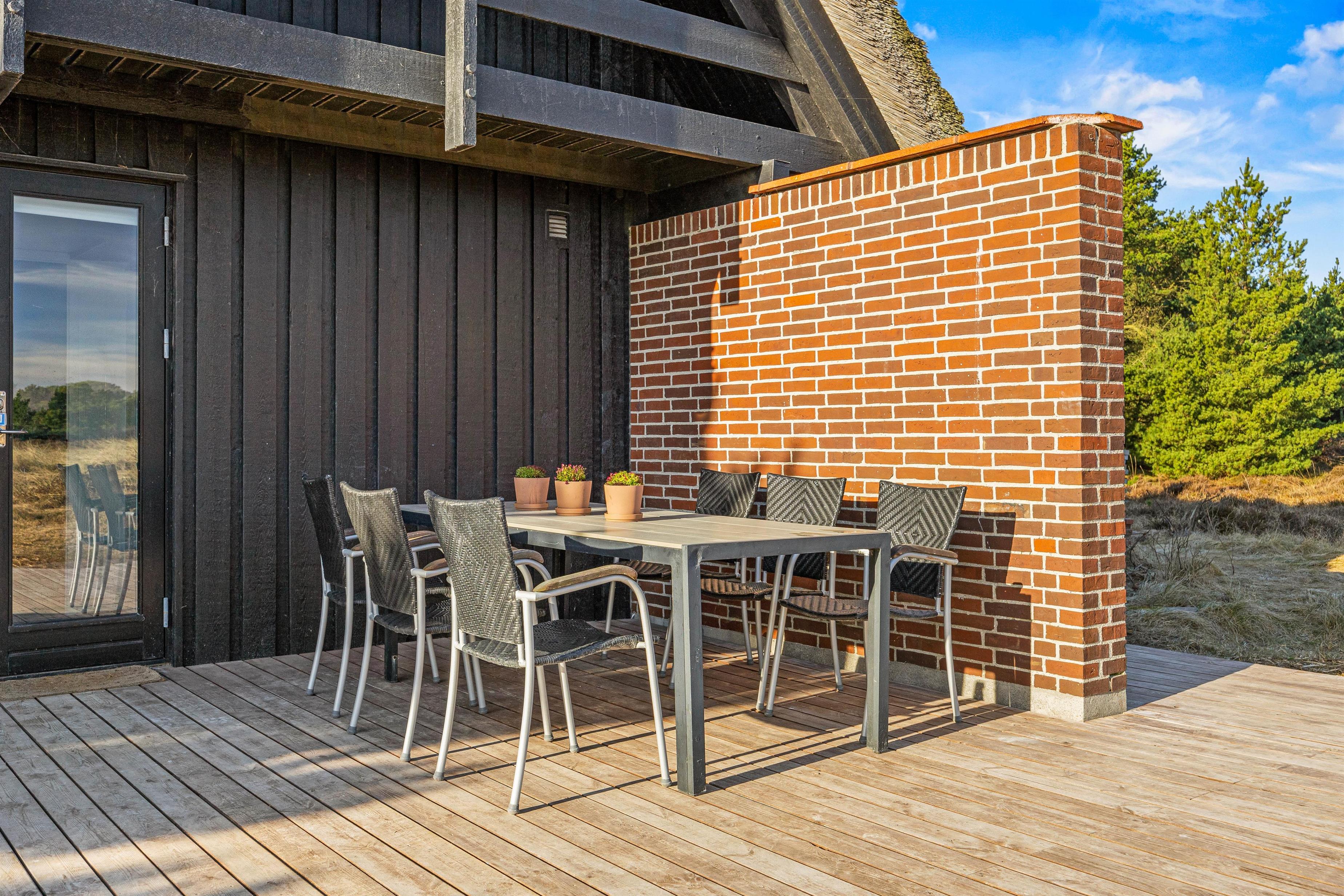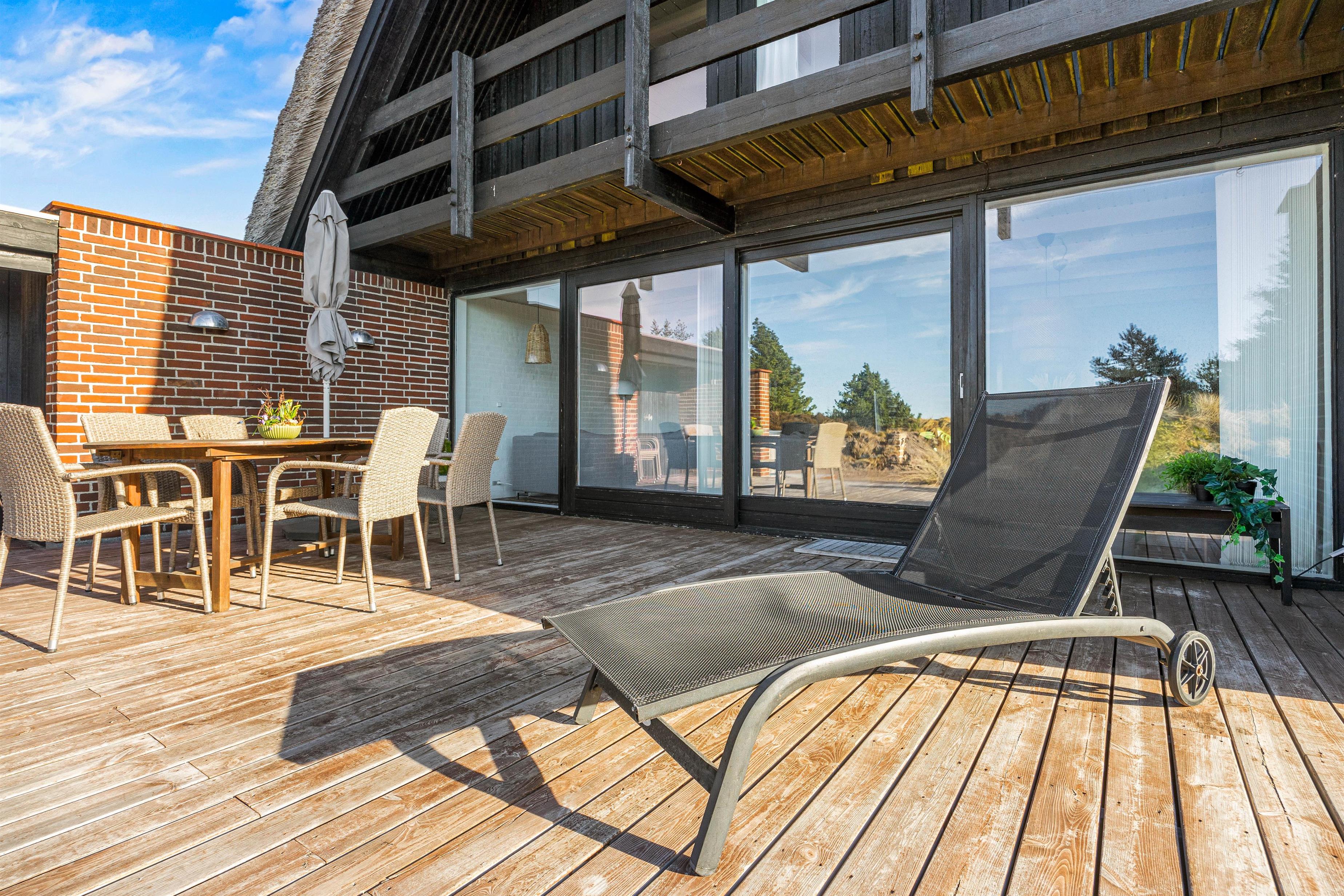 Drømmer I om at bo midt i den vestjyske hede, omgivet af flot natur og kort vej fra stranden? Så er dette stråtækte sommerhus i Grærup en mulig kandidat til jeres næste ferie. Det røde murstenshus er indrettet til 8 personer, og hundene kan også komme med på ferie her. Nyd udsigten fra de afskærmede terrasser – eller fra balkonen, der giver et ekstra flot panoramaudsyn til landskabet.