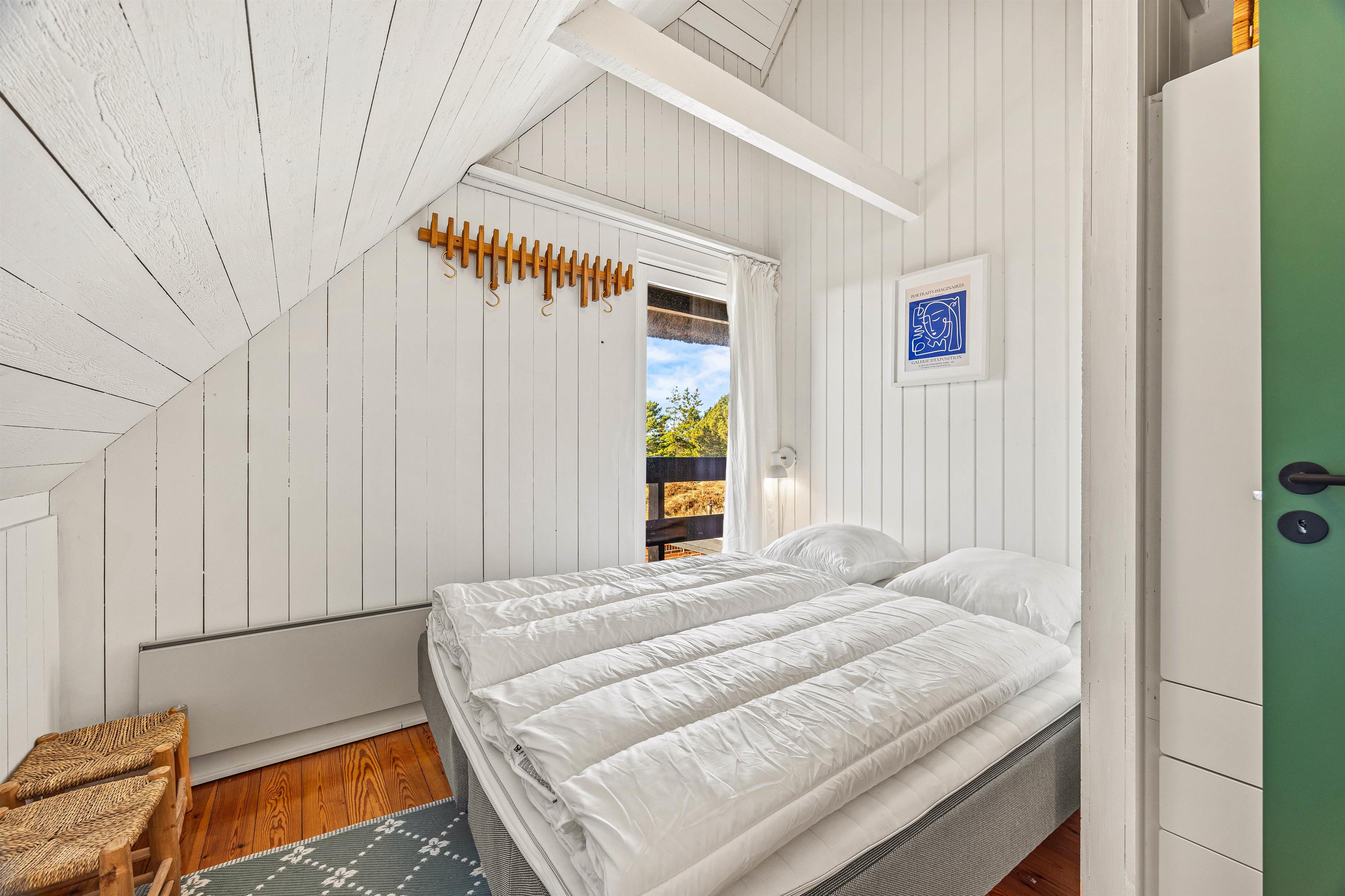De 133 kvadratmeter er fordelt på to etager og er indrettet til 8 feriegæster. I stueetagen finder I en hyggelig stue med en flot udsigt igennem det store vinduesparti og en moderne brændeovn som giver varme og hygge på de kølige aftener, en rummelig spisestue, et funktionelt køkken og et badeværelse som blev renoveret i 2025. På første sal ligger de 4 soveværelser – alle 4 med dobbeltseng – alle med udgang til svalegang hvorfra I har en fænomenal udsigt over heden udover de 4 værelse finder I også et gæstetoilet som blev renoveret i 2025 på 1. salen.
