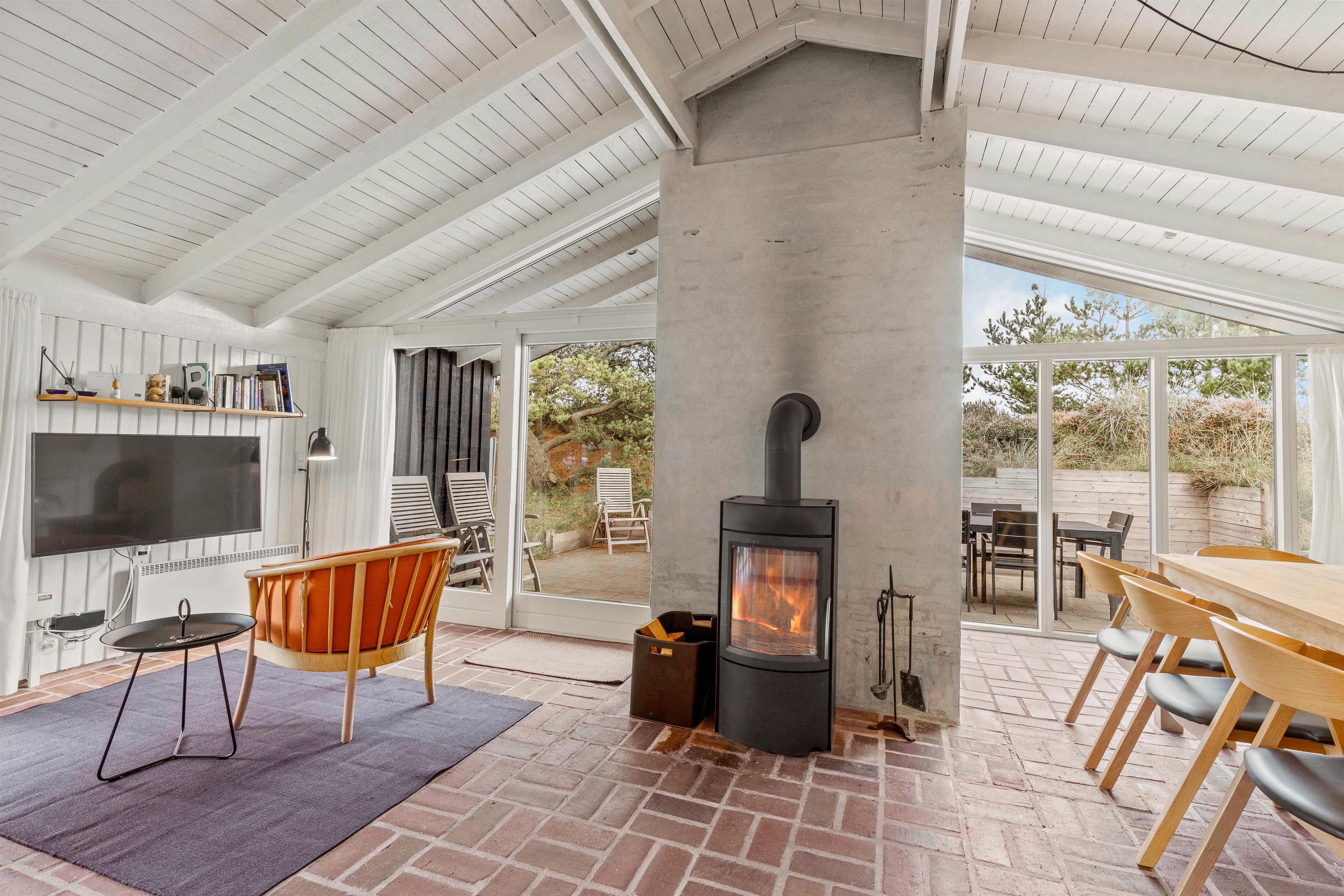 Feriehuset er indrettet i en charmerende stil med hvide trævægge, komfortabelt interiør og brændeovn, og omgivelserne emmer i det hele taget af klassisk sommerhusstemning. Gennem de mange vinduer, særligt i opholdsrummet, har I en skøn udsigt til den grønne natur, der omgiver jer – og samtidig er I sikret et godt lysindfald i sommerhusets fællesrum.