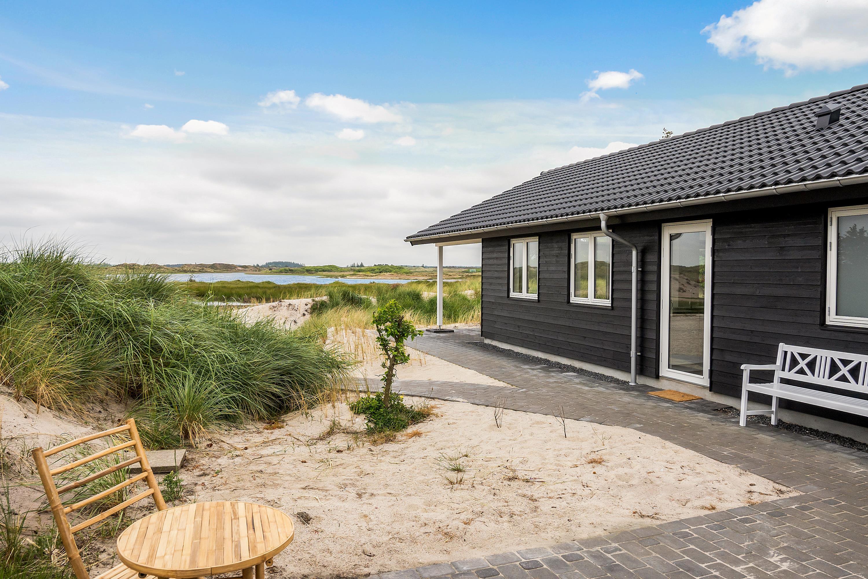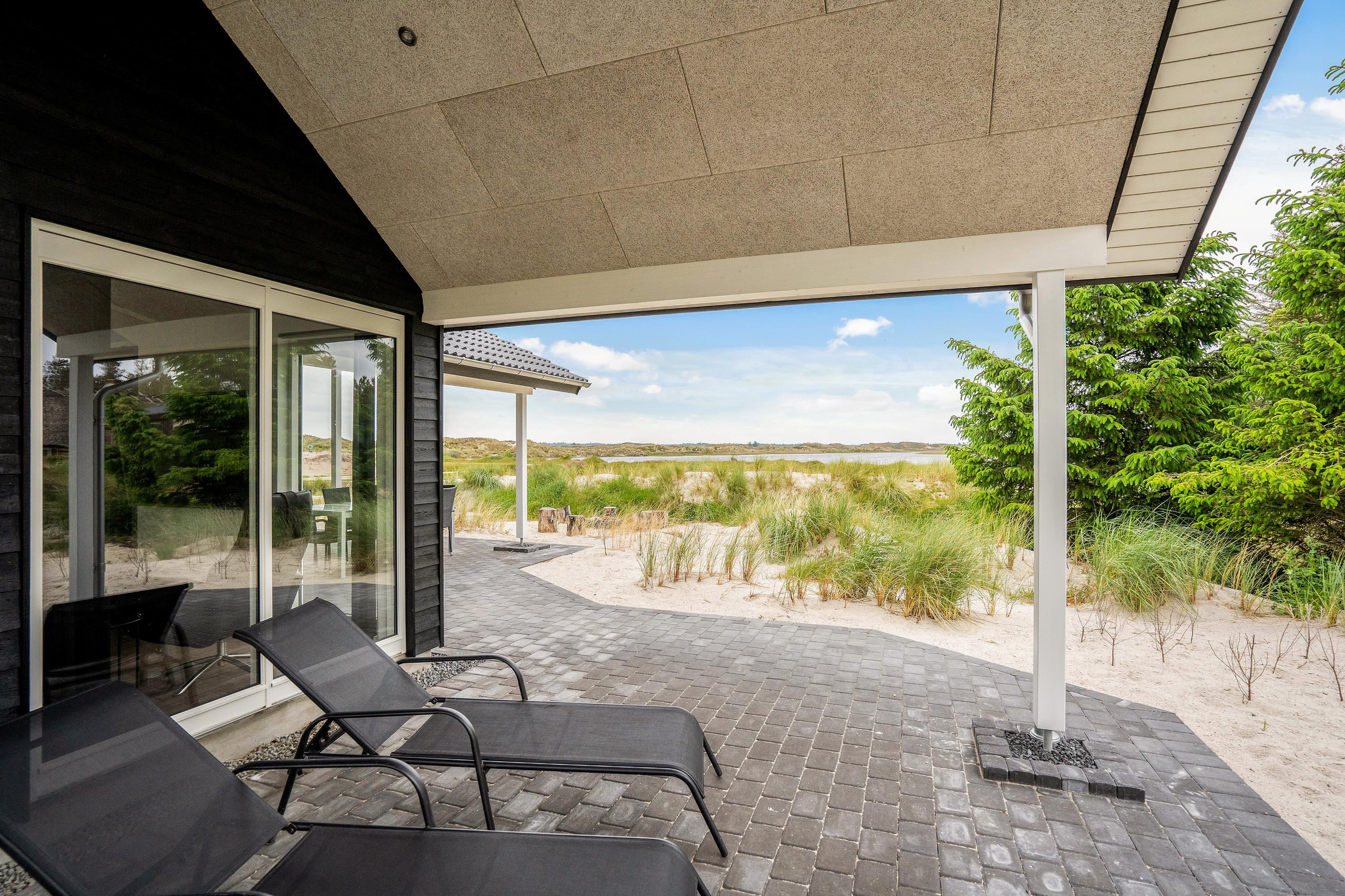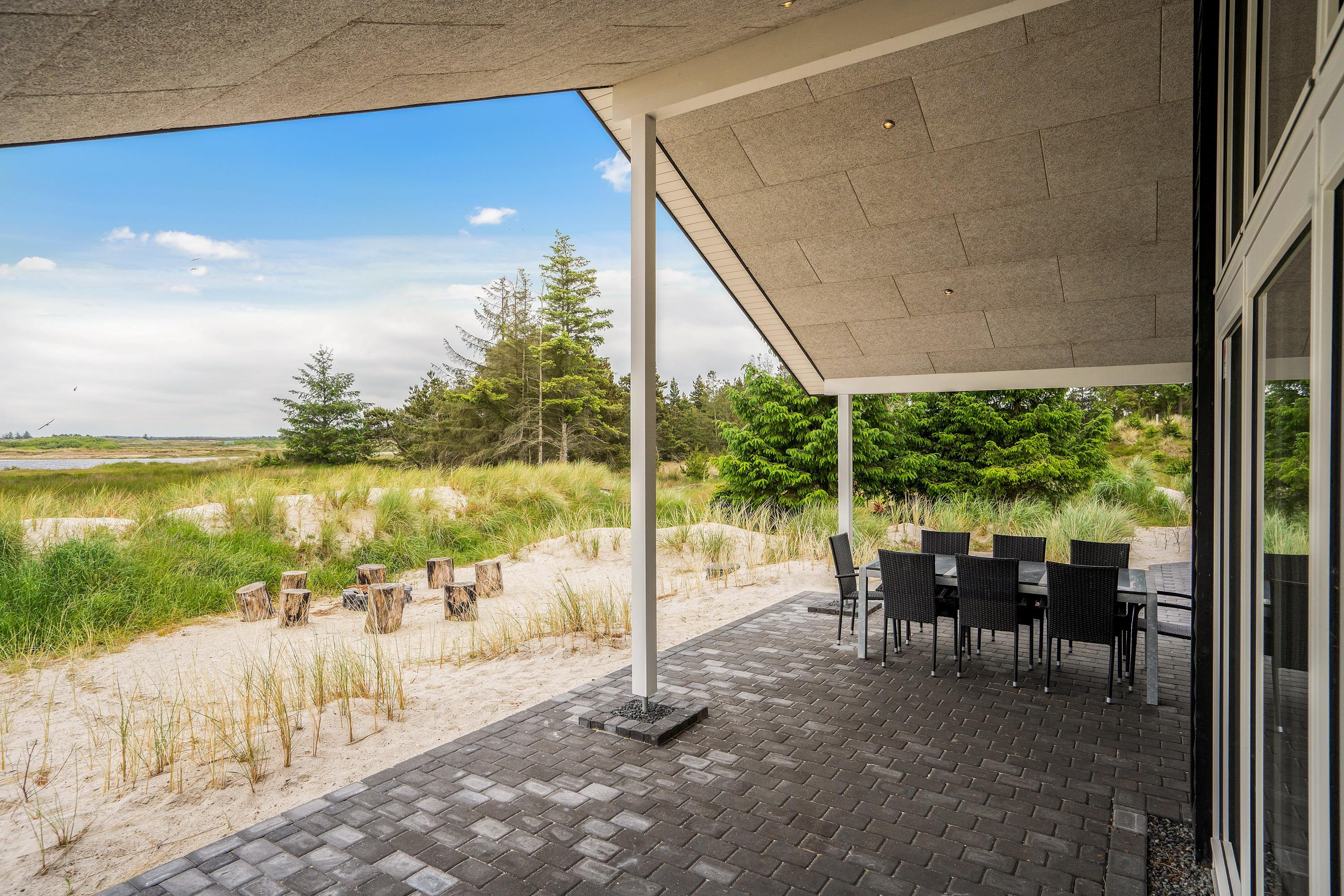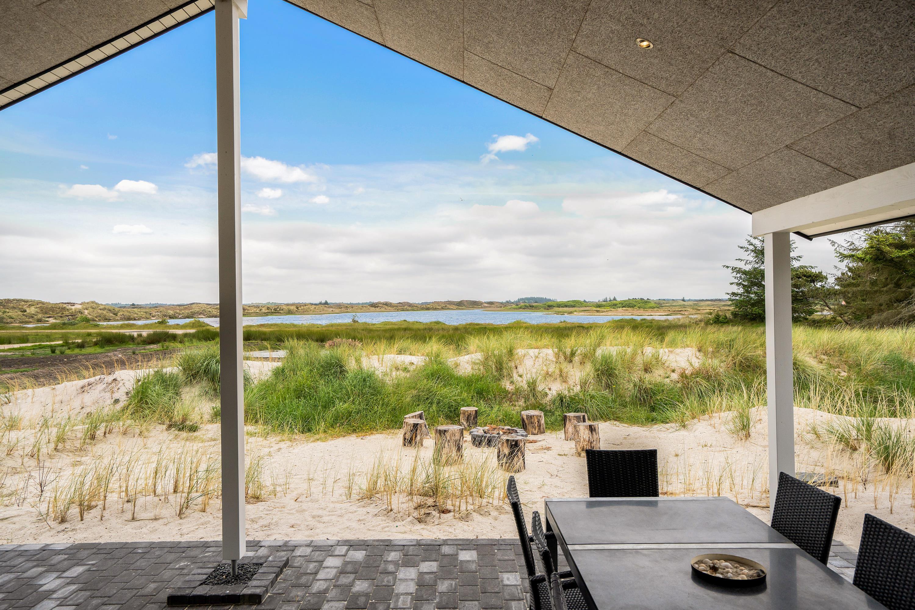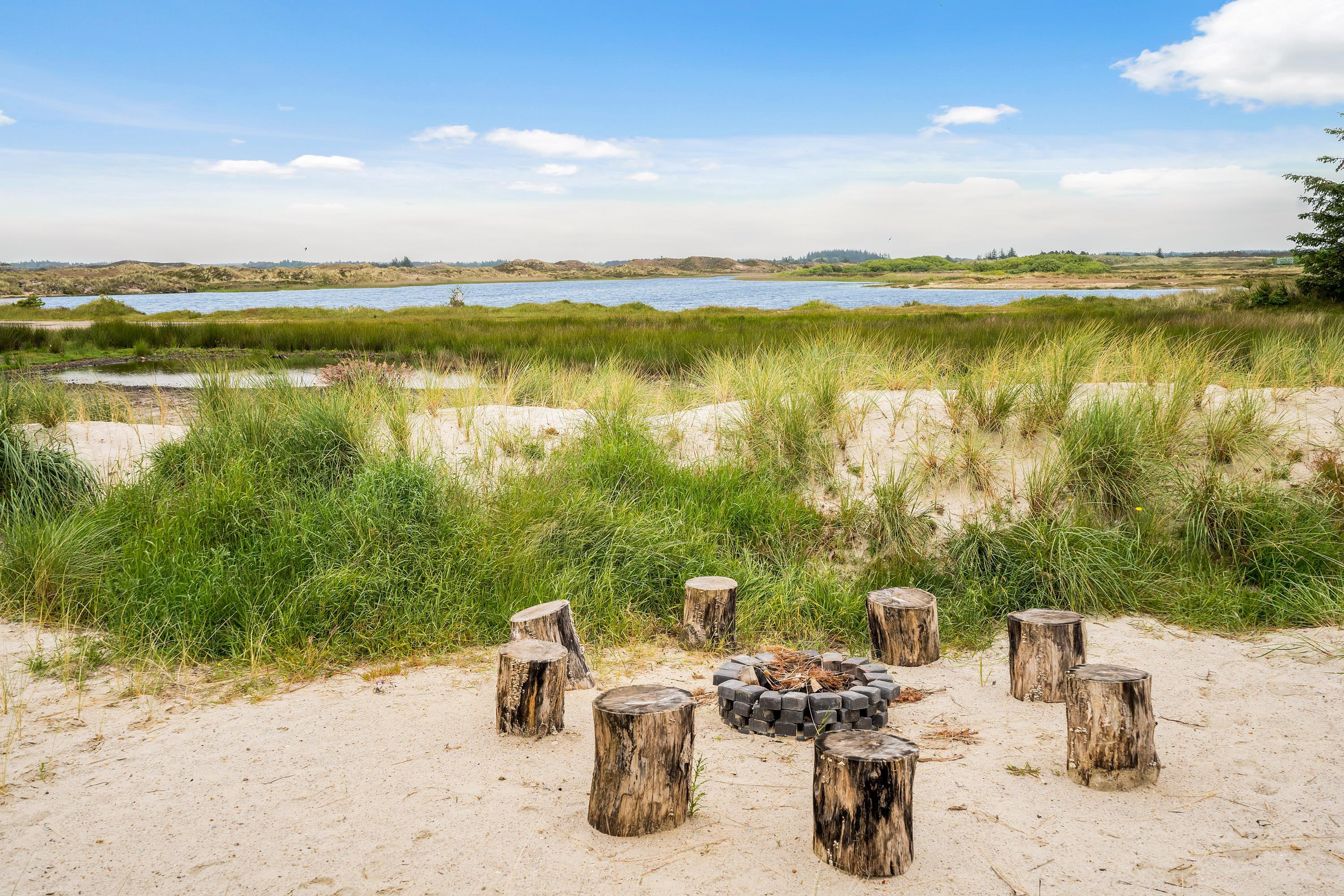 Til sommerhuset hører en stor terrasse. Fra terrassen har I også en fantastisk udsigt til søen og Grærups klitlandskab.