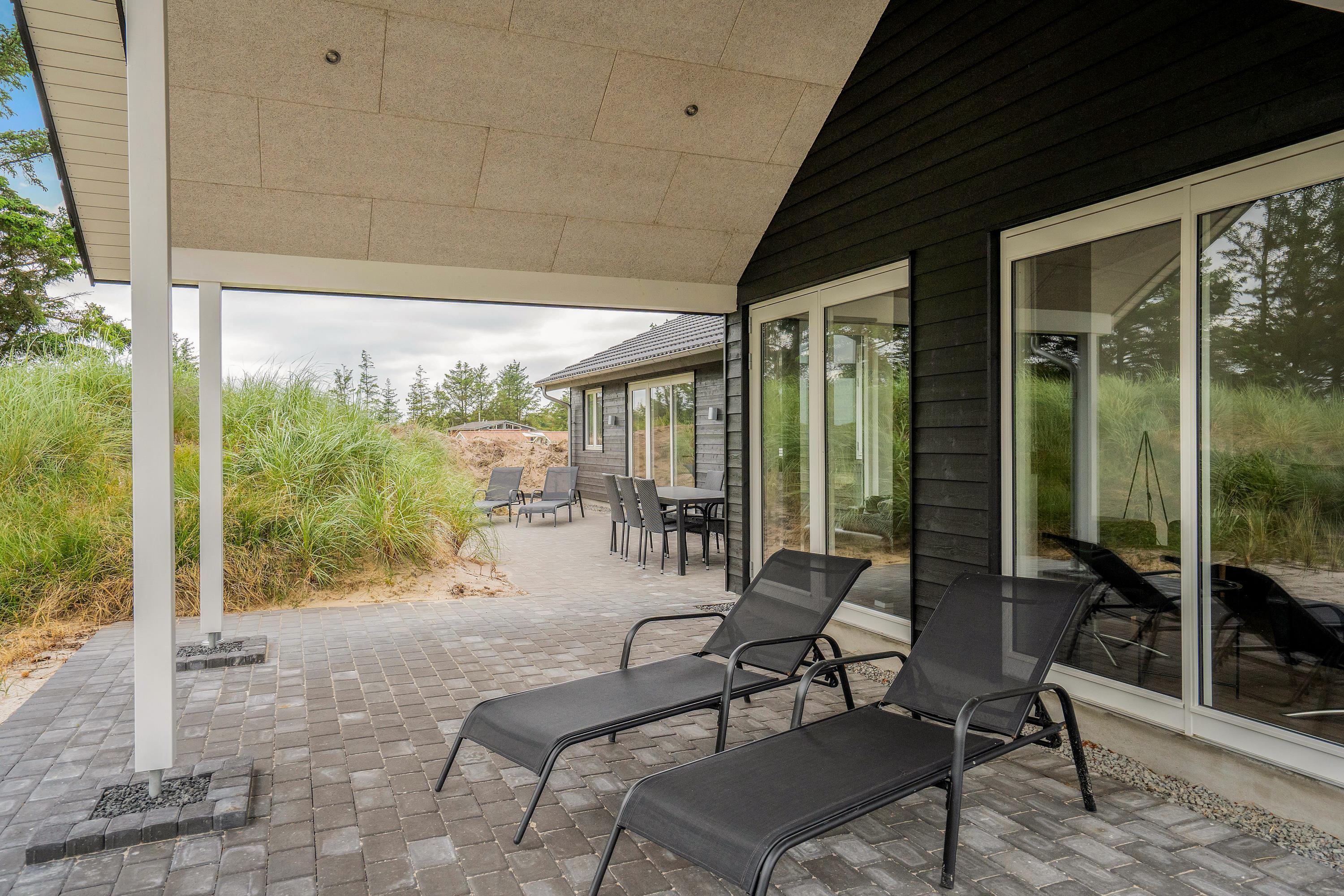 Feriehusets terrasse er delvis overdækket. Det giver jer mulighed for at nyde en masse tid udendørs, uanset hvordan vejret arter sig under jeres ferie. Til terrassen hører også havemøbler, liggestole og grill, hvormed I kan få mest muligt ud af feriens solskinsdage og nyde dem i fulde drag.