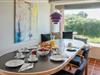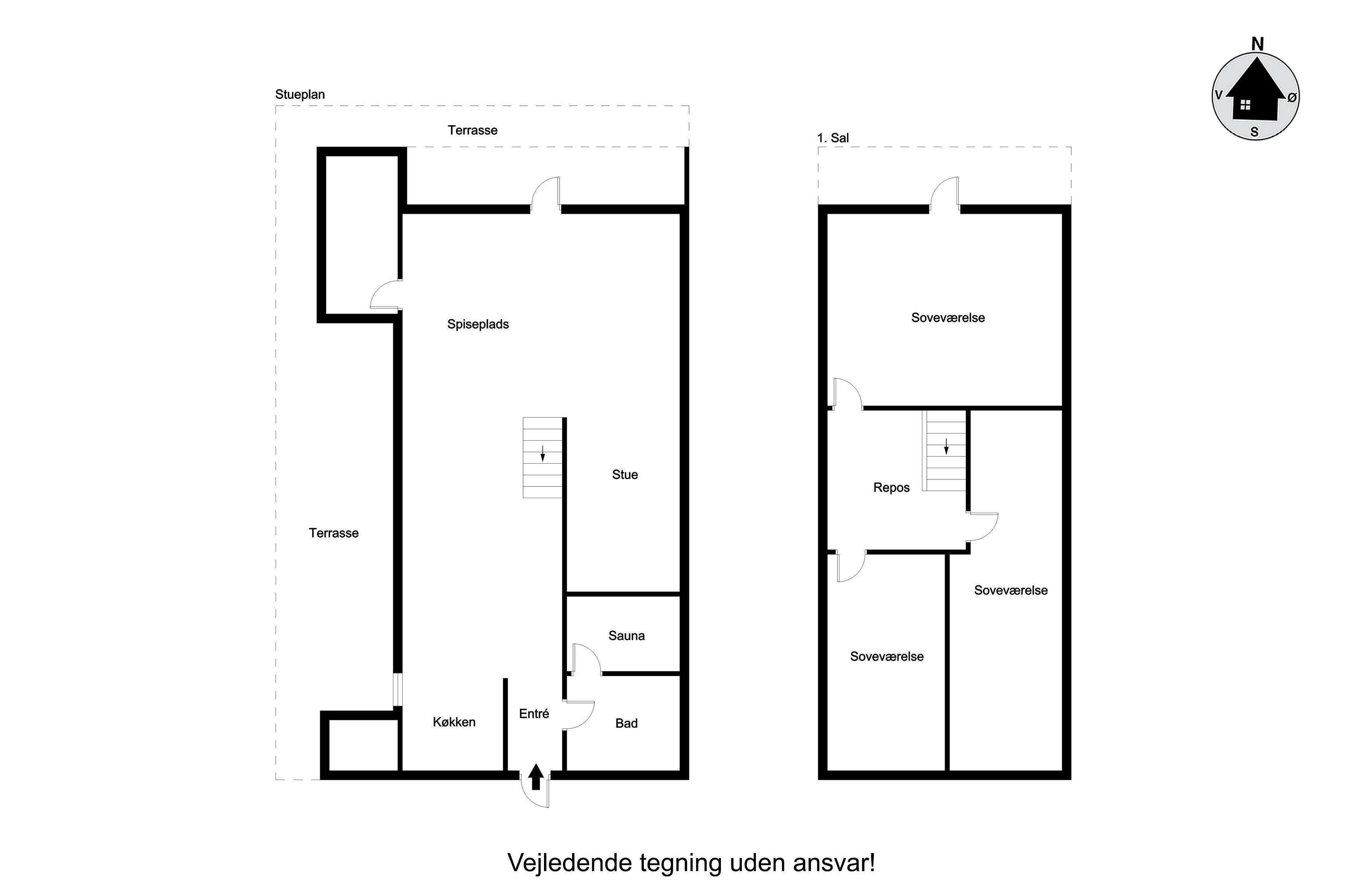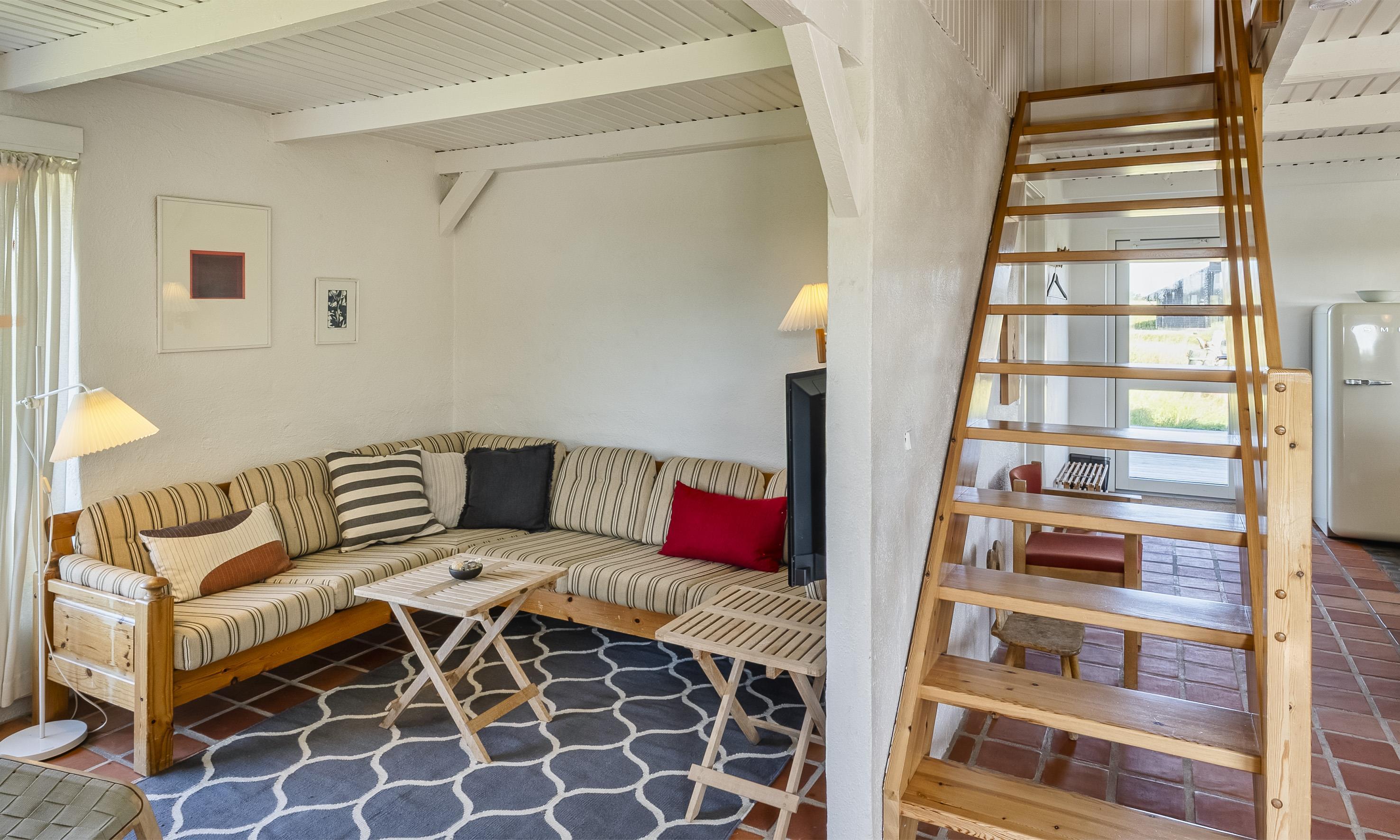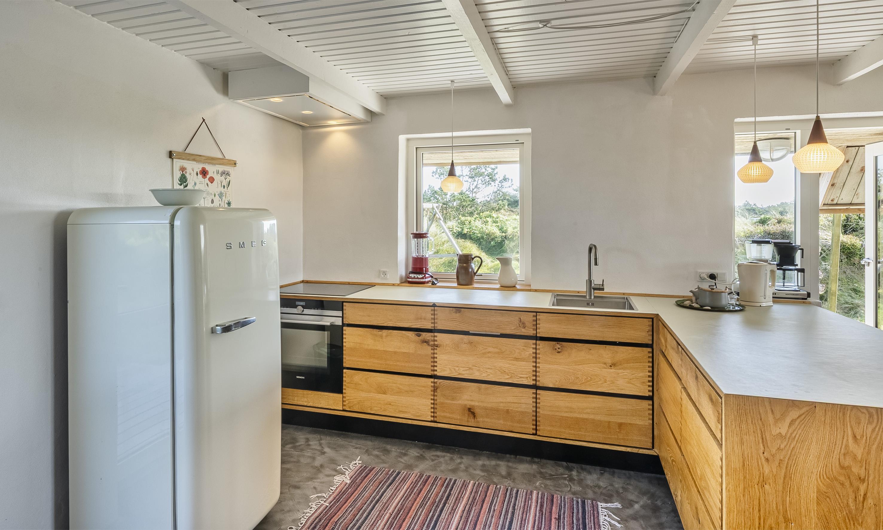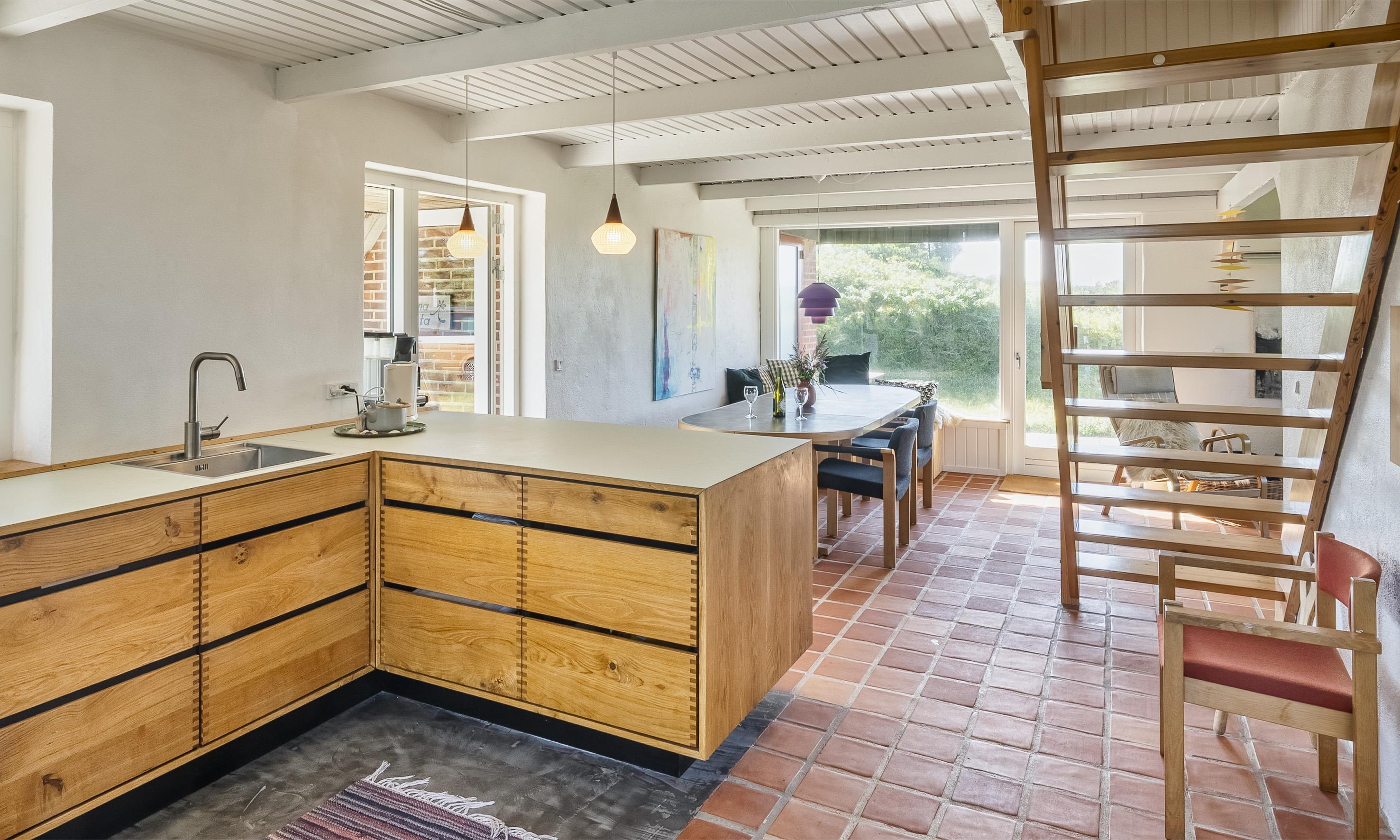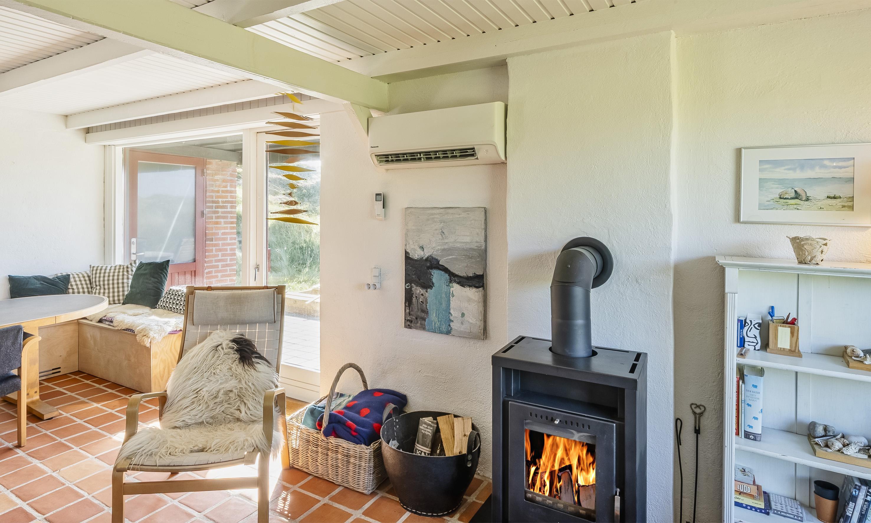 Sommerhuset er i to plan og har en gennemtænkt indretning med masser af lys og hyggeligt opholdsrum. I stueplan finder I et rustikt, men moderne køkken i åben forbindelse med spisepladsen, perfekt til fælles madlavning og hyggelige måltider. Herfra er der direkte udgang til solrige terrasser, hvor I kan nyde havbrisen. Stuen indbyder til afslapning foran brændeovnen på kølige dage, og den energivenlige varmepumpe sørger for et behageligt indeklima året rundt.