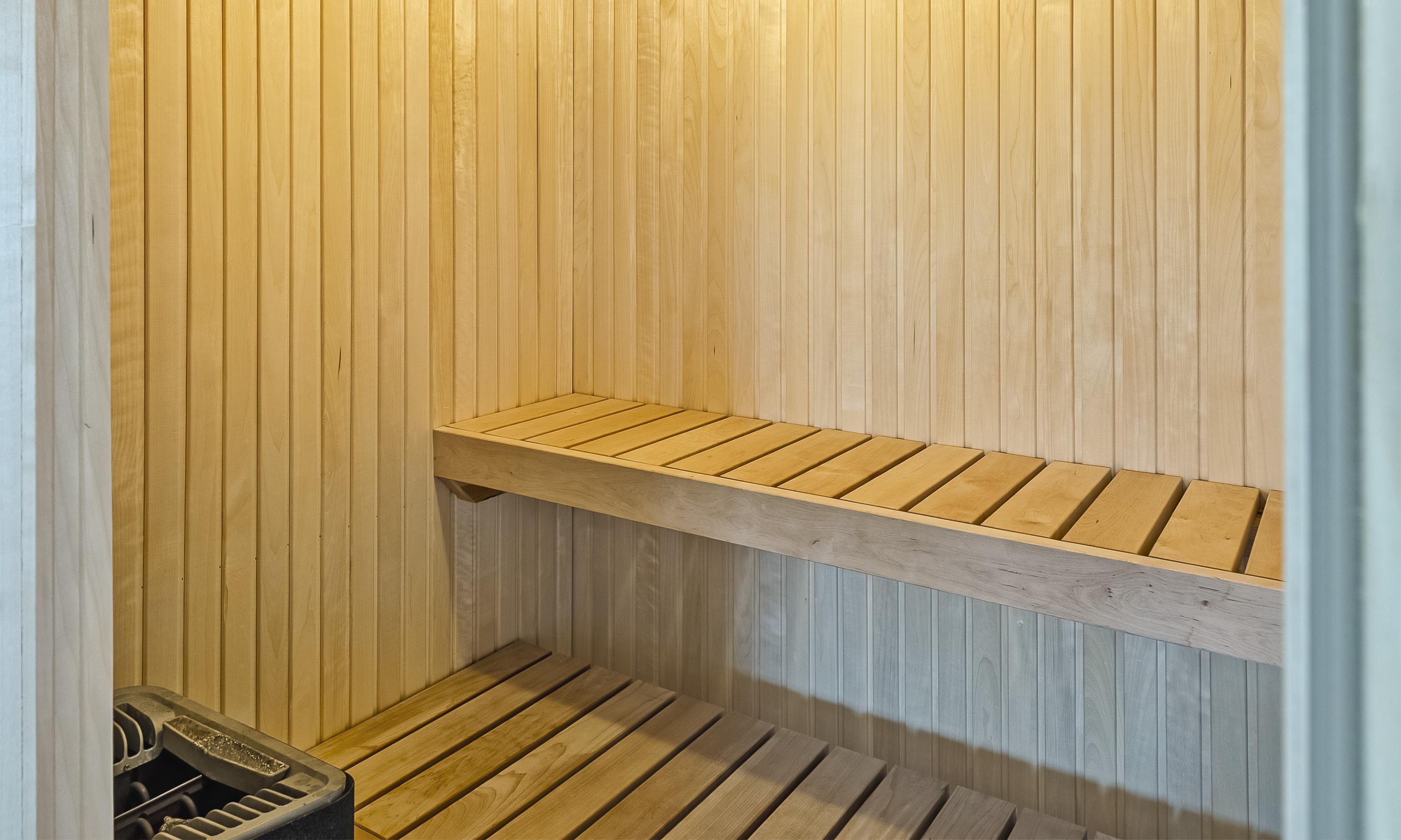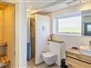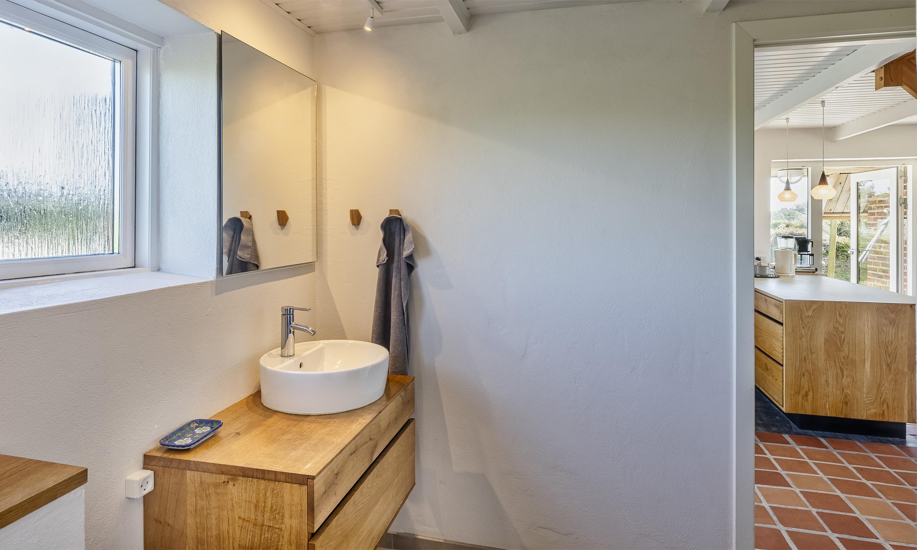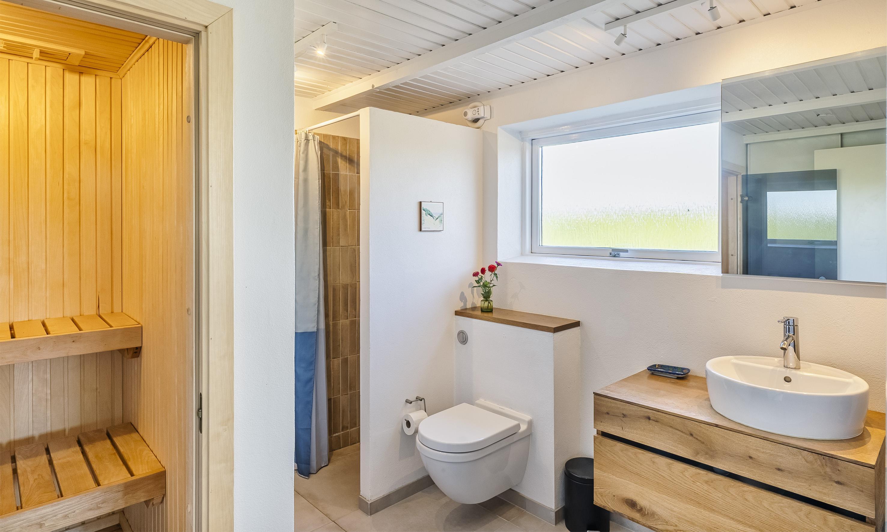 Badeværelset er udstyret med gulvvarme, bruser, toilet, håndvask, vaskemaskine – og ikke mindst en skøn sauna, hvor I kan varme jer efter en dag i den friske havluft.