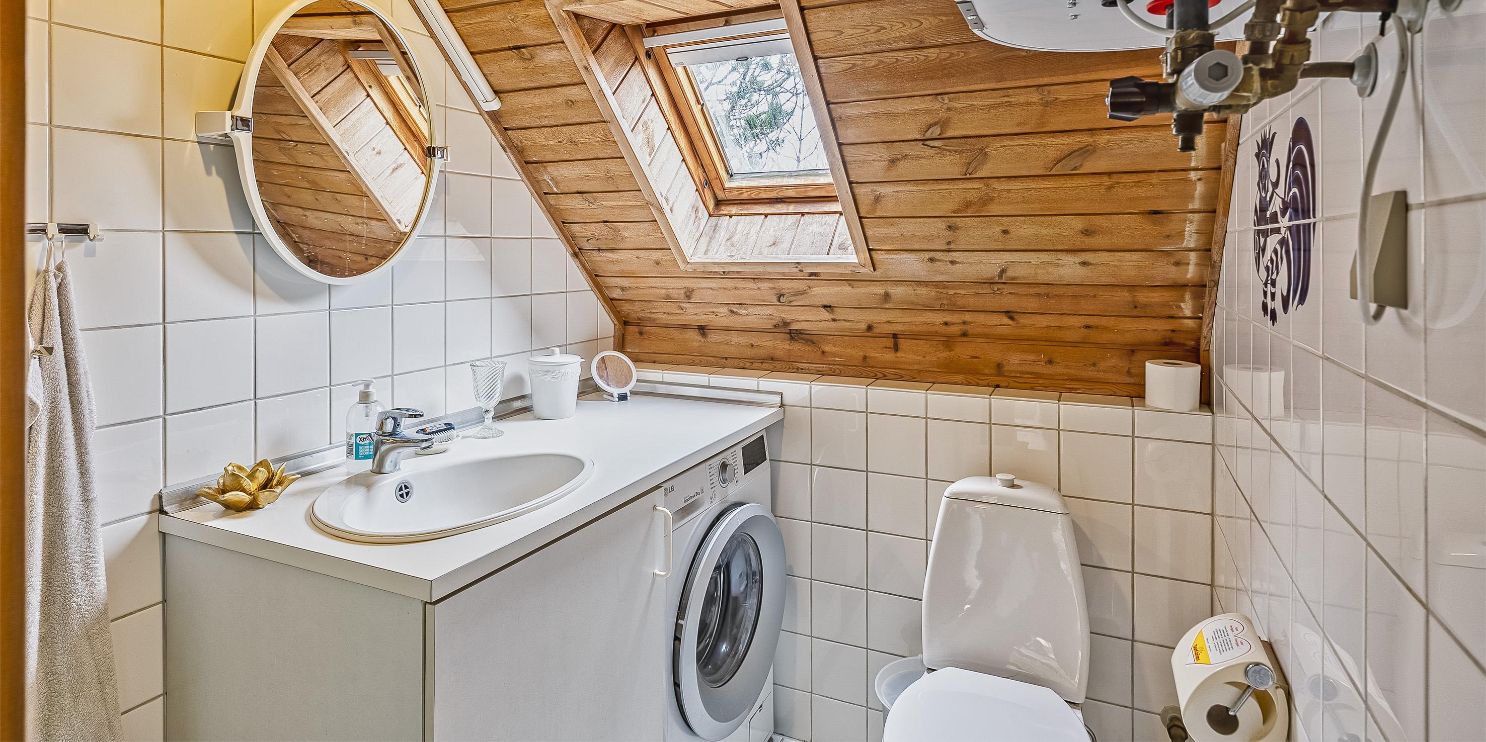 Bad med toilet, bruser og vask