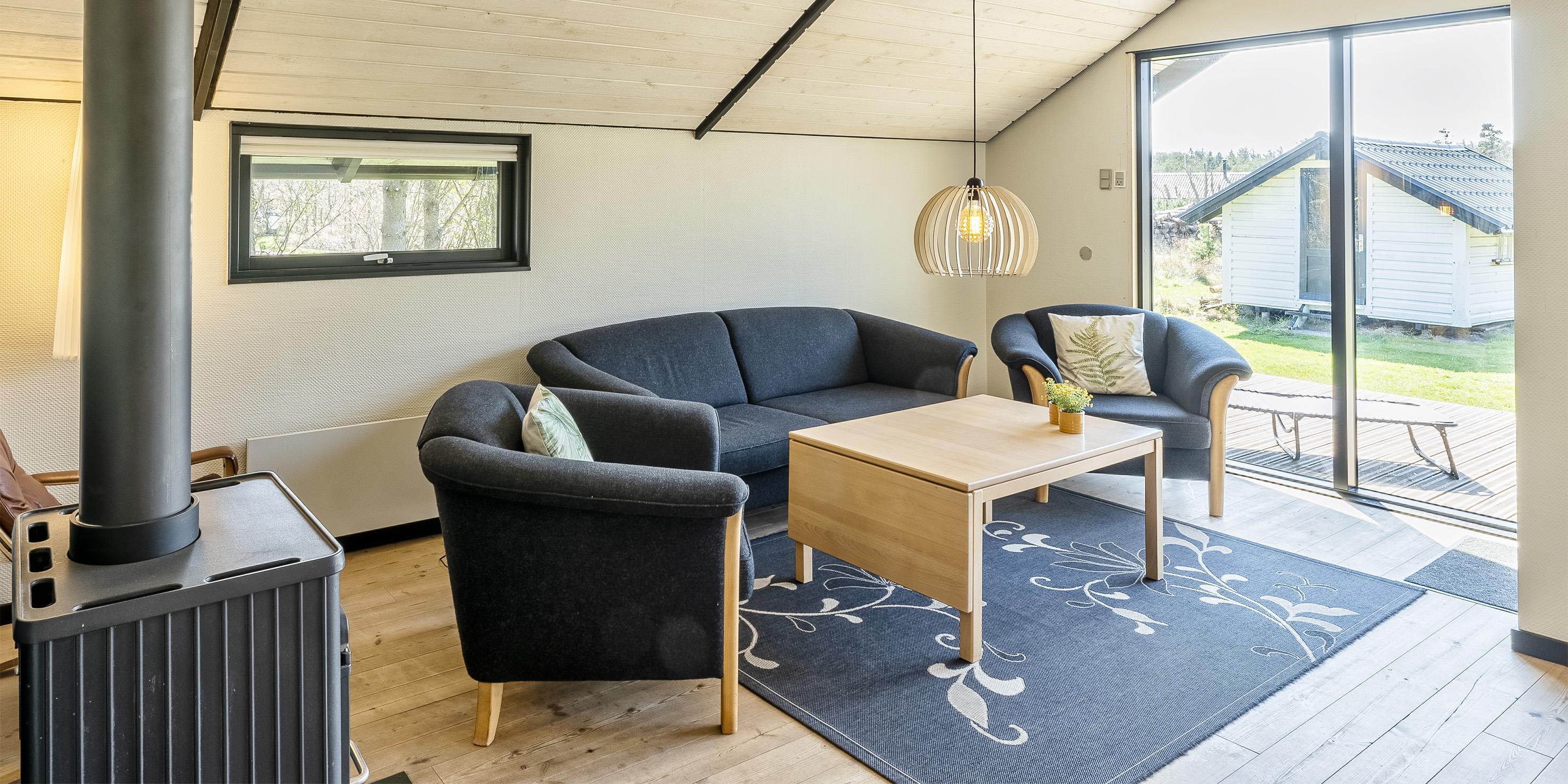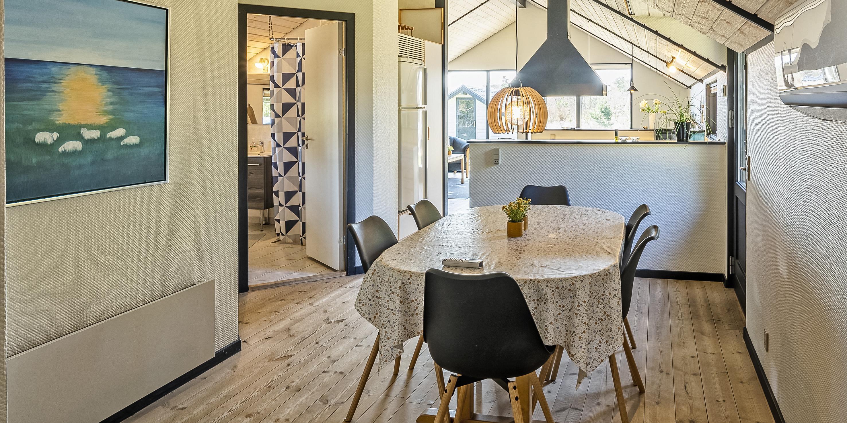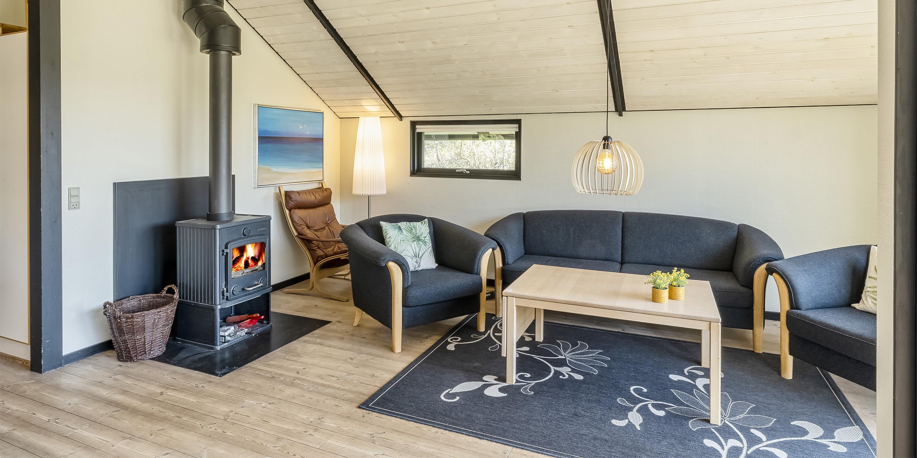 Huset er personligt indrettet og har fornyelig gennemgået en udskiftning af møblement (2020). Huset indeholder indgang med garderobe i åben forbindelse med spisestue. Lyst køkken med opvaskemaskine, mikroovn, køle-/fryseskab, emhætte og komfur. Stort opholdsrum med åbent til kip, hyggelig brændeovn, varmepumpe, sofahjørne med fjernsyn med parabol programmer og Boxer TV, trådløs Internet samt udsigt til terrassen. Fra spisestuen er der adgang til badeværelse med bruser, toilet og vask samt til stort soveværelse med dobbeltseng. Fordelingsgang med 2 gode soveværelser samt adgang til gæstetoilet med bruser. Det ene soveværelse med en dobbeltseng og det andet med to enkeltsenge. Der forefindes vaskemaskine og kummefryser i huset. Der er udgang til terrasserne fra stuen, spisestuen og fordelingsgangen. Rummene i huset er lyse og har et godt lysindfald fra vinduerne. 3 soveværelser: DS + DS + 2S.