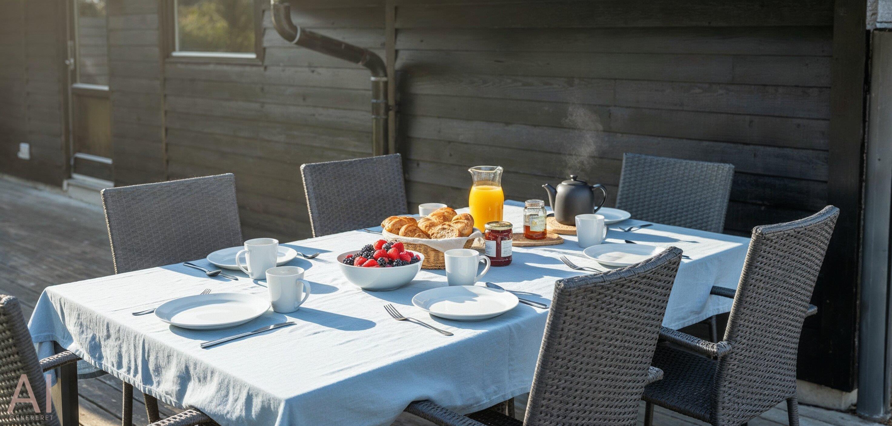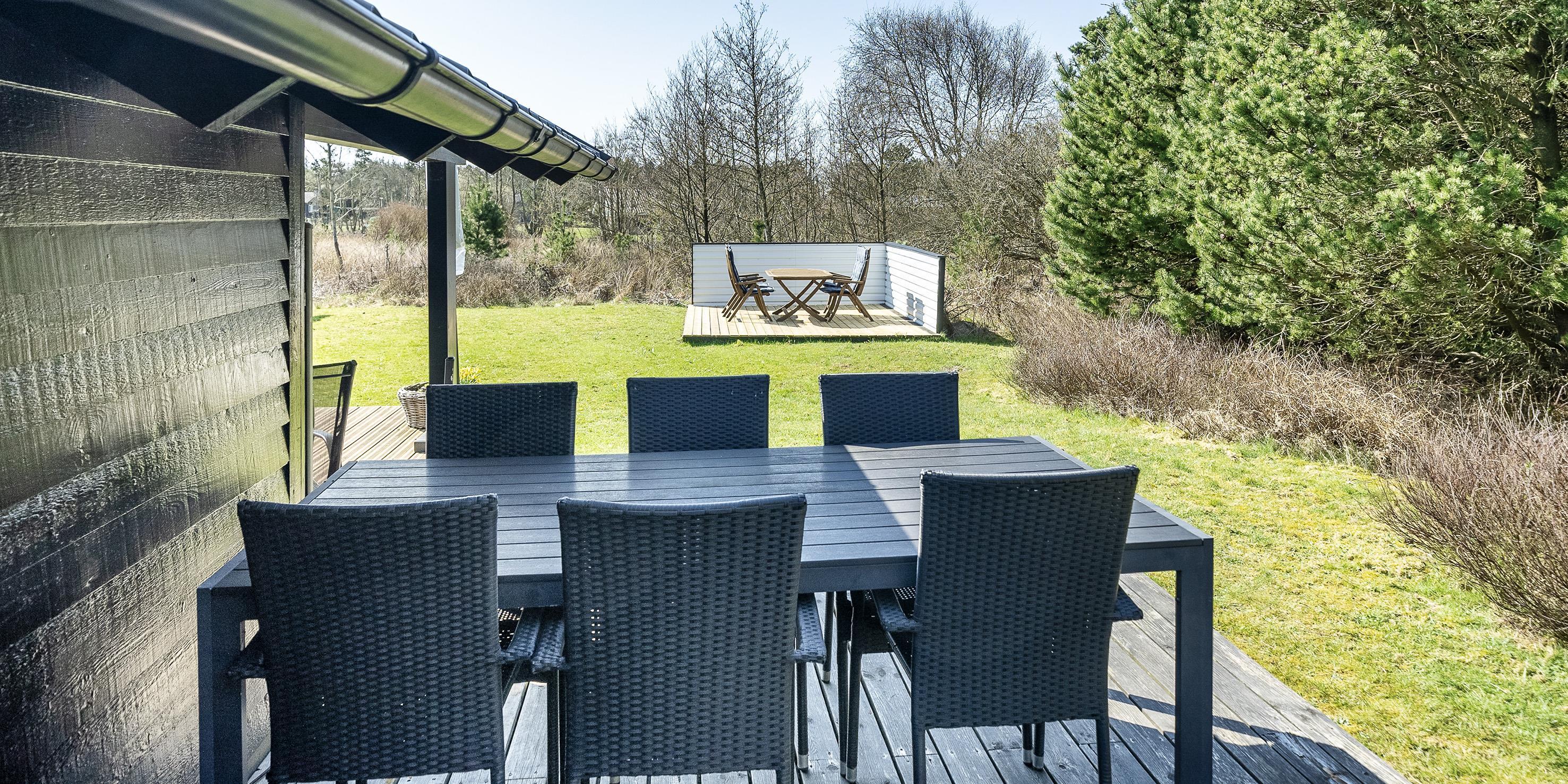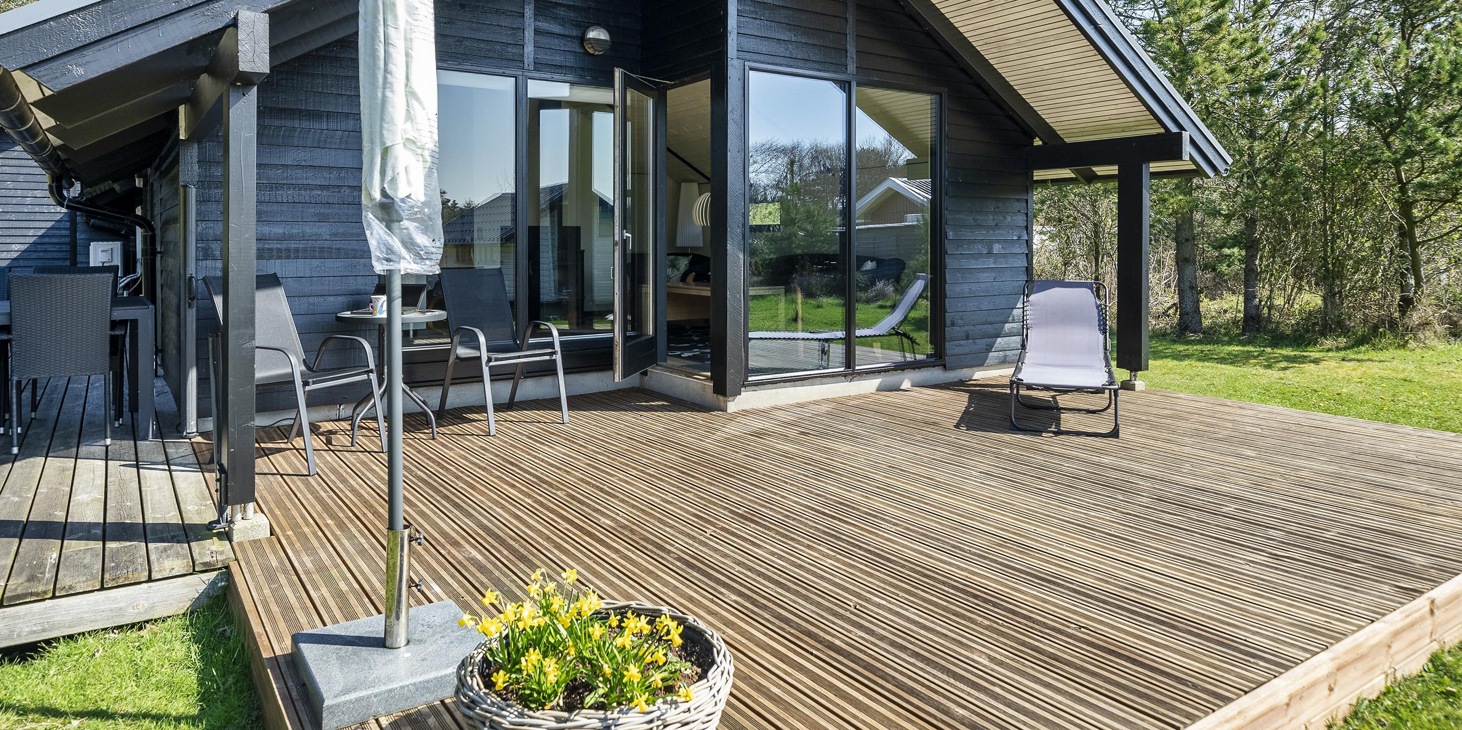 Huset er omgivet af flere træterrasser, hvor der året rundt er mulighed for at finde en læ krog, hvorfra naturen og solen kan nydes i fulde drag. En af træterrasserne er overdækket.