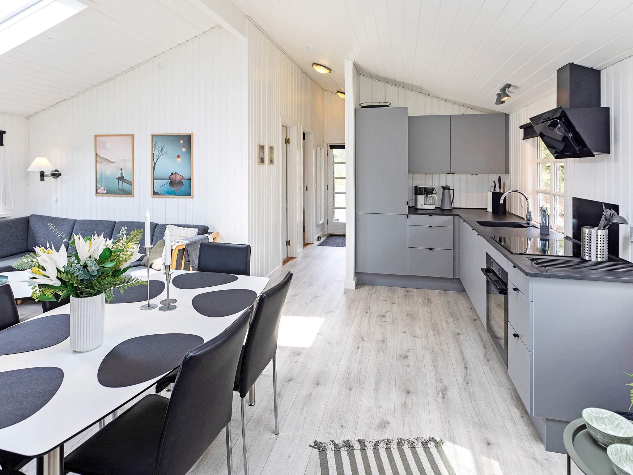 Indenfor byder feriehuset på en lys og indbydende opholdsstue med brændeovn og fjernsyn med Chromecast, hvilket gør det perfekt til familiesammenkomster eller afslappende aftener. Det åbne layout giver rigelig plads til socialt samvær, spisning og familieliv. Ejendommen omfatter tre komfortable soveværelser og et badeværelse, der kan rumme op til seks personer.