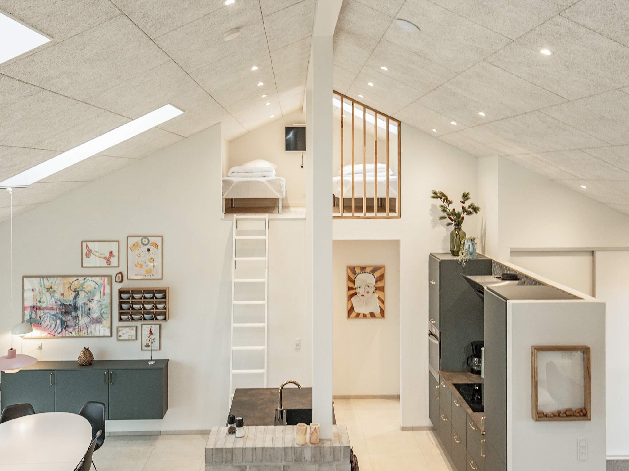 Hjertet i sommerhuset er en stor åben stue med god akustik i forbindelse med det veludstyrede køkken. Der er plads til, at alle kan mødes og nyde madlavning, måltider, spil, en god film eller hvad der ellers passer dig. Rummet har flere vinduer og ovenlys, der lader det fascinerende nordjyske lys strømme ind, og på varme dage kan du åbne ud til den dejlige træterrasse.