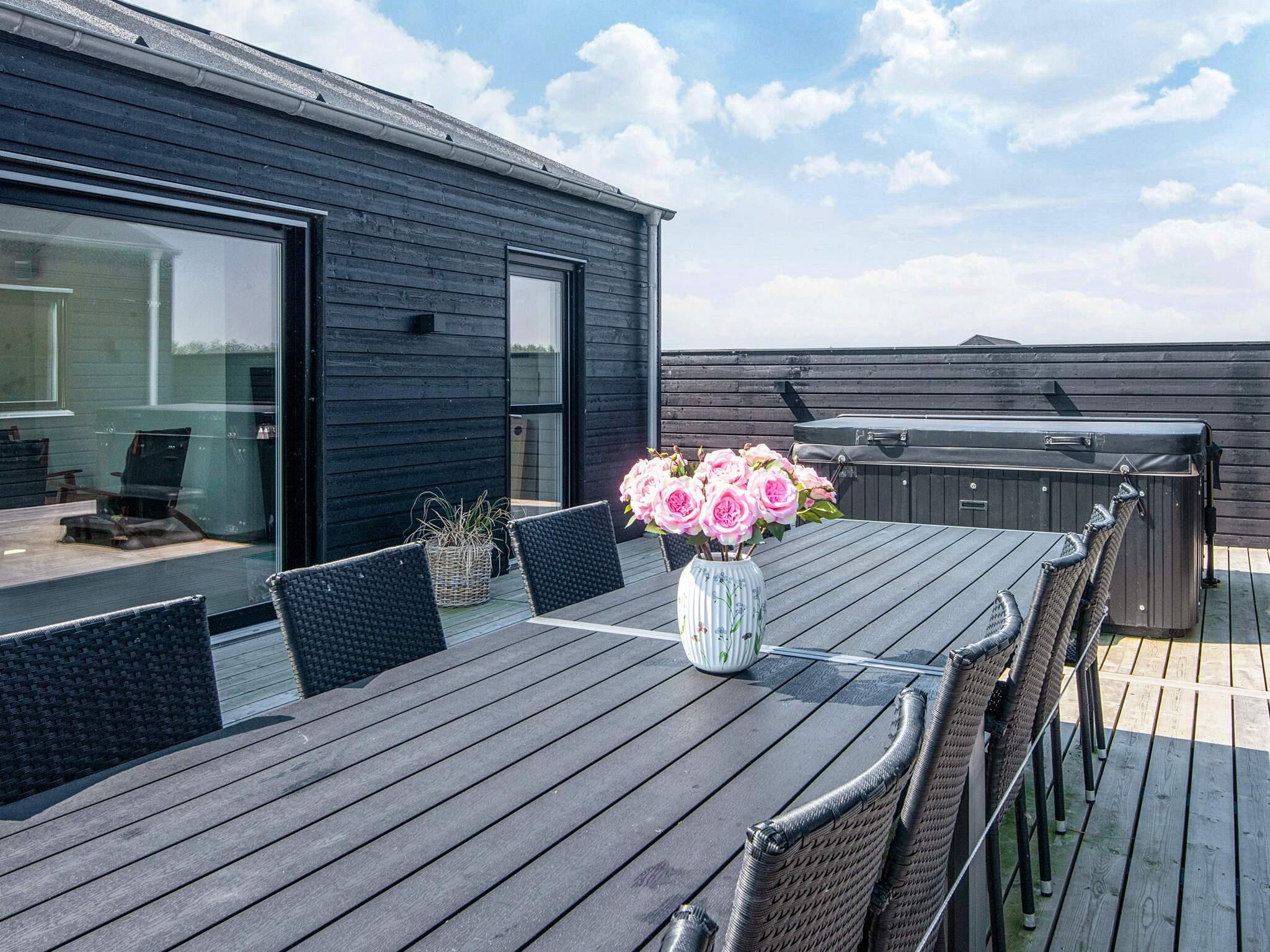 Der er både udendørs bruser med koldt og varmt vand og spabad på terrassen, så du kan se frem til en rigtig wellness-session under åben himmel. På den store terrasse, der forbinder sommerhuset og annekset, har I også god plads til at slappe af og nyde sommervejret samt freden og roen på den store grund med udsigt over markerne. Og ingen naboer til at forstyrre dig. Der er også en havegrill. Ikke tilgængelig for udlejning til ungdomsgrupper. Gratis adgang til badelandet i Blokhus.