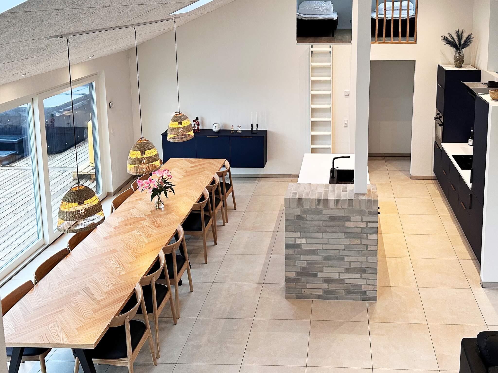 Nybygget (2023) sommerhus med spabad ved Grønhøj Strand. Feriehuset er smagfuldt indrettet og omfatter aktivitetsrum og udendørs spabad. Vil du have noget ud over det sædvanlige, er dette moderne hus et nærmere kig værd. Der er masser af plads, sjove aktiviteter og højt til loftet for hele familien eller flere familier, der gerne vil afsted sammen. Hjertet i sommerhuset er en stor åben stue med god akustik i forbindelse med det veludstyrede køkken. Der er plads til, at alle kan mødes og nyde madlavning, måltider, spil, en god film eller hvad der ellers passer dig. Rummet har flere vinduer og ovenlys, der lader det fascinerende nordjyske lys strømme ind, og på varme dage kan du åbne op til den dejlige træterrasse. Feriehuset er udstyret med gulvvarme og varmepumpe. Der er Sonos højtaler i huset og annekset, der kan tilgåes via internettet i huset.