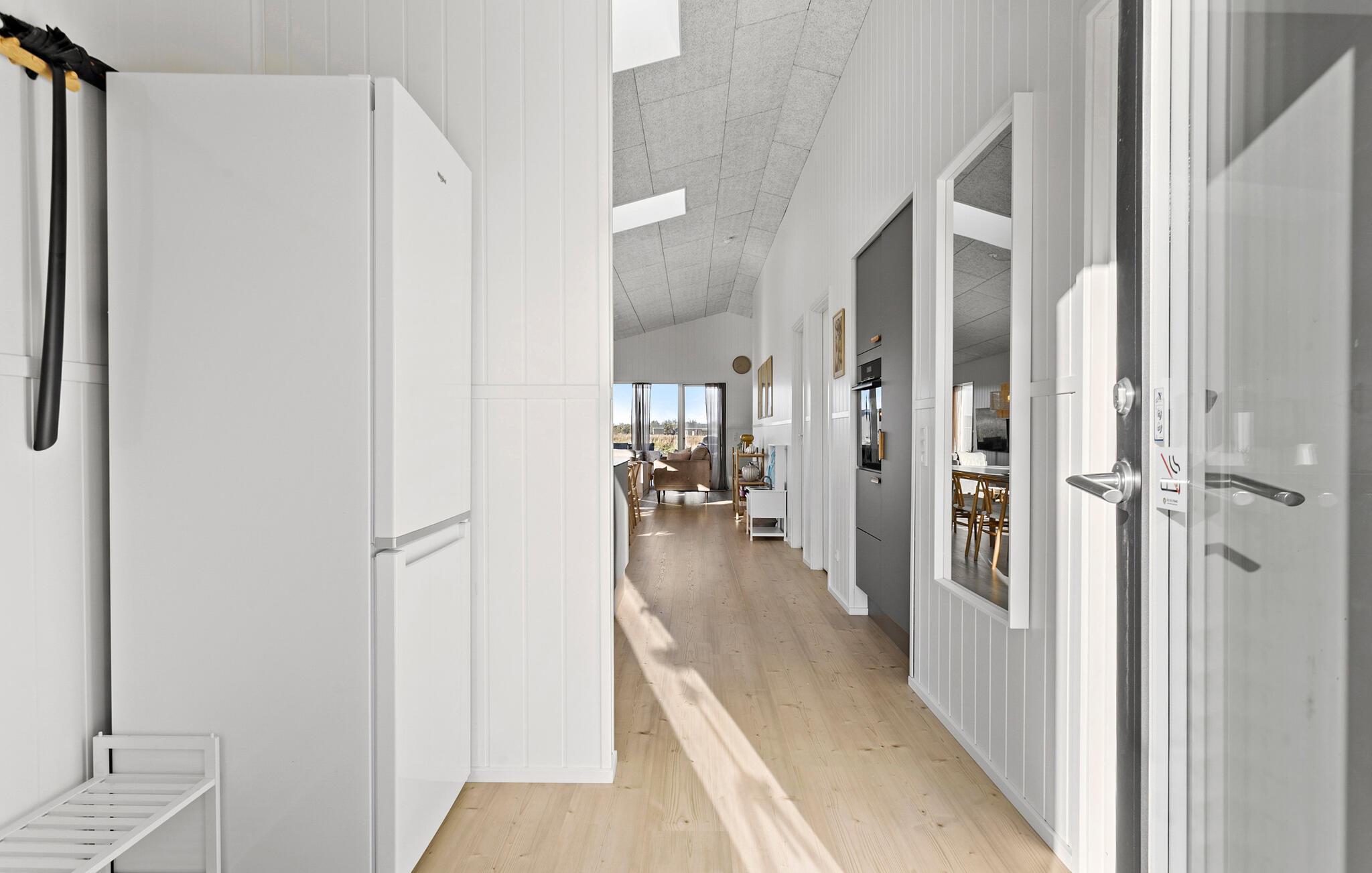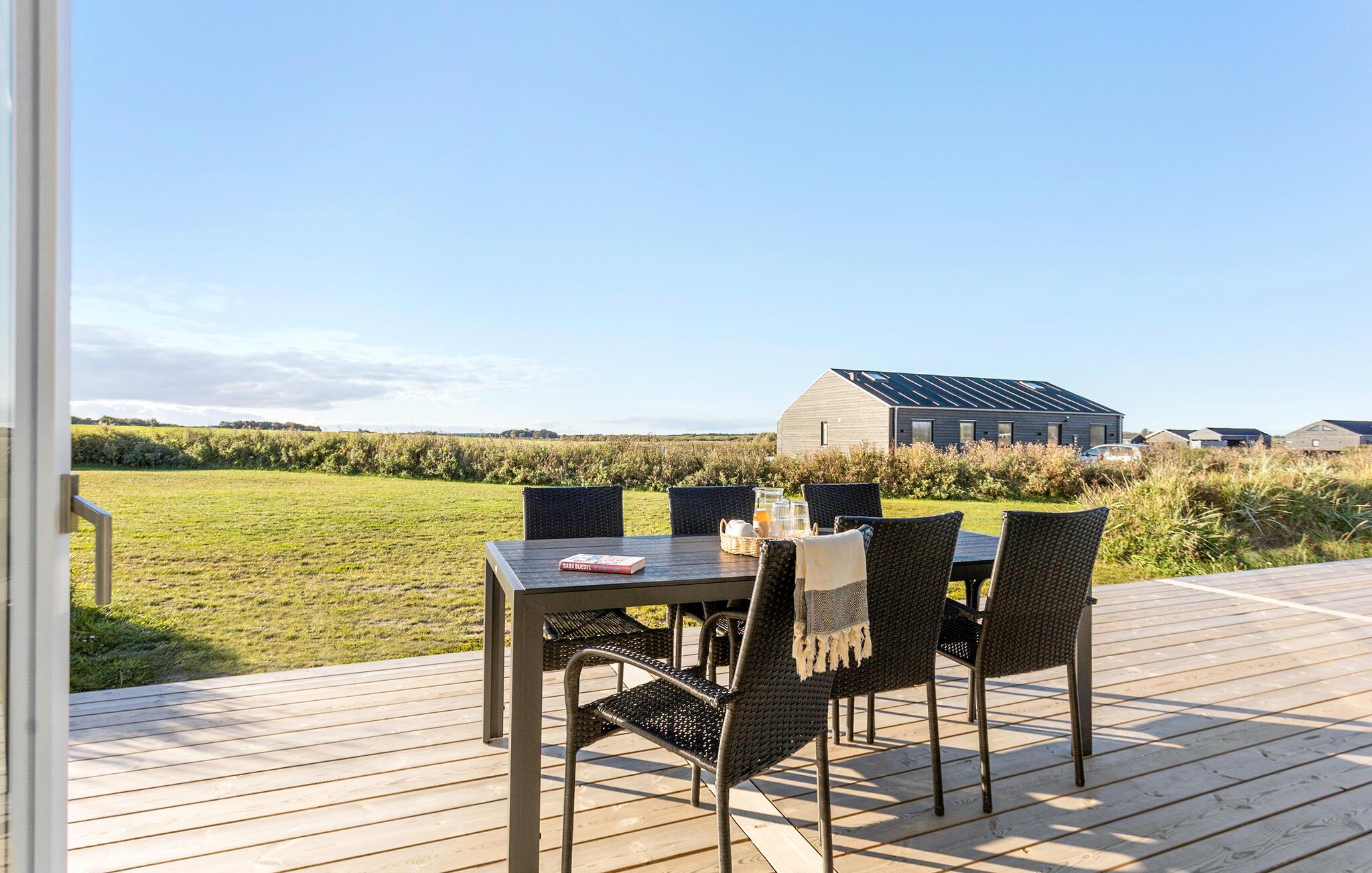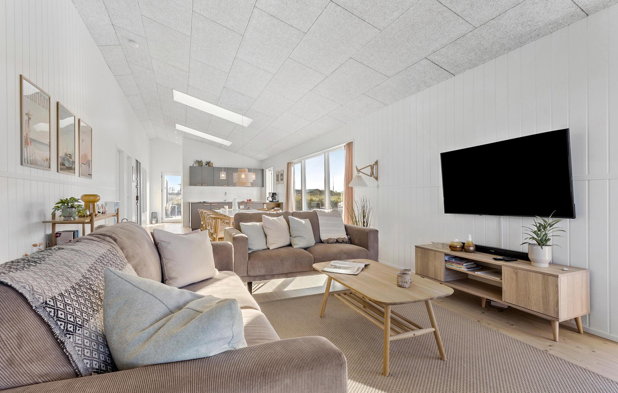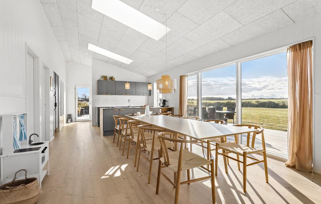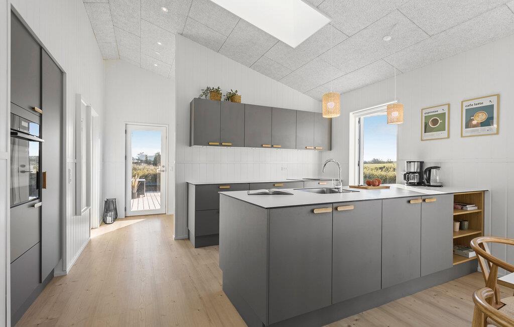 Jeres rummelige sommerhus ved Løkken Strand, med plads til mindst to familier, tilbyder jer den ideelle blanding af komfort og skandinavisk hygge. Start dagen afslappet med en hyggelig morgenmad ved det rummelige spisebord af træ, mens I lader blikket glide ud gennem de store vinduer til den omkringliggende natur. Eller nyd jeres måltider udendørs på den rummelige terrasse, som med det beskyttende trætag er ideel selv i omskifteligt vejr. I det åbne, moderne køkken kan I let tilberede jeres måltider.