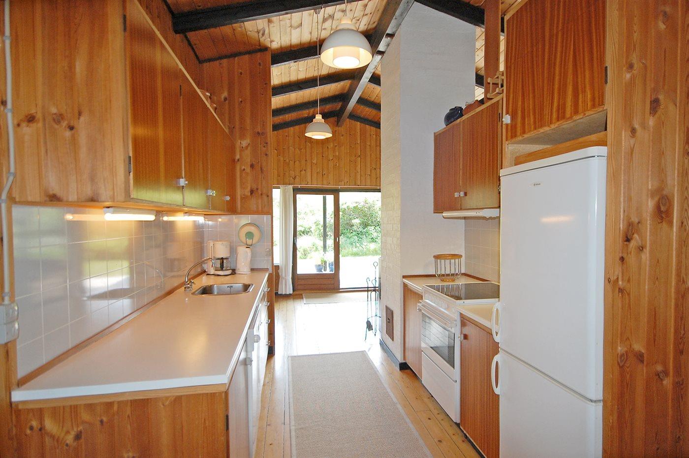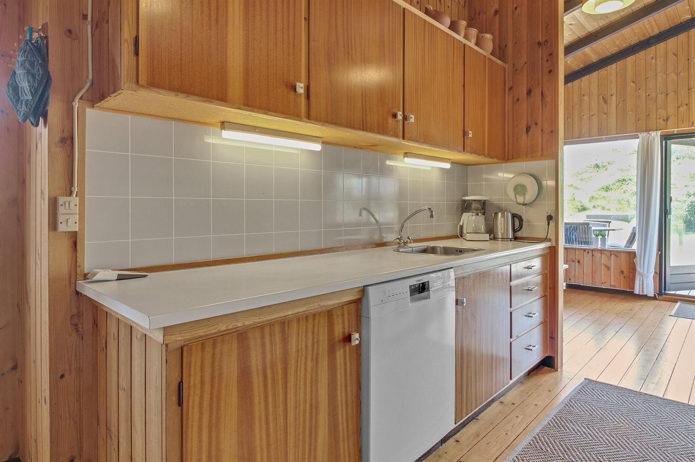 Køkkenet er udstyret med 1 køleskab. Der er 4 keramiske kogeplader, varmluftovn, mikrobølgeovn samt opvaskemaskine.