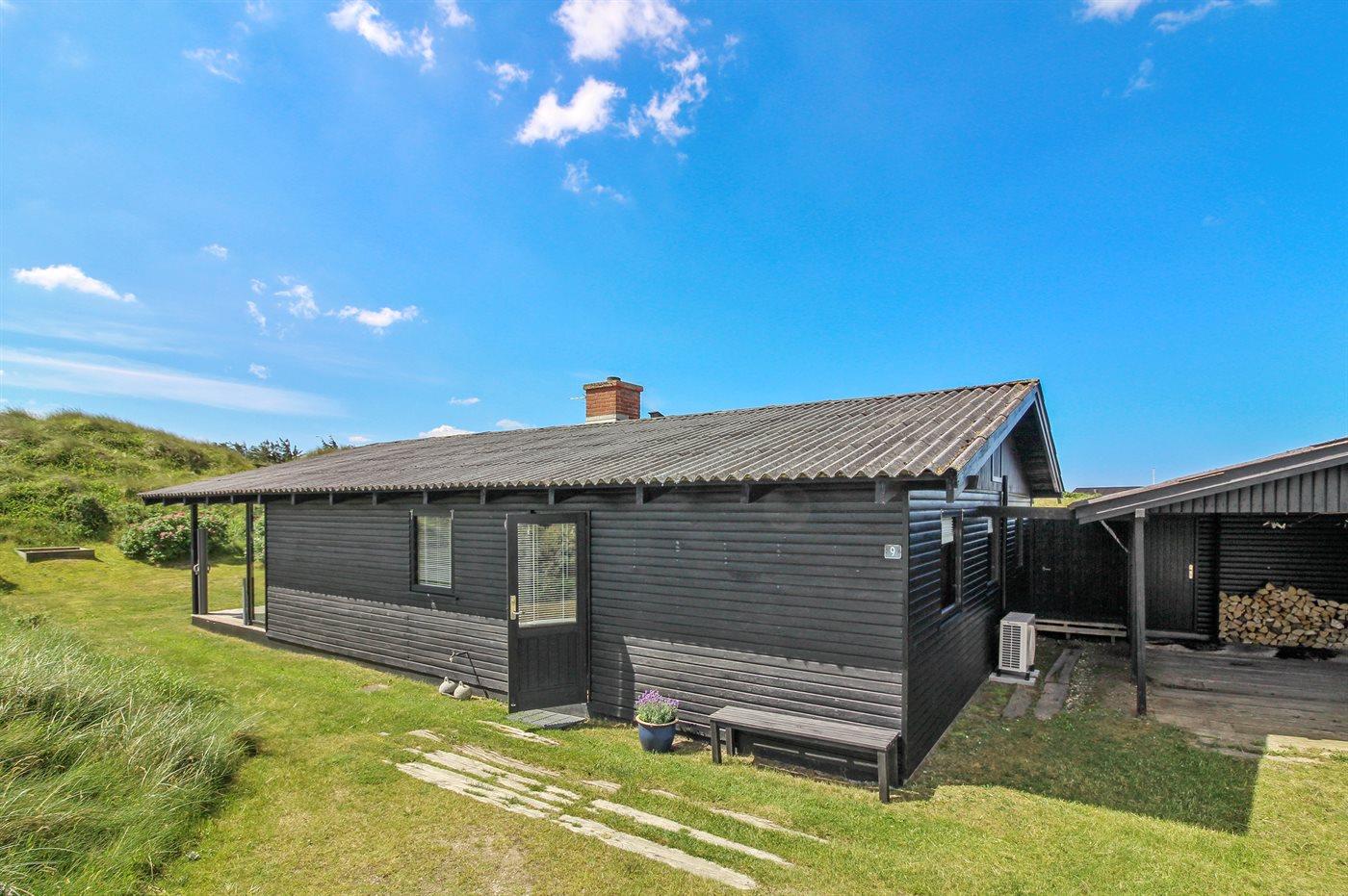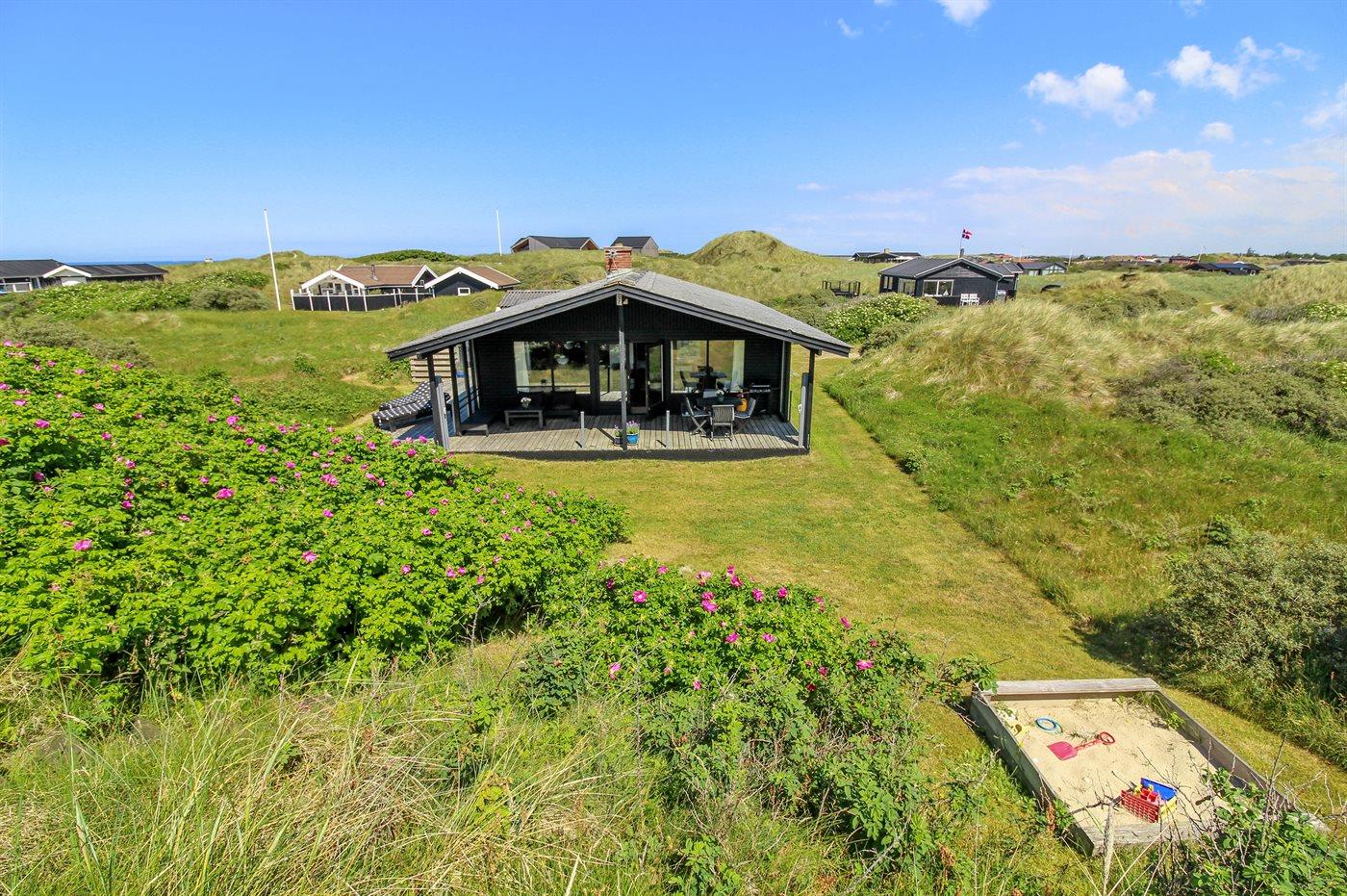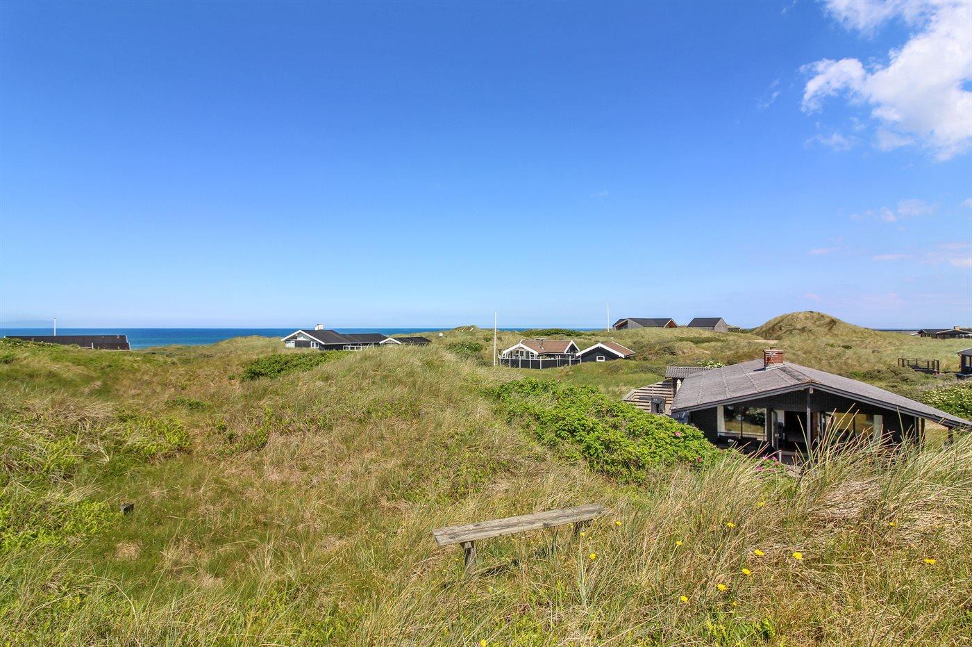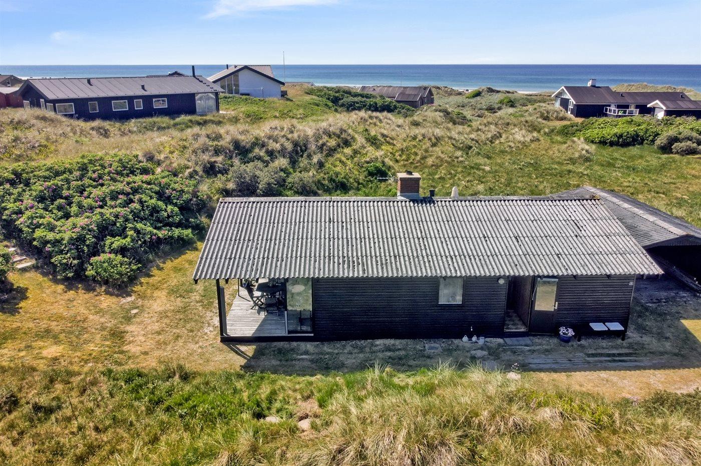 Særdeles velbeliggende for enden af en lukket vej ligger dette hyggelige sommerhus på en kuperet klitgrund med udsigt til Vesterhavet fra såvel hus som grund.