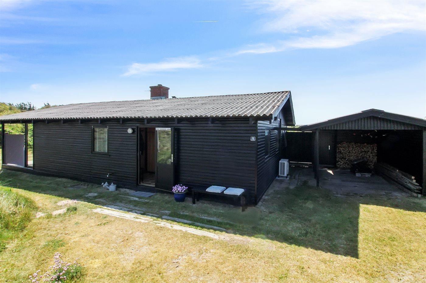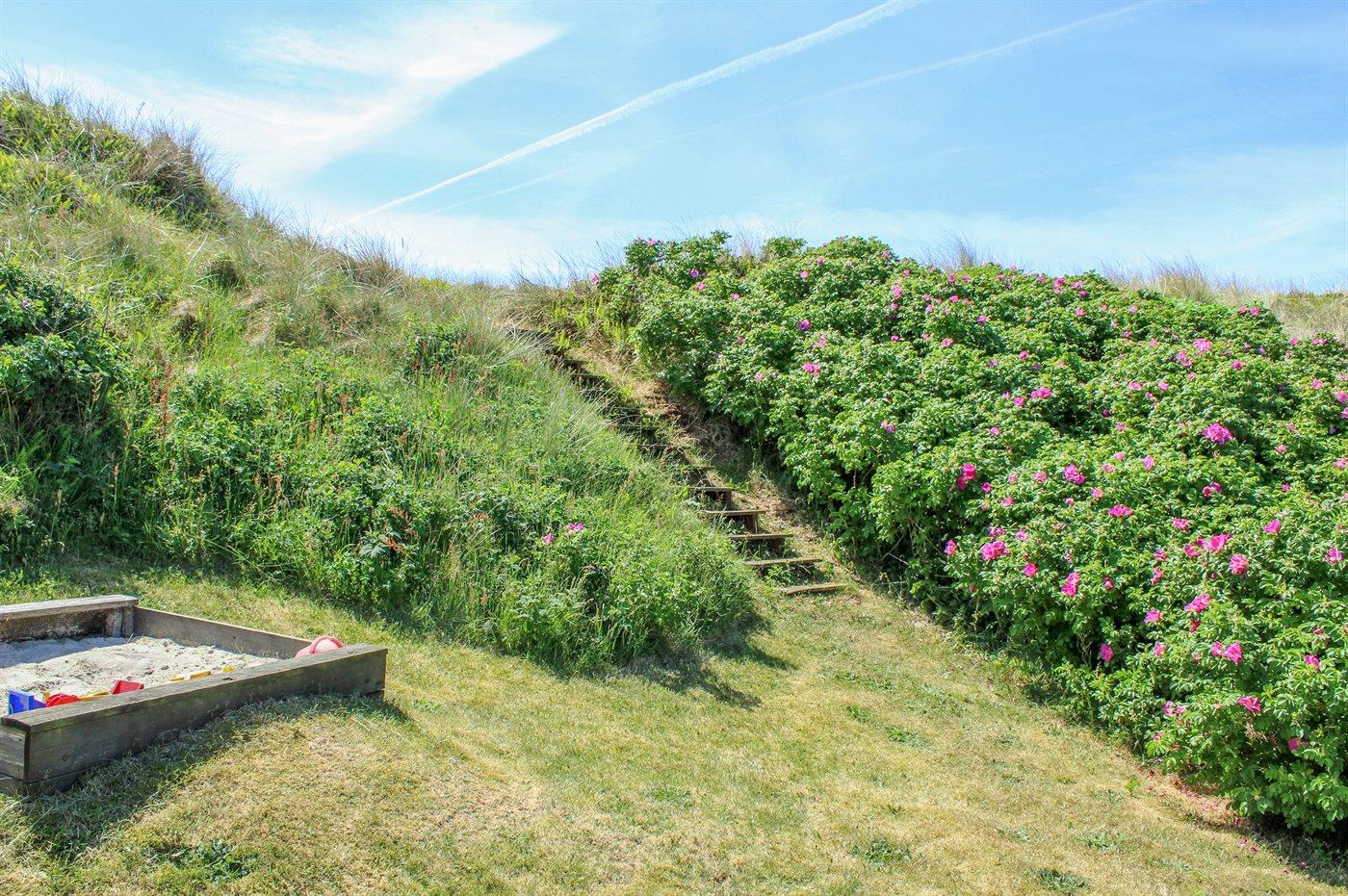 Ferieboligen er beliggende på en 2500 m² stor klitgrund. Der er 300 m til havet. Nærmeste forretning er beliggende i en afstand af 800 m. Til ferieboligen hører 45 m² terrasseareal. Desuden er der 24 m² overdækket terrasse. Der er redskabsrum. Sandkasse. Grill til rådighed. Der er carport til rådighed. Parkering ved ferieboligen.